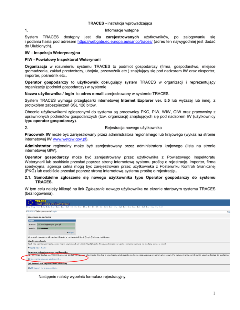 TRACES - instrukcja wprowadzająca Informacje wstępne 1. System TRACES dostępny jest dla zarejestrowanych użytkowników, po zalogowaniu się i podaniu hasła pod adresem https://webgate.ec.europa.eu/sanco/traces/ (adres ten najwygodniej jest dodać do Ulubionych). IW – Inspekcja Weterynaryjna PIW - Powiatowy Inspektorat Weterynarii Organizacja w rozumieniu systemu TRACES to podmiot gospodarczy (firma, gospodarstwo, miejsce gromadzenia, zakład przetwórczy, ubojnia, przewoźnik etc.) znajdujący się pod nadzorem IW oraz eksporter, importer, pośrednik etc.. Operator gospodarczy to użytkownik obsługujący system TRACES w organizacji i reprezentujący organizację (podmiot gospodarczy) w systemie Nazwa użytkownika / login to adres e-mail zarejestrowany w systemie TRACES. System TRACES wymaga przeglądarki internetowej Internet Explorer ver. 5.5 lub wyższej lub innej, z protokółem zabezpieczeń SSL 128 bitów. Obecnie użytkownikami zgłoszonymi do systemu są pracownicy PKG, PIW, WIW, GIW oraz pracownicy z uprawnionych podmiotów gospodarczych (tzw. organizacji) znajdujących się pod nadzorem IW (użytkownicy typu operator gospodarczy). 2. Rejestracja nowego użytkownika Pracownik IW może być zarejestrowany przez administratora regionalnego lub krajowego (wykaz na stronie internetowej IW www.wetgiw.gov.pl). Administrator regionalny może być zarejestrowany przez administratora krajowego (lista na stronie internetowej GIW). Operator gospodarczy może być zarejestrowany przez użytkownika z Powiatowego Inspektoratu Weterynarii lub osobiście przesłać poprzez stronę internetową systemu prośbę o rejestrację. Importer, firma spedycyjna, agencja celna mogą być zarejestrowani przez użytkownika z Posterunku Kontroli Granicznej (PKG) lub osobiście przesłać poprzez stronę internetową systemu prośbę o rejestrację.. 2.1. Samodzielne zgłoszenie się nowego użytkownika typu Operator gospodarczy do systemu TRACES. W tym celu należy kliknąć na link Zgłoszenie nowego użytkownika na ekranie startowym systemu TRACES (bez logowania). Następnie należy wypełnić formularz rejestracyjny. 1 Informacja o zgłoszeniu się kandydata na użytkownika reprezentującego podmiot gospodarczy trafi do PIW. Obowiązkiem PIW jest sprawdzenie podanych w formularzu danych i zatwierdzenie operatora gospodarczego jako użytkownika systemu TRACES lub usunięcie formularza i nie dopuszczenie kandydata do obsługi systemu TRACES. Po zarejestrowaniu użytkownika system TRACES automatycznie wysyła na zarejestrowany adres email nowego użytkownika jednorazowe hasło (także po każdym kliknięciu na Wyślij hasło). Hasło to należy przy pierwszym logowaniu zmienić na nowe, własne 10-znakowe, zgodne z obowiązującymi zasadami – dokument zasady-dostepu-do-TRACES-haslowanie.doc do pobrania ze strony internetowej IW. Poniżej przykładowy e-mail z hasłem otrzymanym od systemu TRACES. Należy kliknąć na link „Tu kliknij”, aby wejść na stronę logowania. 2 Jeśli przed wyświetleniem strony systemu TRACES pojawi się okno „Alert zabezpieczeń”, klikamy przycisk „TAK” Następnie w oknie logowania wpisujemy zarejestrowany adres e-mail oraz hasło, które dostaliśmy od nadawcy [email protected] i klikamy na Login Podczas pierwszego logowania system wymaga od użytkownika zmiany hasła na nowe, własne, co najmniej 10-znakowe, spełniające warunki określone w dokumencie zasady-dostepu-do-TRACEShaslowanie.doc do pobrania ze strony internetowej IW. Hasło wpisujemy w polu „Nowe hasło” i ponownie w „Potwierdź nowe hasło” – następnie klikamy na „Zmień” 3 System wymaga wybrania pytania sprawdzającego oraz podania na nie odpowiedzi (aby nie obciążać pamięci wygodnie jest wybrać 1-sze proponowane pytanie i wpisać 3 takie same znaki np. aaa). Pytanie sprawdzające i odpowiedź muszą być podane przez użytkownika przy każdej prośbie o wysłanie nowego hasła (resetowanie hasła). Po zmianie hasła mamy dostęp do Menu Głównego programu. 4 3. LOGOWANIE i korzystanie z systemu. Wszyscy użytkownicy, którzy chcą korzystać z systemu TRACES, każdorazowo muszą się zalogować tzn. wpisać zarejestrowany wcześniej w systemie adres e-mail oraz hasło. Ze względu na integralność, poufność i odpowiedzialność, dostęp do aplikacji TRACES mogą mieć tylko uprawnieni i zidentyfikowani użytkownicy. Sposób postępowania: 1. Uruchomić Internet Explorer 5.5 lub inną przeglądarkę internetową z protokółem SSL 128. 2. Wpisać adres https://webgate.ec.europa.eu/sanco/traces/ (przy otwartej stronie dobrze jest zapisać adres do Ulubionych). 3. Jeśli przed wyświetleniem strony systemu TRACES pojawi się okno „Alert zabezpieczeń”, klikamy przycisk „TAK” 4. W oknie logowania aplikacji TRACES, należy wpisać adres e-mail użytkownika oraz hasło i kliknąć na Login 5. W przypadku zapomnienia hasła należy kliknąć Wyślij nowe hasło (patrz dokument zasadydostepu-do-TRACES-haslowanie.doc). Hasło zostanie przesłane na podany powyżej, zarejestrowany w systemie adres e-mail, ale system wymaga wybrania pytania sprawdzającego oraz podania na nie odpowiedzi (aby nie obciążać pamięci wygodnie jest wybrać 1-sze proponowane pytanie i wpisać 3 takie same znaki np. aaa). 5 Uwaga!!! 4-krotne podanie błędnego hasła powoduje zablokowanie konta i konieczne jest odblokowanie dostępu przez administratora regionalnego lub krajowego (telefony i e-maile kontaktowe znajdują się na stronie internetowej GIW). Uwaga!!! Jeśli użytkownik nie logował się przez 3 miesiące zostaje automatycznie unieaktywniony przez system i konieczne jest uaktywnienie dostępu przez administratora regionalnego lub krajowego. 6. Po zalogowaniu się w prawym górnym rogu ekranu pojawi się nazwa użytkownika. 7. Zalogowany użytkownik może przystąpić do wpisywania nowych świadectw zdrowia w obrocie wewnątrzwspólnotowym oraz CVED-ów albo do przeglądania świ