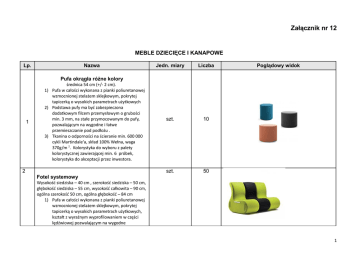 Załącznik nr 12 MEBLE DZIECIĘCE I KANAPOWE Lp. Nazwa Jedn. miary Liczba szt. 10 szt. 50 Poglądowy widok Pufa okrągła różne kolory 1 średnica 54 cm (+/- 2 cm). 1) Pufa w całości wykonana z pianki poliuretanowej wzmocnionej stelażem sklejkowym, pokrytej tapicerką o wysokich parametrach użytkowych 2) Podstawa pufy ma być zabezpieczona dodatkowym filcem przemysłowym o grubości min. 3 mm, na stałe przymocowanym do pufy, pozwalającym na wygodne i łatwe przemieszczanie pod podłożu . 3) Tkanina o odporności na ścieranie min. 600 000 cykli Martindale'a, skład 100% Wełna, waga 370g/m 2. Kolorystyka do wyboru z palety kolorystycznej zawierającej min. 6 próbek, kolorystyka do akceptacji przez inwestora. 2 Fotel systemowy Wysokość siedziska – 40 cm , szerokość siedziska – 50 cm, głębokość siedziska – 55 cm, wysokość całkowita – 90 cm, ogólna szerokość 50 cm, ogólna głębokość – 84 cm 1) Pufa w całości wykonana z pianki poliuretanowej wzmocnionej stelażem sklejkowym, pokrytej tapicerką o wysokich parametrach użytkowych, kształt z wyraźnym wyprofilowaniem w części lędźwiowej pozwalającym na wygodne 1 użytkowanie. 2) Boki pufy wyposażone w wzmocnione kieszenie pozwalające na przechowywanie np. prasy oraz kieszenie na łączniki (spinacze). 3) Podstawa pufy ma być zabezpieczona dodatkowym filcem przemysłowym o grubości min. 3 mm, na stałe przymocowanym do pufy, pozwalającym na wygodne i łatwe przemieszczanie pod podłożu . 4) Łączniki wykonane z prętu stalowego chromowanego w kształcie spinacza biurowego pozwalającego na łączenie pojedynczych puf w ciągi siedzisk. 5) Tkanina o odporności na ścieranie min. 100.000 cykli Martindale'a, skład 100% Polyester, waga 310g/m 2. Kolorystyka do wyboru z palety kolorystycznej zawierającej min. 8 próbek, w tym czarny, popielaty, pomarańczowy, kolorystyka do akceptacji przez inwestora. 6) Wymagane atesty i dokumenty, które należy złożyć wraz z ofertą: a) atest wytrzymałości zgodnie z obowiązującymi normami w zakresie bezpieczeństwa użytkowania, wytrzymałości i trwałości b) atest z badań wytrzymałości tapicerki na ścieranie min 50000 cykli. 2 Sofa dziecięca 3 nierozkładana, brak ostrych i twardych obrzeży 1) wymiary.: dł. 95 x szer. 55 x wys. 75 cm. (+/- 2 cm), Tkanina o odporności na ścieranie min. 100.000 cykli Martindale'a, skład 100% Polyester, waga 310g/m 2. Kolorystyka do wyboru z palety kolorystycznej zawierającej min. 6 próbek, w tym niebieski, żółty, popielaty, pomarańczowy, kolorystyka do akceptacji przez inwestora. szt. 2 szt. 2 szt. 10 Stolik dziecięcy 4 Stolik dziecięcy okrągły różne kolory tworzywo polipropylenowe średnica: 85 cm, wysokość: 48 cm (+/- 2 cm), Krzesełko dziecięce 5 Krzesełko dziecięce różne kolory, tworzywo polipropylenowe szerokość: 39 cm,(+/- 1 cm), wysokość: 67 cm(+/- 1 cm), głębokość siedziska: 26 cm,(+/- 1 cm), wysokość siedziska: 30 cm (+/- 1 cm), 3