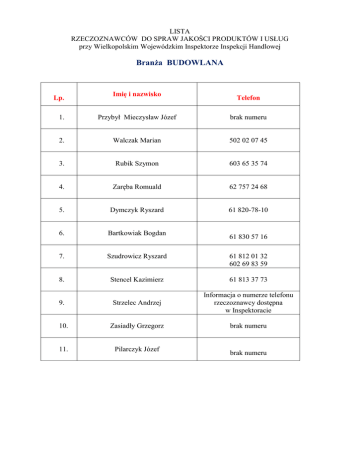 LISTA RZECZOZNAWCÓW DO SPRAW JAKOŚCI PRODUKTÓW I USŁUG przy Wielkopolskim Wojewódzkim Inspektorze Inspekcji Handlowej Branża BUDOWLANA Lp. Imię i nazwisko Telefon 1. Przybył Mieczysław Józef brak numeru 2. Walczak Marian 502 02 07 45 3. Rubik Szymon 603 65 35 74 4. Zaręba Romuald 62 757 24 68 5. Dymczyk Ryszard 61 820-78-10 6. Bartkowiak Bogdan 7. Szudrowicz Ryszard 61 812 01 32 602 69 83 59 8. Stencel Kazimierz 61 813 37 73 9. Strzelec Andrzej Informacja o numerze telefonu rzeczoznawcy dostępna w Inspektoracie 10. Zasiadły Grzegorz brak numeru 11. Pilarczyk Józef 61 830 57 16 brak numeru 12. Ślusarski Jan brak numeru 13. Dejneka Józef 63 242 04 32 505 31 40 03 14. Potrzebski Dariusz Informacja o numerze telefonu rzeczoznawcy dostępna w Inspektoracie 15. Stawiarski Przemysław 603 32 4300 16. Kubacki Gabriel 602 409 892 17. Dr inż. Przemysław Stawiarski x Aktualizacja M.M. 603 324 300 [email protected] [email protected] 03-04-2013