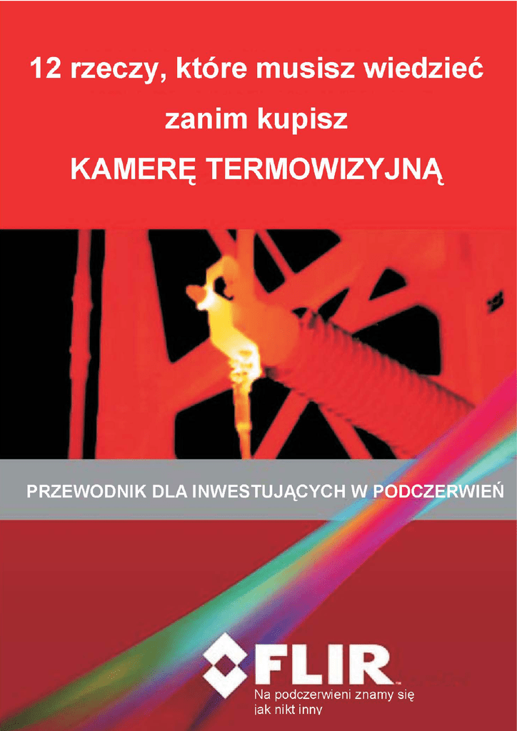 12 rzeczy, które musisz wiedzieć zanim kupisz kamerę termowizyjną Przy zakupie kamery termowizyjnej różni nabywcy kierują się różnymi kryteriami. Dla jednych, decydującą rolę będą odgrywały koszty, podczas gdy dla innych, ważniejsza może okazać się możliwość rozwoju kariery zawodowej poprzez certyfikowane szkolenie. Większości zależy jednak najbardziej na wysokiej jakości i funkcjonalności. Niemal wszyscy boją się jednak dokonać niewłaściwego wyboru, by nie pozostać z kamerą termowizyjną, która jest zbyt ciężka, lub zbyt trudna w użyciu. My, we FLIR, pragniemy Twojego sukcesu. Jeszcze w połowie lat 60 wypuściliśmy na rynek pierwszą kamerę termowizyjną do zastosowań komercyjnych. To my wynaleźliśmy ten rynek. Możesz więc być pewny, że nasza broszura pomoże Ci wybrać najlepszą kamerę termowizyjną! Ponieważ jesteśmy największym na świecie producentem kamer termowizyjnych i prowadzimy największą na świecie organizację szkoleniową – centrum szkolenia podczerwieni Infrared Training Center (ITC) – wiemy o podczerwieni to i owo. Oto „12 rzeczy…” które z pewnością Ci pomogą. Prosimy o zwrócenie uwagi, że używamy terminu „kamera termowizyjna”, lecz równie dobrze możemy użyć pojęcia „kamera na podczerwień” ponieważ oba terminy są równoważne. Jeżeli będziesz miał jakiekolwiek pytania co do prezentowanej niżej treści, lub zechcesz dowiedzieć się jaka kamera byłaby dla Ciebie najlepsza, zadzwoń pod (22 849 71 90). 2 Punkt 1: Kup kamerę, która daje precyzyjne, powtarzalne odczyty. Być może brzmi to jak rzecz oczywista, ale nawet, jeśli wszyscy wiemy iż „Caveat emptor” – tzn. „kliencie, miej się na baczności” – warto o tej oczywistej rzeczy pamiętać. Wyobraź sobie, że kupiłeś kalkulator, ale od czasu do czasu, kiedy dodajesz dwa do dwóch, po naciśnięciu klawisza ze znakiem równości, na ekranie nie pojawia się czwórka! Co gorsza, kiedy kupowałeś ten kalkulator byłeś pewien, że będzie działał poprawnie i tak jak większość ludzi, nie zastanawiałeś się nad jego dokładnością. Zająłeś się więc po prostu swoimi sprawami. Jednak któregoś dnia dostałeś list z banku, że na Twoim koncie jest poważny debet. Zacząłeś od nowa sprawdzać wszystkie liczby i przy tej okazji zauważyłeś, że kalkulator co jakiś czas się myli. Pewnie, mówiąc delikatnie, nie byłbyś szczęśliwy. Co więcej, zależnie od tego, jak poważne są błędy, debet mógłby być niewielki, lub mógłbyś wpaść w niezłe tarapaty. Ujmując rzecz inaczej, podstawową rzeczą, której powinieneś wymagać od Twojej kamery termowizyjnej jest dostarczanie dokładnych, powtarzalnych wyników – podobnie jak w kalkulatorze. O jakich parametrach myślisz, zamierzając kupić kamerę termowizyjną? Po ponad 40 latach doświadczeń w tej dziedzinie FLIR dopracował się stałej, powtarzalnej dokładności, która nigdy się nie pogarsza. Jest to przemysłowy standard +/_ 2% lub 3,6°F, zależnie od tego, która wartość jest większa. Powtórzmy jeszcze raz: „plus minus dwa procenty lub 3,6 stopni Fahrenheita, zależnie od tego, która wartość jest większa.” Tak więc, jeśli kupując kamerę termowizyjną dowiadujesz się, że jej parametry to „plus minus 5% lub nieco więcej niż 3,6° F”, wówczas powinieneś z miejsca ją odłożyć i przestać myśleć o jej zakupie. 3 Dlaczego? Ponieważ kamera, która ma dokładność 5% może – podobnie jak kalkulator w naszym przykładzie – wpędzić Cię w poważne kłopoty. Twoje obrazy i pomiary temperatury będą błędne. Inna analogia, to stwierdzenie: „udało Ci się niemal wybrać właściwy numer telefonu, pomyliłeś się tylko o jedną cyfrę.” Wiesz co? Ten numer jest całkowicie błędny. Czy pamiętasz, jak wcześniej powiedzieliśmy, że podstawowym wymaganiem dotyczącym kamery termowizyjnej jest dawanie dokładnych i powtarzalnych wyników? Istnieją jednak dwa inne wymagania, aby można było spełnić to pierwsze. Aby otrzymać dokładne i powtarzalne rezultaty, trzeba do kamery wprowadzić wartość „emisyjności” (emissivity) i „temperatury odbitej” (reflected temperature), jak zaznaczono strzałką na poniższym rysunku. Nie przejmuj się, jeśli nie wiesz, co oznacza „emisyjność” lub „temperatura odbita.” Jest to zawodowy żargon. Jeśli kupisz kamerę, wkrótce będziesz z nim za pan brat. Będziemy jeszcze mówić o szkoleniach, więc nie musisz zawracać tym sobie głowy w tej chwili. 4 Wracając do naszego przykładu: nie kupiłbyś kalkulatora, który nie miałby klawisza ze znakiem „+” nawet gdyby był po bardzo okazyjnej cenie. Jeśli więc producent chce sprzedać Ci kamerę, która nie ma w menu miejsca na wprowadzenie emisyjności i temperatury odbitej – wówczas kupujesz kalkulator bez klawisza! Punkt 2: Kup kamerę termowizyjną z detektorem o dużej rozdzielczości i dobrą jakością obrazu. Podobnie jak przy kupnie aparatu cyfrowego, im więcej pikseli, tym lepsza rozdzielczość i ostrzejszy obraz. Posłużmy się obrazem z codziennego życia. Powiedzmy, że chcesz kupić telewizor HDTV, ale niestety, Twój operator kablówki jeszcze nie nadaje sygnału HD. Wyobraź sobie teraz, że zwróciłeś się do sprzedawcy od telewizji kablowej z pytaniem: „Właśnie kupiłem telewizor HDTV i chcę go podłączyć do normalnego (tj. nie-HD) kabla w moim mieszkaniu. Czy będę miał na ekranie obraz wysokiej rozdzielczości?” Odpowiedź będzie oczywiście brzmiała: „Nie”. Wszystko dlatego, że normalny kabel nie jest w stanie przenieść sygnału zawierającego ogromną liczbę pikseli obrazu o wysokiej rozdzielczości. Tak więc, nawet jeśli masz telewizor mogący wyświetlać obrazy o wysokiej rozdzielczości, to nie będziesz miał sygnału wysokiej rozdzielczości, a więc wszystko na nic, niezależnie od tego jak dobry jest telewizor. Być może