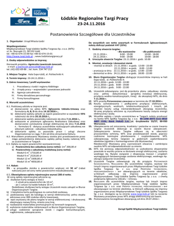 Łódzkie Regionalne Targi Pracy 23-24.11.2016 1. Organizator: Urząd Miasta Łodzi Postanowienia Szczegółowe dla Uczestników Współorganizator: Międzynarodowe Targi Łódzkie Spółka Targowa Sp. z o.o. (MTŁ) ul. ks. Skorupki 21, 90-532 Łódź tel. +48 42 674-15-00 fax +48 42 674-15-01 http://www.targi.lodz.pl ; www.lodzkietargipracy.pl 2. Osoby odpowiedzialne za imprezę: Kierownik projektu- Agnieszka Ławniczak-Janeczek; e-mail: [email protected] tel. (42) 632-69-86 ; tel. kom. 534 747 213 3. Miejsce Targów: Hala Expo-Łódź, al. Politechniki 4. 4. Termin imprezy: 23-24.11.2016 r. 5. Zakres towarowy / profil wystawców: I. II. III. IV. V. Pracodawcy z Łodzi i regionu łódzkiego Urzędy pracy – wojewódzki i powiatowe jednostki Agencje zatrudnienia Firmy doradztwa personalnego Firmy konsultingowe 6. Warunki uczestnictwa: 6.1. Podstawą udziału w imprezie jest: a) dostarczenie na adres MTŁ Zgłoszenia Udziału-Umowy oraz formularzy A, B, D do dnia 14.10.2016 r., b) dokonanie wpłaty zaliczki za najem powierzchni w wysokości 55% należności do dnia 20.10.2016 r., c) dokonanie wpłaty pozostałej należności do dnia 7.11.2016 r., d) wskazanie w pisemnym zgłoszeniu Realizatora Zabudowy oraz dostarczenie zamówienia energii elektrycznej do dnia 7.11.2016 r. - formularz C - dotyczy uczestników realizujących zabudowę we własnym zakresie - zabudowa indywidualna, e) dokonanie opłaty za pozostałe prace i usługi zlecone Organizatorowi w ciągu 7 dni od dnia otrzymania faktury. 6.2. Warunkiem przekazania Wystawcy stoiska jest przedstawienie przez niego potwierdzenia dokonania wpłaty pełnej kwoty należnej MTŁ za uczestnictwo w Targach. 6.3. Opłata za najem powierzchni wystawienniczej: 2 a) Powierzchnia bez zabudowy (cena netto): 1m 200,00 zł b) Powierzchnia z zabudową modułową (ceny netto): 2 Moduł 6 m 1710,00 zł 2 Moduł 9 m 2520,00 zł 2 Moduł 12 m 3300,00 zł 2 Moduł 15 m 4050,00 zł 6.4. Rabat: 5% - w przypadku stoiska o powierzchni większej niż 30 m² (rabat naliczany jest od ceny netto powierzchni niezabudowanej. 6.5. Obowiązkowa opłata rejestracyjna wynosi 200 zł netto. W cenę opłaty rejestracyjnej wliczone są: a) służbowe karty wstępu w ilości: - 2 sztuki przy powierzchni do 10 m², - po 1 sztuce na każde kolejne 10 m², Dodatkowe służbowe karty wstępu Uczestnik może zakupić w Biurze Organizacyjnym Targów. b) 1 bezpłatna karta parkingowa na samochód osobowy, c) podstawowy wpis do katalogu w wersji elektronicznej: pełna stopka adresowa oraz 300 znaków oferty towarowej, d) wpis wystawcy do planu targów w wersji elektronicznej i drukowanej obejmujący nazwę firmy, miasto oraz kraj, e) rozdawanie materiałów promocyjnych na terenach targowych, f) wyłożenie materiałów reklamowych w Biurze Organizacyjnym Targów, g) usługi: codzienne sprzątanie stoisk i ciągów komunikacyjnych, nagłośnienie, zabezpieczenie. Do wszystkich cen netto zawartych w Formularzach Zgłoszeniowych należy doliczyć podatek VAT (23%). 7. Godziny otwarcia targów: - dla wystawców - dla publiczności 23.11.2016 r. 8:00 - 19:00 10:00 - 18:00 24.11.2016 r. 9:00 - 19:00 10:00 - 18:00 8. Uroczyste otwarcie Targów: 23.11.2016 r. godz. 10.00 9. Montaż, aranżacja i demontaż stoisk: - montaż w dniach 21.11.2016 r. w godz. 22.11.2016 r. w godz. - aranżacja w dniu 22.11.2016 r. w godz. - demontaż w dniu 24.11.2016 r. w godz. 12:00 - 22:00 8:00 - 12:00 12:00 - 22:00 18:00 - 22:00 10. Biuro Organizacyjne Targów obsługuje Uczestników imprezy w hali Expo-Łódź, al. Politechniki 4: 22.11.2016 r. godz. 12:00 - 22:00 23.11.2016 r. godz. 8:00 - 19:00 24.11.2016 r. godz. 9:00 - 22:00 11. Uczestnik zobowiązany jest do przesłania planu zabudowy stoiska oraz pełnej dokumentacji (projektu instalacji elektrycznej, przyłączy wodno-kanalizacyjnych, innej) do akceptacji MTŁ, do dnia 7.11.2016 r. 12. MTŁ prześlą POTWIERDZENIE LOKALIZACJI w terminie do 27.10.2016 r. 13. Koszty zainstalowania i podłączenia przyłączy elektrycznych, energetycznych, wodnych, telekomunikacyjnych i innych, jak również koszty usług niestandardowych obciążają Uczestnika. W cenę przyłączy wliczone są zryczałtowane koszty zużycia energii elektrycznej i wody. 14. Wszelkie wpłaty z tytułu uczestnictwa w Targach należy przekazać na konto MTŁ Spółka Targowa Sp. z o.o. 90 1240 3073 1111 0010 4407 1526, Bank PeKaO S.A. ul. Grzybowska 53/57, 00-950 Warszawa. 15. Ubezpieczenia od zniszczenia, kradzieży i pożarów w czasie trwania targów Uczestnik dokonuje w swoim biurze ubezpieczeń. Zabezpieczenie terenu Targów odbywa się w obecności pracowników ochrony, MTŁ oraz przedstawicieli stoisk, poprzez codzienne komisyjne plombowanie i rozplombowanie. MTŁ zabezpieczają tereny targowe w godzinach zaplombowania obiektów (zgodnie z harmonogramem dla Wystawców). Nieobecność Wystawcy przy czynnościach otwarcia i zamknięcia zwalnia MTŁ od odpowiedzialności za mienie. 16. MTŁ nie ponoszą odpowiedzialności za uszkodzenia eksponatów powstałe w wyniku przerw w dostawie energii elektrycznej, zasilania wodnego itp. Ryzyko związane z ekspozycją maszyn i urządzeń wymagających bezawaryjnego zasilania elektrycznego, wodnego itp. obciąża wyłącznie Uczestnika. 17. Uczestnik Targów zobowiązuje się do przyjęcia POSTANOWIEŃ SZCZEGÓŁOWYCH, REGULAMINU dla uczestników targów, wystaw lub innych imprez organizowanych przez Międzynarodowe Targi Łódzkie Spółka Targowa Sp. z o.o. oraz PRZEPISÓW TECHNICZNYCH, PRZECIWPOŻAROWYCH I BHP obowiązujących na terenie obiektów, w których odbywają się imprezy organizowane przez Międzynarodowe Targi Łódzkie Spółka Targowa Sp. z o.o. z chwilą podpisania Zgłoszenia Udziału – Umowy. 18. REGULAMIN dla uczestników targów, wystaw lub innych imprez organizowanych przez Międzynarodowe Targi Łódzkie Spółka Targowa Sp. z o.o. oraz PRZEPISY TECHNICZNE, PRZECIWPOŻAROWE I BHP obowiązujące na terenie obiektów,