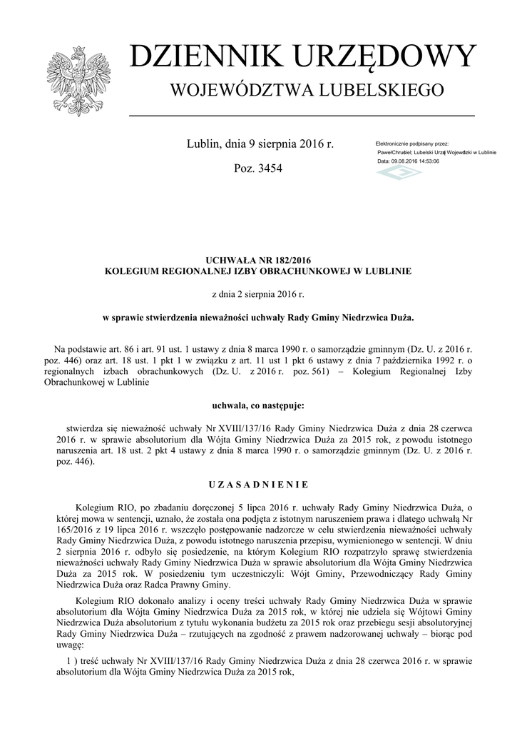 DZIENNIK URZĘDOWY WOJEWÓDZTWA LUBELSKIEGO Lublin, dnia 9 sierpnia 2016 r. Elektronicznie podpisany przez: Paweł Chruściel; Lubelski Urząd Wojewódzki w Lublinie Poz. 3454 Data: 09.08.2016 14:53:06 UCHWAŁA NR 182/2016 KOLEGIUM REGIONALNEJ IZBY OBRACHUNKOWEJ W LUBLINIE z dnia 2 sierpnia 2016 r. w sprawie stwierdzenia nieważności uchwały Rady Gminy Niedrzwica Duża. Na podstawie art. 86 i art. 91 ust. 1 ustawy z dnia 8 marca 1990 r. o samorządzie gminnym (Dz. U. z 2016 r. poz. 446) oraz art. 18 ust. 1 pkt 1 w związku z art. 11 ust 1 pkt 6 ustawy z dnia 7 października 1992 r. o regionalnych izbach obrachunkowych (Dz. U. z 2016 r. poz. 561) – Kolegium Regionalnej Izby Obrachunkowej w Lublinie uchwala, co następuje: stwierdza się nieważność uchwały Nr XVIII/137/16 Rady Gminy Niedrzwica Duża z dnia 28 czerwca 2016 r. w sprawie absolutorium dla Wójta Gminy Niedrzwica Duża za 2015 rok, z powodu istotnego naruszenia art. 18 ust. 2 pkt 4 ustawy z dnia 8 marca 1990 r. o samorządzie gminnym (Dz. U. z 2016 r. poz. 446). UZASADNIENIE Kolegium RIO, po zbadaniu doręczonej 5 lipca 2016 r. uchwały Rady Gminy Niedrzwica Duża, o której mowa w sentencji, uznało, że została ona podjęta z istotnym naruszeniem prawa i dlatego uchwałą Nr 165/2016 z 19 lipca 2016 r. wszczęło postępowanie nadzorcze w celu stwierdzenia nieważności uchwały Rady Gminy Niedrzwica Duża, z powodu istotnego naruszenia przepisu, wymienionego w sentencji. W dniu 2 sierpnia 2016 r. odbyło się posiedzenie, na którym Kolegium RIO rozpatrzyło sprawę stwierdzenia nieważności uchwały Rady Gminy Niedrzwica Duża w sprawie absolutorium dla Wójta Gminy Niedrzwica Duża za 2015 rok. W posiedzeniu tym uczestniczyli: Wójt Gminy, Przewodniczący Rady Gminy Niedrzwica Duża oraz Radca Prawny Gminy. Kolegium RIO dokonało analizy i oceny treści uchwały Rady Gminy Niedrzwica Duża w sprawie absolutorium dla Wójta Gminy Niedrzwica Duża za 2015 rok, w której nie udziela się Wójtowi Gminy Niedrzwica Duża absolutorium z tytułu wykonania budżetu za 2015 rok oraz przebiegu sesji absolutoryjnej Rady Gminy Niedrzwica Duża – rzutujących na zgodność z prawem nadzorowanej uchwały – biorąc pod uwagę: 1 ) treść uchwały Nr XVIII/137/16 Rady Gminy Niedrzwica Duża z dnia 28 czerwca 2016 r. w sprawie absolutorium dla Wójta Gminy Niedrzwica Duża za 2015 rok, Dziennik Urzędowy Województwa Lubelskiego –2– Poz. 3454 2 ) wyciąg z niezatwierdzonego protokołu z XVIII sesji Rady Gminy Niedrzwica Duża z dnia 28 czerwca 2016 r. – przekazanego przez Przewodniczącego Rady Gminy Niedrzwica Duża, 3 ) wniosek Komisji Rewizyjnej Rady Gminy Niedrzwica Duża z dnia 9 czerwca 2016 r., wraz uzasadnieniem, o nieudzielenie absolutorium Wójtowi Gminy Niedrzwica Duża za 2015 rok, 4 ) uchwałę budżetową na 2015 rok wraz z uchwałami zmieniającymi budżet gminy, podejmowanymi przez Radę Gminy Niedrzwica Duża w trakcie 2015 roku, 5 ) sprawozdanie Wójta Gminy Niedrzwica Duża z wykonania budżetu gminy za 2015 r., 6 ) sprawozdania statystyczne z wykonania budżetu roku 2015, 7 ) uwagi przedstawione przez Wydział Informacji, Analiz i Szkoleń RIO w Lublinie w zakresie wykonania budżetu gminy Niedrzwica Duża za 2015 r., 8 ) pozytywną opinię Składu Orzekającego RIO o sprawozdaniu z wykonania budżetu, 9 ) pozytywną opinię Składu Orzekającego RIO o wniosku komisji rewizyjnej w sprawie nieudzielenia absolutorium, 10 ) wyjaśnienia składane przez Przewodniczącego Rady Gminy i Wójta Gminy Niedrzwica Duża na posiedzeniu Kolegium RIO w Lublinie w dniu 2 sierpnia 2016 r. Na podstawie powyższych dowodów stwierdzić należy, że nieudzielenie absolutorium Wójtowi Gminy Niedrzwica Duża zostało poprzedzone wystąpieniem Komisji Rewizyjnej Rady Gminy Niedrzwica Duża z wnioskiem do Rady Gminy Niedrzwica Duża o nieudzielenie absolutorium Wójtowi Gminy Niedrzwica Duża z tytułu wykonania budżetu gminy za 2015 rok. Wniosek został pozytywnie zaopiniowany przez Skład Orzekający RIO w dniu 21 czerwca 2016 r., a Rada Gminy 28 czerwca podjęła uchwałę, w której nie udziela absolutorium wójtowi z tego tytułu. Rada zapoznała się z wymaganymi przez art. 271 ust. 1 ustawy z dnia 27 sierpnia 2009 r. o finansach publicznych (Dz. U. z 2013 r. poz. 885, z późn. zm.) dokumentami dotyczącymi gminy Niedrzwica Duża, tj.: 1 ) sprawozdaniem z wykonania budżetu jednostki samorządu terytorialnego; 2 ) sprawozdaniem finansowym; 3 ) pozytywną opinią regionalnej izby obrachunkowej o wykonaniu budżetu; 4 ) informacją o stanie mienia jednostki samorządu terytorialnego; 5 ) wnioskiem komisji rewizyjnej o nieudzielenie absolutorium, 6 ) pozytywną opinią regionalnej izby obrachunkowej w sprawie wniosku komisji rewizyjnej. Głosowanie w sprawie absolutorium zostało poprzedzone: 1 ) rozpatrzeniem i zatwierdzeniem sprawozdania z wykonania budżetu za 2015 rok oraz sprawozdania finansowego (uchwała Rady Gminy nr XVIII/136/16 z 28 czerwca 2016 r.), 2 ) dyskusją absolutoryjną, dotyczącą wykonania budżetu 2015 roku. Uchwała została podjęta w sposób wymagany przez art. 28a ust. 2 ustawy o samorządzie gminnym. Zgodnie z tym przepisem, uchwałę w sprawie absolutorium rada gminy podejmuje bezwzględną większością głosów ustawowego składu rady gminy. W przedmiotowej sprawie za nieudzieleniem absolutorium głosowało 11 radnych, za udzieleniem absolutorium głosowało 2 radnych, a jeden radny wstrzymał się od głosu. Powyższe głosowanie, przy 15 osobowym ustawowym składzie rady, zostało więc przeprowadzone prawidłowo, a uchwała w sprawie nieudzielenia absolutorium uzyskała wymaganą prawem większość. Potwierdza to treść protokołu z sesji Rady Gminy z dnia 28 czerwca 2016 r. – protokół został przesłany do RIO przez wójta gminy po otrzymaniu go od przewodniczącego Rady Gminy (pismo przewodniczącego nr RG.0004.52.2016 z dnia 5 lipca 2016 r.). Według informacji udzielonych