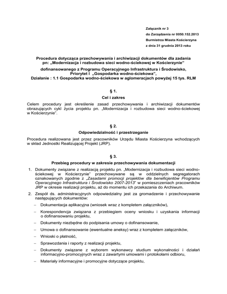 Załącznik nr 3 do Zarządzenia nr 0050.152.2013 Burmistrza Miasta Kościerzyna z dnia 31 grudnia 2013 roku Procedura dotycząca przechowywania i archiwizacji dokumentów dla zadania pn: „Modernizacja i rozbudowa sieci wodno-ściekowej w Kościerzynie” dofinansowanego z Programu Operacyjnego Infrastruktura i Środowisko, Priorytet I „Gospodarka wodno-ściekowa”, Działanie : 1.1 Gospodarka wodno-ściekowa w aglomeracjach powyżej 15 tys. RLM § 1. Cel i zakres Celem procedury jest określenie zasad przechowywania i archiwizacji dokumentów obrazujących cykl życia projektu pn. „Modernizacja i rozbudowa sieci wodno-ściekowej w Kościerzynie”. § 2. Odpowiedzialność i przestrzeganie Procedura realizowana jest przez pracowników Urzędu Miasta Kościerzyna wchodzących w skład Jednostki Realizującej Projekt (JRP). § 3. Przebieg procedury w zakresie przechowywania dokumentacji 1. Dokumenty związane z realizacją projektu pn. „Modernizacja i rozbudowa sieci wodnościekowej w Kościerzynie” przechowywane są w oddzielnych segregatorach oznakowanych zgodnie z „Zasadami promocji projektów dla beneficjentów Programu Operacyjnego Infrastruktura i Środowisko 2007-2013” w pomieszczeniach pracowników JRP w okresie realizacji projektu, aż do momentu ich przekazania do Archiwum. 2. Zespół ds. administracyjnych odpowiedzialny jest za gromadzenie i przechowywanie następujących dokumentów: Dokumentacja aplikacyjna (wniosek wraz z kompletem załączników), Korespondencja związana z przebiegiem oceny wniosku i uzyskania informacji o dofinansowaniu projektu, Dokumenty niezbędne do podpisania umowy o dofinansowanie, Umowa o dofinansowanie (ewentualne aneksy) wraz z kompletem załączników, Wnioski o płatność, Sprawozdania i raporty z realizacji projektu, Dokumenty związane z wyborem wykonawcy studium wykonalności i działań informacyjno-promocyjnych wraz z zawartymi umowami i protokołami odbioru, Materiały informacyjne i promocyjne dotyczące projektu, Wyniki przeprowadzonych kontroli (np. informacje pokontrolne, opinie pokontrolne i zalecenia pokontrolne), Korespondencja z Instytucją Wdrażającą, Korespondencja z Podmiotem upoważnionym, Dokumenty potwierdzające osiągnięcie efektu ekologicznego. 3. Zespół ds. obsługi technicznej odpowiedzialny jest za gromadzenie i przechowywanie następujących dokumentów: Decyzje administracyjne, Dokumentacja techniczna, projektowa i powykonawcza, Dokumenty związane z wyborem wykonawcy robót budowlanych i usługi nadzoru nad robotami budowlanymi wraz z zawartymi umowami i protokołami odbioru, Harmonogramy i plany inwestycyjne w zakresie projektu, Korespondencja z wykonawcami. 4. Zespół ds. finansowych odpowiedzialny jest za gromadzenie i przechowywanie następujących dokumentów: Faktury, rachunki, listy płac wraz z załącznikami, Dokumenty potwierdzające dokonanie płatności, Dowody OT, Zestawienia finansowo-księgowe, Wyciągi bankowe z rachunków związanych z realizacją projektu. 5. Po rozliczeniu projektu w zakresie rzeczowo-finansowym i uzyskaniu akceptacji Instytucji Wdrażającej w zakresie udokumentowania efektu ekologicznego wszystkie dokumenty związane z projektem podlegają sprawdzeniu w zakresie kompletności przez poszczególne zespoły JRP. Dokumenty te należy odpowiednio przygotować do archiwizacji. § 4. Przebieg procedury w zakresie archiwizacji dokumentacji 1. Dokumenty obrazujące cykl życia projektu, po nadaniu właściwej kategorii archiwalnej, zostaną przekazane do Archiwum Zakładowego w rok po zakończeniu i rozliczeniu projektu, co zostanie udokumentowane w odpowiednim protokole zdawczo-odbiorczym. 2. Dokumenty przechowywane będą w Archiwum Zakładowym przez okres wskazany w Rozporządzeniu Prezesa Rady Ministrów z dnia 18 stycznia 2011 r. w sprawie instrukcji kancelaryjnej, jednolitych rzeczowych wykazów akt oraz instrukcji w sprawie organizacji i zakresu działania archiwów zakładowych (Dz. U 2011r. Nr 14 poz. 67), z zastrzeżeniem, iż minimalny okres archiwizacji dokumentacji wynosi 3 lata od daty zamknięcia PO IiŚ. O terminie zamknięcia PO IiŚ poinformuje Instytucja Wdrażająca. 3. Za Archiwum Zakładowe w Kościerzynie. odpowiada Wydział Organizacyjny Urzędu Miasta 4. Nadzór nad prawidłowością archiwizacji dokumentów związanych z projektem pn. „Modernizacja i rozbudowa sieci wodno-ściekowej w Kościerzynie” ponosi Pełnomocnik ds. Realizacji Projektu (MAO). § 5. Gromadzenie danych w formie elektronicznej 1. Dokumenty opracowywane w formie elektronicznej w trakcie realizacji projektu przechowywane są w wydziałowym udostępnionym folderze sieciowym na serwerze plików NAS. 2. Najważniejsze dokumenty związane z realizacją projektu będą na bieżąco skanowane i zapisywane w postaci plików pdf lub jpg na serwerze plików NAS w wydzielonym folderze. 3. Po zakończeniu realizacji projektu całość dokumentacji elektronicznej zostanie przeniesiona na informatyczne nośniki danych, które będą załączone do dokumentacji papierowej i przekazane do Archiwum Zakładowego. § 6. Nadzór nad stosowaniem procedury Odpowiedzialność za nadzór nad prawidłowym stosowaniem Procedury ponosi Pełnomocnik ds. Realizacji Projektu (MAO).