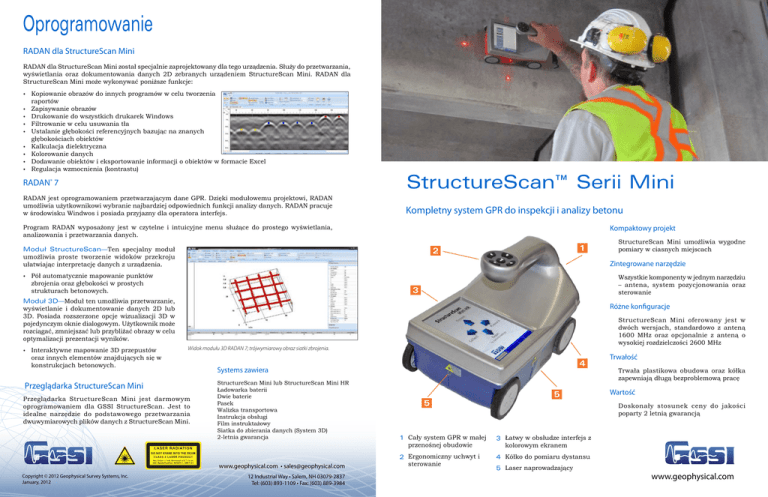 Oprogramowanie RADAN dla StructureScan Mini RADAN dla StructureScan Mini został specjalnie zaprojektowany dla tego urządzenia. Służy do przetwarzania, wyświetlania oraz dokumentowania danych 2D zebranych urządeniem StructureScan Mini. RADAN dla StructureScan Mini może wykonywać poniższe funkcje: • • • • • • • • • Kopiowanie obrazów do innych programów w celu tworzenia raportów Zapisywanie obrazów Drukowanie do wszystkich drukarek Windows Filtrowanie w celu usuwania tła Ustalanie głębokości referencyjnych bazując na znanych głębokościach obiektów Kalkulacja dielektryczna Kolorowanie danych Dodawanie obiektów i eksportowanie informacji o obiektów w formacie Excel Regulacja wzmocnienia (kontrastu) RADAN® 7 RADAN jest oprogramowaniem przetwarzającym dane GPR. Dzięki modułowemu projektowi, RADAN umożliwia użytkownikowi wybranie najbardziej odpowiednich funkcji analizy danych. RADAN pracuje w środowisku Windwos i posiada przyjazny dla operatora interfejs. StructureScan™ Serii Mini Kompletny system GPR do inspekcji i analizy betonu Program RADAN wyposażony jest w czytelne i intuicyjne menu służące do prostego wyświetlania, analizowania i przetwarzania danych. Kompaktowy projekt Moduł StructureScan—Ten specjalny moduł umożliwia proste tworzenie widoków przekroju ułatwiając interpretację danych z urządzenia. • 1 2 Zintegrowane narzędzie Pół automatycznie mapowanie punktów zbrojenia oraz głębokości w prostych strukturach betonowych. Wszystkie komponenty w jednym narzędziu – antena, system pozycjonowania oraz sterowanie 3 Moduł 3D—Moduł ten umożliwia przetwarzanie, wyświetlanie i dokumentowanie danych 2D lub 3D. Posiada rozszerzone opcje wizualizacji 3D w pojedynczym oknie dialogowym. Użytkownik może rozciągać, zmniejszać lub przybliżać obrazy w celu optymalizacji prezentacji wyników. • Różne konfiguracje 4 Systems zawiera Przeglądarka StructureScan Mini Przeglądarka StructureScan Mini jest darmowym oprogramowaniem dla GSSI StructureScan. Jest to idealne narzędzie do podstawowego przetwarzania dwuwymiarowych plików danych z StructureScan Mini. StructureScan Mini lub StructureScan Mini HR Ładowarka baterii Dwie baterie Pasek Walizka transportowa Instrukcja obsługi Film instruktażowy Siatka do zbierania danych (System 3D) 2-letnia gwarancja L A S E R R A D I ATI O N DO NOT STARE INTO THE BEAM CLAS S 2 LA S E R P R OD U C T + /- 10 nm I E C S p ecif icat ion 60825- 1, 2007- 0 3 Copyright © 2012 Geophysical Survey Systems, Inc. January, 2012 StructureScan Mini oferowany jest w dwóch wersjach, standardowo z anteną 1600 MHz oraz opcjonalnie z anteną o wysokiej rozdzielczości 2600 MHz Widok modułu 3D RADAN 7; trójwymiarowy obraz siatki zbrojenia. Interaktywne mapowanie 3D przepustów oraz innych elementów znajdujących się w konstrukcjach betonowych. Max Output < 1 mW, Wavelengt h 635 StructureScan Mini umożliwia wygodne pomiary w ciasnych miejscach www.geophysical.com • [email protected] 12 Industrial Way • Salem, NH 03079-2837 Tel: (603) 893-1109 • Fax: (603) 889-3984 5 5 Trwałość Trwała plastikowa obudowa oraz kółka zapewniają długą bezproblemową pracę Wartość Doskonały stosunek ceny do jakości poparty 2 letnią gwarancją 1 Cały system GPR w małej przenośnej obudowie 3 Łatwy w obsłudze interfejs z kolorowym ekranem 2 Ergonomiczny uchwyt i sterowanie 4 Kółko do pomiaru dystansu 5 Laser naprowadzający www.geophysical.com StructureScan Mini Serii Wprowadzamy wersję Mini – nasz najmniejszy system StructureScan. StructureScan mini jest idealnym narzędziem do lokalizowania pozycji i głębokości zbrojenia, kanałów, przewodów, prętów sprężających jak i pustek w betonie. Wysokiej rozdzielczości 5,7” ekran z podświetleniem LED zapewnia dokładny obraz struktury badanego materiału. Oprócz wizualizacji, dane mogą być zapisywane na karcie SD w celu późniejszej analizy na komputerze PC. StructureScan Mini HR StructureScan Mini jest małą i lekką alternatywą dla systemów GPR. Waga całego urządzenia nie przekracza 2 kg. Małe rozmiary urządzenia ułatwiają transport urządzenia na miejsce badania jak i operowanie urządzeniem w ciasnych miejscach. Mini jest bardzo proste w obsłudze – nowi użytkownicy są w stanie obsłużyć urządzenie po kilku godzinach nauki. Mini pomaga w detekcji obiektów oznaczając dane na ekranie małymi kropkami gdy zidentyfikowane zostanie zbrojenie lub kanał. Laser z boku urządzenia wskazuje dokładną lokalizację środka obiektu oznaczając obiekty ukryte w betonie. 1600 MHz Niezwykła rozdzielczość danych StructureScan Mini HR jest przenośnym, zintegrowanym systemem GPR do inspekcji betonu. Dzięki antenie 2600 MHz, urządzenie może bardzo precyzyjnie lokalizować zbrojenia, przepusty, pręty sprężające oraz pustki w betonie na głębokość do ok. 40 cm. StructureScan Mini HR dostępny jest w dwóch wersjach; 2D dla lokalizacji celów w czasie rzeczywistym oraz 3D do tworzenia obrazów w formie rentgena. Jest idealnym urządzeniem dla kompleksowych obszarów, StructureScan Mini HR może wykryć małe obiekty z doskonałą pionową i poziomą rozdzielczością. 2600 MHz Typowe zastosowania StructureScan serii Mini StructureScan Mini Dane pokazujące mały 15 mm plastikowy przepust nad siatką zbrojenia. Dane zebrane StructureScan Mini HR prezentowane jako obraz 3D radialnego rurowego ogrzewania w płycie betonowej. StructureScan Mini firmy GSSI jest przenośnym, zintegrowanym systemem GPR do inspekcji betonu. Urządzenie to służy do lokalizowania zbrojeń, kanałów, prętów sprężających, pustek jak i wyznaczania grubości płyt betonowych. Antena 1600 MHz umożliwia penetrację do ok. 50 cm. StructureScan Mini ofertuje bardzo dobre połączenie rozdzielczości danych z głębokością pomiaru. Wykorzystywany jest na całym świecie i szybko stał się popularnym narzędziem do obrazowania betonu