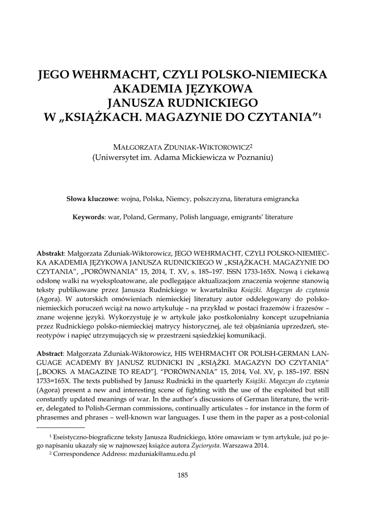 JEGO WEHRMACHT, CZYLI POLSKO-NIEMIECKA AKADEMIA JĘZYKOWA JANUSZA RUDNICKIEGO W „KSIĄŻKACH. MAGAZYNIE DO CZYTANIA”1 MAŁGORZATA ZDUNIAK-WIKTOROWICZ2 (Uniwersytet im. Adama Mickiewicza w Poznaniu) Słowa kluczowe: wojna, Polska, Niemcy, polszczyzna, literatura emigrancka Keywords: war, Poland, Germany, Polish language, emigrants’ literature Abstrakt: Małgorzata Zduniak-Wiktorowicz, JEGO WEHRMACHT, CZYLI POLSKO-NIEMIECKA AKADEMIA JĘZYKOWA JANUSZA RUDNICKIEGO W „KSIĄŻKACH. MAGAZYNIE DO CZYTANIA”, „PORÓWNANIA” 15, 2014, T. XV, s. 185–197. ISSN 1733-165X. Nową i ciekawą odsłonę walki na wyeksploatowane, ale podlegające aktualizacjom znaczenia wojenne stanowią teksty publikowane przez Janusza Rudnickiego w kwartalniku Książki. Magazyn do czytania (Agora). W autorskich omówieniach niemieckiej literatury autor oddelegowany do polskoniemieckich poruczeń wciąż na nowo artykułuje – na przykład w postaci frazemów i frazesów – znane wojenne języki. Wykorzystuję je w artykule jako postkolonialny koncept uzupełniania przez Rudnickiego polsko-niemieckiej matrycy historycznej, ale też objaśniania uprzedzeń, stereotypów i napięć utrzymujących się w przestrzeni sąsiedzkiej komunikacji. Abstract: Małgorzata Zduniak-Wiktorowicz, HIS WEHRMACHT OR POLISH-GERMAN LANGUAGE ACADEMY BY JANUSZ RUDNICKI IN „KSIĄŻKI. MAGAZYN DO CZYTANIA” [„BOOKS. A MAGAZINE TO READ”]. “PORÓWNANIA” 15, 2014, Vol. XV, p. 185–197. ISSN 1733=165X. The texts published by Janusz Rudnicki in the quarterly Książki. Magazyn do czytania (Agora) present a new and interesting scene of fighting with the use of the exploited but still constantly updated meanings of war. In the author’s discussions of German literature, the writer, delegated to Polish-German commissions, continually articulates – for instance in the form of phrasemes and phrases – well-known war languages. I use them in the paper as a post-colonial ________________ 1 Eseistyczno-biograficzne teksty Janusza Rudnickiego, które omawiam w tym artykule, już po jego napisaniu ukazały się w najnowszej książce autora Życiorysta. Warszawa 2014. 2 Correspondence Address: [email protected] 185 PORÓWNANIA 15, 2014 concept of Rudnicki’s supplementation of the Polish-German historical matrix, but also as explanation of the prejudice, stereotypes and tensions persisting in the space of neighborhood communication. PRAJĘZYK Języki literackiej postkolonialności mają w najnowszej polskiej prozie różne natężenie; mogą przyjmować postać ściszonej, wstydliwej sugestii bycia ofiarą, ale bywa też, że brzmią bardzo wyraźnie. Dzieje się tak na przykład, gdy ich tkankę tworzą doświadczenia, a więc również słowa znane z historii najnowszej i jej ciągów dalszych, które sięgają teraźniejszości. Bardzo donośny wariant takiego języka wybiera w swej najnowszej powieści Ignacy Karpowicz: Już niedługo wojna się skończy. […] Zabiorę cię do mojej matki, ma piękną willę pod niemieckim miasteczkiem Haradok. […] Potem weźmiemy ślub. Będziesz czasem gotować polnische jedzenie. Wszystkim posmakuje. Będziemy mieli pięcioro dzieci: Waschil, Griken, Jan, Phrosch, Schiessen. Będziemy jeździć do kurortów i nad morze (morze to po niemiecku Juden). Będziemy mieli kota o imieniu Raus. Kot będzie się wygrzewać w słońcu i łowić Schweine (to po niemiecku myszy). Sąsiad, starszy elegancki pan w garniturze w prążki, Herr Abramowitsch, zapisze nam swój majątek. A inny sąsiad też z Polen, pan Buchwald, wyda swoją córkę za naszego pierworodnego3. Sońka jest pełna polsko-niemieckiego idiomu, tego języka, który siedemdziesiąt lat po wojnie wciąż jest ostry i dźwięczny. Dlatego też nie wymaga objaśnień, jeśli chodzi o jego pokrętną, lecz w gruncie rzeczy bardzo czytelną leksykę i składnię. Czasownik „strzelać” jako antroponim, czy toponim „Buchwald” w funkcji nazwiska przyszłego żydowskiego sąsiada z Polski udowadniają, że tym, co zostaje, są wspomnienia oraz język. I to nim po latach rekonstruuje się tu oba równoległe plany wydarzeń: wojnę i miłość. Wszystkie te zabiegi składają się na tkankę semantycznych i bardzo przenikliwych medytacji4; z jednej strony oskarżają wojnę o miłosny dramat chłopki z Podlasia i niemieckiego oficera, z drugiej – celnie wydobywają to, co można nazwać polsko-niemieckimi artykulacjami doświadczenia wojennego. Pisarz pokazuje, że „raus”, „Polen” i „Juden”, umieszczone w swej bezpośredniej bliskości, to wyrazy intuicyjnie zrozumiałe. Obywają się bez dookreślania, mimo że wbrew prawidłom semantyki językoznawczej niemiecka leksyka czytana jest tu z perspektywy użyt________________ 3 I. Karpowicz, Sońka. Kraków 2014, s. 56. Cytowany fragment ukazał się wcześniej w prasie: I. Karpowicz, Dawno, dawno temu, w najmniej odpowiednim momencie. „Gazeta Wyborcza. Magazyn”, 26–27 kwietnia 2014, s. 25. 4 Por. A. Wierzbicka, Kocha, lubi, szanuje. Medytacje semantyczne. Warszawa 1971. 186 Małgorzata Zduniak-Wiktorowska, Jego Wehrmacht, czyli polsko-niemiecka akademia językowa Janusza Rudnickiego kownika polszczyzny. Widzimy więc, że słowa – kulturowe artefakty danego społeczeństwa – jak pisze Anna Wierzbicka, to również swego rodzaju narzędzia pojęciowe, w których zakodowane jest przeszłe doświadczenie społeczeństwa, odnoszące się zarówno do sfery działania, jak i charakterystycznego dla niego sposobu myślenia. Narzędzia te służą także utrwalaniu tych doświadczeń. Jednak w miarę, jak społeczeństwo się zmienia, również i one mogą podlegać stopniowym zmianom, aż w końcu mogą się zupełnie zdezaktualizować. W tym sensie nie można powiedzieć, by światopogląd danej społeczności był całkowicie zdeterminowany przez określony zestaw narzędzi pojęciowych, którymi ona dysponuje, ale z pewnością pozostaje pod silnym ich wpływem5