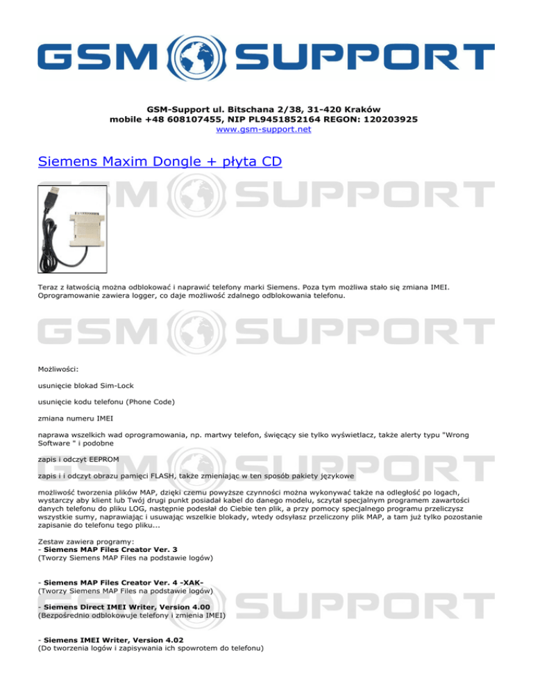 GSM-Support ul. Bitschana 2/38, 31-420 Kraków mobile +48 608107455, NIP PL9451852164 REGON: 120203925 www.gsm-support.net Siemens Maxim Dongle + płyta CD Teraz z łatwością można odblokować i naprawić telefony marki Siemens. Poza tym możliwa stało się zmiana IMEI. Oprogramowanie zawiera logger, co daje możliwość zdalnego odblokowania telefonu. Możliwości: usunięcie blokad Sim-Lock usunięcie kodu telefonu (Phone Code) zmiana numeru IMEI naprawa wszelkich wad oprogramowania, np. martwy telefon, święcący sie tylko wyświetlacz, także alerty typu "Wrong Software " i podobne zapis i odczyt EEPROM zapis i i odczyt obrazu pamięci FLASH, także zmieniając w ten sposób pakiety językowe możliwość tworzenia plików MAP, dzięki czemu powyższe czynności można wykonywać także na odległość po logach, wystarczy aby klient lub Twój drugi punkt posiadał kabel do danego modelu, sczytał specjalnym programem zawartości danych telefonu do pliku LOG, następnie podesłał do Ciebie ten plik, a przy pomocy specjalnego programu przeliczysz wszystkie sumy, naprawiając i usuwając wszelkie blokady, wtedy odsyłasz przeliczony plik MAP, a tam już tylko pozostanie zapisanie do telefonu tego pliku... Zestaw zawiera programy: - Siemens MAP Files Creator Ver. 3 (Tworzy Siemens MAP Files na podstawie logów) - Siemens MAP Files Creator Ver. 4 -XAK(Tworzy Siemens MAP Files na podstawie logów) - Siemens Direct IMEI Writer, Version 4.00 (Bezpośrednio odblokowuje telefony i zmienia IMEI) - Siemens IMEI Writer, Version 4.02 (Do tworzenia logów i zapisywania ich spowrotem do telefonu) - UniSiemens Professional v4.00 beta (Odczyt i zapis pełnego flasha z telefonów Siemens) Oprogramowanie działa z modelami: C35 S35 M35 C35 NEW S35 NEW A35 A36 A40 S40 C30 C45 S45 ME45 SL45 Zestaw zawiera: klucz programowy Maxim płyta CD z oprogramowaniem i flashami do telefonów ©2012 www.gsm-support.net Opis ten nie stanowi oferty w rozumieniu Kodeksu Cywilnego. GSM-Support zastrzega sobie prawo do możliwych błędów w opisie produktu. Prosimy o weryfikację z Państwa strony, a w razie wątpliwości o kontakt. GSM-Support ul. Bitschana 2/38 31-420 Kraków POLSKA tel. 608107455 e-mail: [email protected] Powered by TCPDF (www.tcpdf.org)
