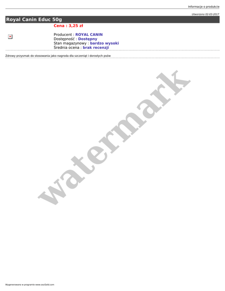 Informacje o produkcie Utworzono 02-03-2017 Royal Canin Educ 50g Cena : 3,25 zł Producent : ROYAL CANIN Dostępność : Dostępny Stan magazynowy : bardzo wysoki Średnia ocena : brak recenzji w at er m ar k Zdrowy przysmak do stosowania jako nagroda dla szczeniąt i dorosłych psów Wygenerowano w programie www.oscGold.com