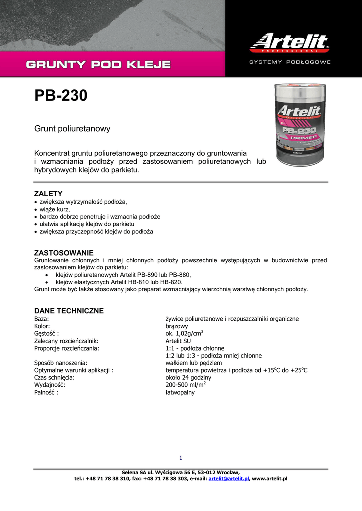 PB-230 Grunt poliuretanowy Koncentrat gruntu poliuretanowego przeznaczony do gruntowania i wzmacniania podłoży przed zastosowaniem poliuretanowych lub hybrydowych klejów do parkietu. ZALETY zwiększa wytrzymałość podłoża, wiąże kurz, bardzo dobrze penetruje i wzmacnia podłoże ułatwia aplikację klejów do parkietu zwiększa przyczepność klejów do podłoża ZASTOSOWANIE Gruntowanie chłonnych i mniej chłonnych podłoży powszechnie występujących w budownictwie przed zastosowaniem klejów do parkietu: klejów poliuretanowych Artelit PB-890 lub PB-880, klejów elastycznych Artelit HB-810 lub HB-820. Grunt może być także stosowany jako preparat wzmacniający wierzchnią warstwę chłonnych podłoży. DANE TECHNICZNE Baza: Kolor: Gęstość : Zalecany rozcieńczalnik: Proporcje rozcieńczania: Sposób nanoszenia: Optymalne warunki aplikacji : Czas schnięcia: Wydajność: Palność : żywice poliuretanowe i rozpuszczalniki organiczne brązowy ok. 1,02g/cm3 Artelit SU 1:1 - podłoża chłonne 1:2 lub 1:3 - podłoża mniej chłonne wałkiem lub pędzlem temperatura powietrza i podłoża od +15oC do +25oC około 24 godziny 200-500 ml/m2 łatwopalny 1 Selena SA ul. Wyścigowa 56 E, 53-012 Wrocław, tel.: +48 71 78 38 310, fax: +48 71 78 38 303, e-mail: [email protected], www.artelit.pl SPOSÓB UŻYCIA Podłoże powinno być równe, suche, mocne, wolne od zanieczyszczeń. Oddzielające się warstwy podłoża należy usunąć, a pylące podłoża intensywnie oczyścić szczotką i odkurzyć. W przypadku stosowania gruntu jako preparatu wzmacniającego zalecane jest przeszlifowaniu lub sfrezowanie wierzchniej warstwy wylewki celem poprawy chłonności podłoża. Grunt rozcieńczony z preparatem Artelit SU w proporcjach zależnych od chłonności podłoża należy nanosić wałkiem lub pędzlem. Grunt powinien być całkowicie wchłonięty bez utworzenia błony nawierzchniowej. Pozostawić do wyschnięcia na około 24 godziny. Klejenie parkietu wykonywać po całkowitym wyschnięciu gruntu. Uwaga – produkt łatwopalny. Produkt do użytku profesjonalnego. WSKAZÓWKI Produkt łatwopalny. Wszystkie prace wykonywać w dobrze wentylowanych pomieszczeniach z dala od jakichkolwiek źródeł ognia. W trakcie wykonywania prac i przed wyschnięciem gruntu nie palić. Przestrzegać ogólnych przepisów bhp i p.poż. dotyczących pracy z substancjami łatwopalnymi. OPAKOWANIE Zawartość Rodzaj opakowania Ilość opakowań na palecie 4,5 l Kanister metalowy 100 szt. 9l Kanister metalowy 80 szt. PRZECHOWYWANIE Produkt można przechowywać w oryginalnie zamkniętych opakowaniach, w temperaturze od +10°C do +30°C. Produkt łatwopalny. Nie jest dozwolone przechowywanie pojemników z gruntem w pobliżu otwartego ognia. Data ważności i numer partii na opakowaniu. Karta bezpieczeństwa dostępna na www.artelit.pl. TDS/AP/12/11 Wrocław 2011-07-08 Aktualizacja 2015-09-22 Publikacja niniejszej kart technicznej powoduje utratę ważności poprzedniej jej wersji Powyższe dane, zalecenia i wskazówki opierają się na naszej najlepszej wiedzy, badaniach oraz doświadczeniach i zostały udzielone w dobrej wierze zgodnie z zasadami obowiązującymi w naszej firmie i u naszych dostawców. Zaproponowane sposoby postępowania uznane są za powszechne, jednak każdy z użytkowników tego materiału powinien upewnić się na wszelkie możliwe sposoby, włącznie ze sprawdzeniem produktu końcowego w odpowiednich warunkach, o przydatności dostarczanych materiałów dla osiągnięcia celów przez niego zamierzonych. Ani Spółka, ani jej upoważnieni przedstawiciele nie mogą ponosić odpowiedzialności za jakiekolwiek straty poniesione na skutek nieprawidłowego, bądź błędnego użycia jej materiałów. Przy klejeniu wykładzin lub parkietu należy zapoznać się z zaleceniami producenta klejonego materiału. 2 Selena SA ul. Wyścigowa 56 E, 53-012 Wrocław, tel.: +48 71 78 38 310, fax: +48 71 78 38 303, e-mail: [email protected], www.artelit.pl