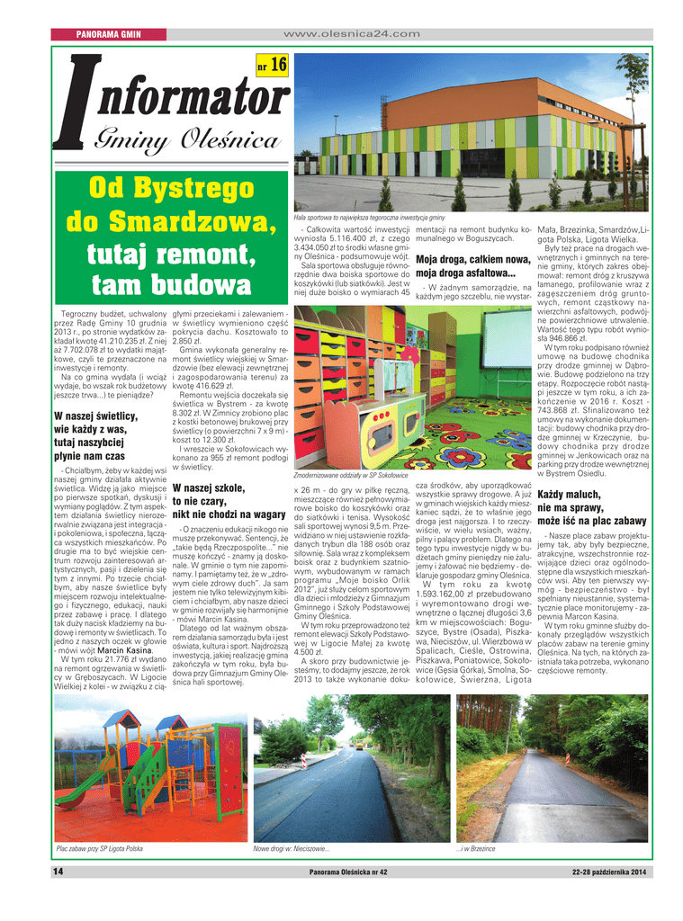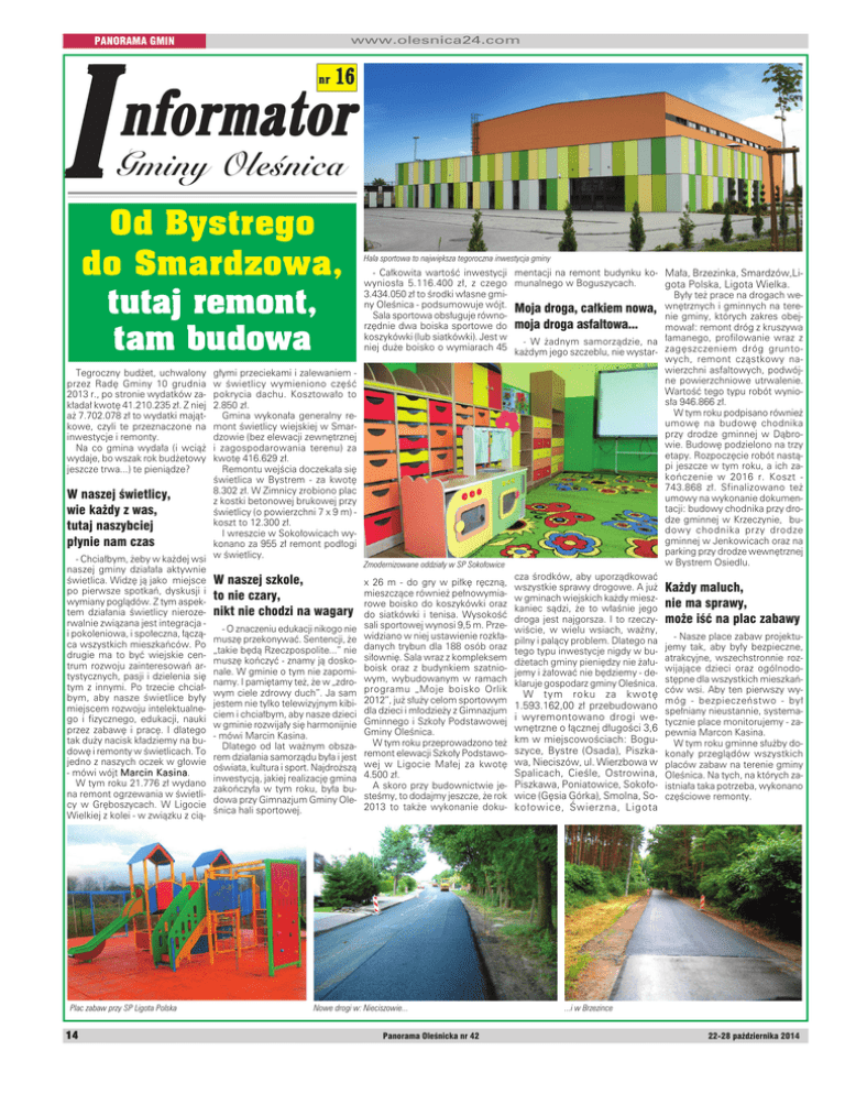 www.olesnica24.com PANORAMA GMIN I nr 16 nformator Gminy Oleśnica Od Bystrego do Smardzowa, tutaj remont, tam budowa Hala sportowa to największa tegoroczna inwestycja gminy - Całkowita wartość inwestycji mentacji na remont budynku kowyniosła 5.116.400 zł, z czego munalnego w Boguszycach. 3.434.050 zł to środki własne gminy Oleśnica - podsumowuje wójt. Moja droga, całkiem nowa, Sala sportowa obsługuje równorzędnie dwa boiska sportowe do moja droga asfaltowa... koszykówki (lub siatkówki). Jest w - W żadnym samorządzie, na niej duże boisko o wymiarach 45 każdym jego szczeblu, nie wystar- Tegroczny budżet, uchwalony przez Radę Gminy 10 grudnia 2013 r., po stronie wydatków zakładał kwotę 41.210.235 zł. Z niej aż 7.702.078 zł to wydatki majątkowe, czyli te przeznaczone na inwestycje i remonty. Na co gmina wydała (i wciąż wydaje, bo wszak rok budżetowy jeszcze trwa...) te pieniądze? głymi przeciekami i zalewaniem w świetlicy wymieniono część pokrycia dachu. Kosztowało to 2.850 zł. Gmina wykonała generalny remont świetlicy wiejskiej w Smardzowie (bez elewacji zewnętrznej i zagospodarowania terenu) za kwotę 416.629 zł. Remontu wejścia doczekała się świetlica w Bystrem - za kwotę 8.302 zł. W Zimnicy zrobiono plac W naszej świetlicy, z kostki betonowej brukowej przy wie każdy z was, świetlicy (o powierzchni 7 x 9 m) koszt to 12.300 zł. tutaj naszybciej I wreszcie w Sokołowicach wypłynie nam czas konano za 955 zł remont podłogi - Chciałbym, żeby w każdej wsi w świetlicy. naszej gminy działała aktywnie świetlica. Widzę ją jako miejsce W naszej szkole, po pierwsze spotkań, dyskusji i to nie czary, wymiany poglądów. Z tym aspektem działania świetlicy nieroze- nikt nie chodzi na wagary rwalnie związana jest integracja - O znaczeniu edukacji nikogo nie i pokoleniowa, i społeczna, łącząmuszę przekonywać. Sentencji, że ca wszystkich mieszkańców. Po „takie będą Rzeczpospolite...” nie drugie ma to być wiejskie cenmuszę kończyć - znamy ją doskotrum rozwoju zainteresowań arnale. W gminie o tym nie zapomitystycznych, pasji i dzielenia się namy. I pamiętamy też, że w „zdrotym z innymi. Po trzecie chciałwym ciele zdrowy duch”. Ja sam bym, aby nasze świetlice były jestem nie tylko telewizyjnym kibimiejscem rozwoju intelektualneciem i chciałbym, aby nasze dzieci go i fizycznego, edukacji, nauki w gminie rozwijały się harmonijnie przez zabawę i pracę. I dlatego - mówi Marcin Kasina. tak duży nacisk kładziemy na buDlatego od lat ważnym obszadowę i remonty w świetlicach. To rem działania samorządu była i jest jedno z naszych oczek w głowie oświata, kultura i sport. Najdroższą Kasina. - mówi wójt Marcin Kasina inwestycją, jakiej realizację gmina W tym roku 21.776 zł wydano zakończyła w tym roku, była buna remont ogrzewania w świetlidowa przy Gimnazjum Gminy Olecy w Gręboszycach. W Ligocie śnica hali sportowej. Wielkiej z kolei - w związku z cią- Plac zabaw przy SP Ligota Polska 14 Zmodernizowane oddziały w SP Sokołowice x 26 m - do gry w piłkę ręczną, mieszczące również pełnowymiarowe boisko do koszykówki oraz do siatkówki i tenisa. Wysokość sali sportowej wynosi 9,5 m. Przewidziano w niej ustawienie rozkładanych trybun dla 188 osób oraz siłownię. Sala wraz z kompleksem boisk oraz z budynkiem szatniowym, wybudowanym w ramach programu „Moje boisko Orlik 2012”, już służy celom sportowym dla dzieci i młodzieży z Gimnazjum Gminnego i Szkoły Podstawowej Gminy Oleśnica. W tym roku przeprowadzono też remont elewacji Szkoły Podstawowej w Ligocie Małej za kwotę 4.500 zł. A skoro przy budownictwie jesteśmy, to dodajmy jeszcze, że rok 2013 to także wykonanie doku- Nowe drogi w: Nieciszowie... Panorama Oleśnicka nr 42 cza środków, aby uporządkować wszystkie sprawy drogowe. A już w gminach wiejskich każdy mieszkaniec sądzi, że to właśnie jego droga jest najgorsza. I to rzeczywiście, w wielu wsiach, ważny, pilny i palący problem. Dlatego na tego typu inwestycje nigdy w budżetach gminy pieniędzy nie żałujemy i żałować nie będziemy - deklaruje gospodarz gminy Oleśnica. W tym roku za kwotę 1.593.162,00 zł przebudowano i wyremontowano drogi wewnętrzne o łącznej długości 3,6 km w miejscowościach: Boguszyce, Bystre (Osada), Piszkawa, Nieciszów, ul. Wierzbowa w Spalicach, Cieśle, Ostrowina, Piszkawa, Poniatowice, Sokołowice (Gęsia Górka), Smolna, Sokołowice, Świerzna, Ligota Mała, Brzezinka, Smardzów,Ligota Polska, Ligota Wielka. Były też prace na drogach wewnętrznych i gminnych na terenie gminy, których zakres obejmował: remont dróg z kruszywa łamanego, profilowanie wraz z zagęszczeniem dróg gruntowych, remont cząstkowy nawierzchni asfaltowych, podwójne powierzchniowe utrwalenie. Wartość tego typu robót wyniosła 946.866 zł. W tym roku podpisano również umowę na budowę chodnika przy drodze gminnej w Dąbrowie. Budowę podzielono na trzy etapy. Rozpoczęcie robót nastąpi jeszcze w tym roku, a ich zakończenie w 2016 r. Koszt 743.868 zł. Sfinalizowano też umowy na wykonanie dokumentacji: budowy chodnika przy drodze gminnej w Krzeczynie, budowy chodnika przy drodze gminnej w Jenkowicach oraz na parking przy drodze wewnętrznej w Bystrem Osiedlu. Każdy maluch, nie ma sprawy, może iść na plac zabawy - Nasze place zabaw projektujemy tak, aby były bezpieczne, atrakcyjne, wszechstronnie rozwijające dzieci oraz ogólnodostępne dla wszystkich mieszkańców wsi. Aby ten pierwszy wymóg - bezpieczeństwo - był spełniany nieustannie, systematycznie place monitorujemy - zapewnia Marcon Kasina. W tym roku gminne służby dokonały przeglądów wszystkich placów zabaw na terenie gminy Oleśnica. Na tych, na których zaistniała taka potrzeba, wykonano częściowe remonty. ...i w Brzezince 22-28 października 2014