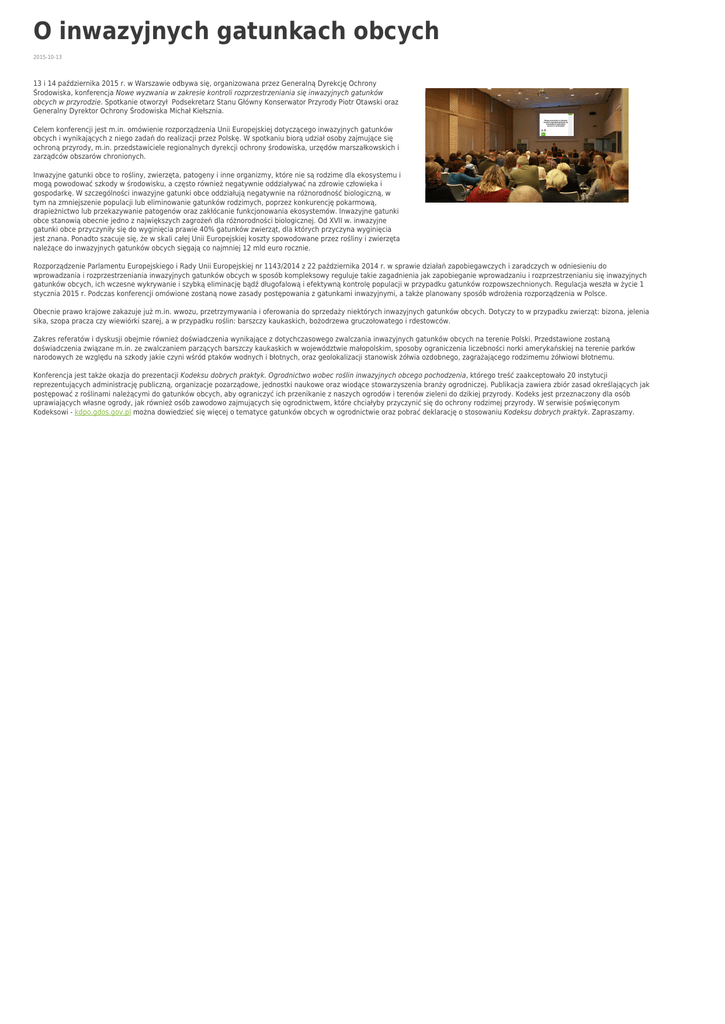 O inwazyjnych gatunkach obcych 2015-10-13 13 i 14 października 2015 r. w Warszawie odbywa się, organizowana przez Generalną Dyrekcję Ochrony Środowiska, konferencja Nowe wyzwania w zakresie kontroli rozprzestrzeniania się inwazyjnych gatunków obcych w przyrodzie. Spotkanie otworzył Podsekretarz Stanu Główny Konserwator Przyrody Piotr Otawski oraz Generalny Dyrektor Ochrony Środowiska Michał Kiełsznia. Celem konferencji jest m.in. omówienie rozporządzenia Unii Europejskiej dotyczącego inwazyjnych gatunków obcych i wynikających z niego zadań do realizacji przez Polskę. W spotkaniu biorą udział osoby zajmujące się ochroną przyrody, m.in. przedstawiciele regionalnych dyrekcji ochrony środowiska, urzędów marszałkowskich i zarządców obszarów chronionych. Inwazyjne gatunki obce to rośliny, zwierzęta, patogeny i inne organizmy, które nie są rodzime dla ekosystemu i mogą powodować szkody w środowisku, a często również negatywnie oddziaływać na zdrowie człowieka i gospodarkę. W szczególności inwazyjne gatunki obce oddziałują negatywnie na różnorodność biologiczną, w tym na zmniejszenie populacji lub eliminowanie gatunków rodzimych, poprzez konkurencję pokarmową, drapieżnictwo lub przekazywanie patogenów oraz zakłócanie funkcjonowania ekosystemów. Inwazyjne gatunki obce stanowią obecnie jedno z największych zagrożeń dla różnorodności biologicznej. Od XVII w. inwazyjne gatunki obce przyczyniły się do wyginięcia prawie 40% gatunków zwierząt, dla których przyczyna wyginięcia jest znana. Ponadto szacuje się, że w skali całej Unii Europejskiej koszty spowodowane przez rośliny i zwierzęta należące do inwazyjnych gatunków obcych sięgają co najmniej 12 mld euro rocznie. Rozporządzenie Parlamentu Europejskiego i Rady Unii Europejskiej nr 1143/2014 z 22 października 2014 r. w sprawie działań zapobiegawczych i zaradczych w odniesieniu do wprowadzania i rozprzestrzeniania inwazyjnych gatunków obcych w sposób kompleksowy reguluje takie zagadnienia jak zapobieganie wprowadzaniu i rozprzestrzenianiu się inwazyjnych gatunków obcych, ich wczesne wykrywanie i szybką eliminację bądź długofalową i efektywną kontrolę populacji w przypadku gatunków rozpowszechnionych. Regulacja weszła w życie 1 stycznia 2015 r. Podczas konferencji omówione zostaną nowe zasady postępowania z gatunkami inwazyjnymi, a także planowany sposób wdrożenia rozporządzenia w Polsce. Obecnie prawo krajowe zakazuje już m.in. wwozu, przetrzymywania i oferowania do sprzedaży niektórych inwazyjnych gatunków obcych. Dotyczy to w przypadku zwierząt: bizona, jelenia sika, szopa pracza czy wiewiórki szarej, a w przypadku roślin: barszczy kaukaskich, bożodrzewa gruczołowatego i rdestowców. Zakres referatów i dyskusji obejmie również doświadczenia wynikające z dotychczasowego zwalczania inwazyjnych gatunków obcych na terenie Polski. Przedstawione zostaną doświadczenia związane m.in. ze zwalczaniem parzących barszczy kaukaskich w województwie małopolskim, sposoby ograniczenia liczebności norki amerykańskiej na terenie parków narodowych ze względu na szkody jakie czyni wśród ptaków wodnych i błotnych, oraz geolokalizacji stanowisk żółwia ozdobnego, zagrażającego rodzimemu żółwiowi błotnemu. Konferencja jest także okazja do prezentacji Kodeksu dobrych praktyk. Ogrodnictwo wobec roślin inwazyjnych obcego pochodzenia, którego treść zaakceptowało 20 instytucji reprezentujących administrację publiczną, organizacje pozarządowe, jednostki naukowe oraz wiodące stowarzyszenia branży ogrodniczej. Publikacja zawiera zbiór zasad określających jak postępować z roślinami należącymi do gatunków obcych, aby ograniczyć ich przenikanie z naszych ogrodów i terenów zieleni do dzikiej przyrody. Kodeks jest przeznaczony dla osób uprawiających własne ogrody, jak również osób zawodowo zajmujących się ogrodnictwem, które chciałyby przyczynić się do ochrony rodzimej przyrody. W serwisie poświęconym Kodeksowi - kdpo.gdos.gov.pl można dowiedzieć się więcej o tematyce gatunków obcych w ogrodnictwie oraz pobrać deklarację o stosowaniu Kodeksu dobrych praktyk. Zapraszamy.