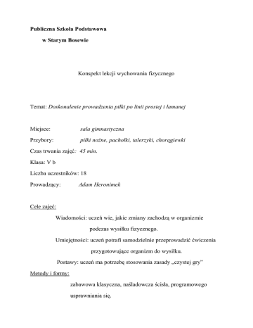 Publiczna Szkoła Podstawowa w Starym Bosewie Konspekt lekcji wychowania fizycznego Temat: Doskonalenie prowadzenia piłki po linii prostej i łamanej Miejsce: sala gimnastyczna Przybory: piłki nożne, pachołki, talerzyki, chorągiewki Czas trwania zajęć: 45 min. Klasa: V b Liczba uczestników: 18 Prowadzący: Adam Heronimek Cele zajęć: Wiadomości: uczeń wie, jakie zmiany zachodzą w organizmie podczas wysiłku fizycznego. Umiejętności: uczeń potrafi samodzielnie przeprowadzić ćwiczenia przygotowujące organizm do wysiłku. Postawy: uczeń ma potrzebę stosowania zasady „czystej gry” Metody i formy: zabawowa klasyczna, naśladowcza ścisła, programowego usprawniania się. Zapis podstawy programowej: 2. Trening zdrowotny. 3) demonstruje po jednym ćwiczeniu kształtującym wybrane zdolności motoryczne oraz ułatwiające utrzymywanie prawidłowej postawy; 5. Sport. Uczeń: 2) uczestniczy w sportowych rozgrywkach klasowych w roli zawodnika stosując zasady „czystej gry”: szacunku dla rywala, respektowania przepisów gry, podporządkowania się decyzjom sędziego, podziękowania za wspólną grę. Część wstępna 12 min. Czynności organizacyjno-porządkowe – 2 min. Zbiórka w szeregu Przywitanie, sprawdzenie obecności Podanie tematu zajęć Rozgrzewka ĆWICZENIA KOORDYNACYJNE – 6 min. Uczniowie wykonują w truchcie po 4 serie ćwiczeń koordynacji ruchowej ZABAWA OŻYWIAJĄCA „NAJLEPSZY DRYBLER” – 4 min. Każdy zawodnik stara się jak najdłużej utrzymać przy piłce, jednocześnie próbując wybić piłkę innym graczom. Część główna 25 min. ZABAWA MŁYN – 6 min. Zawodnicy ustawieni w 4 rzędach (w kształcie skrzydeł wiatraka) po kolei biegną z piłką po obwodzie koła, wracają do swojego rzędu i przekazują piłkę następnemu zawodnikowi. UKOŚNA SZTAFETA – 6 min. Zawodnicy muszą przebiec z piłką określony tor, po czym przekazują piłkę następnemu zawodnikowi ze swojej drużyny. ZABAWA „KTO LEPIEJ” – 6 min. Każdy zawodnik biegnie do leżącej piłki, wykonuje 5 podbić piłki nogą (żonglerka) i wraca do swojego rzędu. WYTRZYMAŁOŚCIOWA LAWINA – 7 min. Zawodnicy dwóch drużyn ćwiczą różne rodzaje podań. Część końcowa 8 min. ĆWICZENIA ROZCIĄGAJĄCE – 5 min. Ćwiczenia z piłką wykonywane w staniu (skłony, „ósemki” , krążenia tułowia), w siadzie i w leżeniu (toczenie piłki i przenoszenie jej stopami za głowę). Czynności organizacyjno-porządkowe – 3 min. Zbiórka. Plusy dla uczniów którzy wygrali poszczególne formy rywalizacji Omówienie zmian zachodzących w organizmie w czasie wysiłku fizycznego Pożegnanie. Wybrani uczniowie zbierają sprzęt. Praca domowa (dla chętnych): Przeprowadzenie statystyki wybranego meczu piłki nożnej pod kątem „spalonego