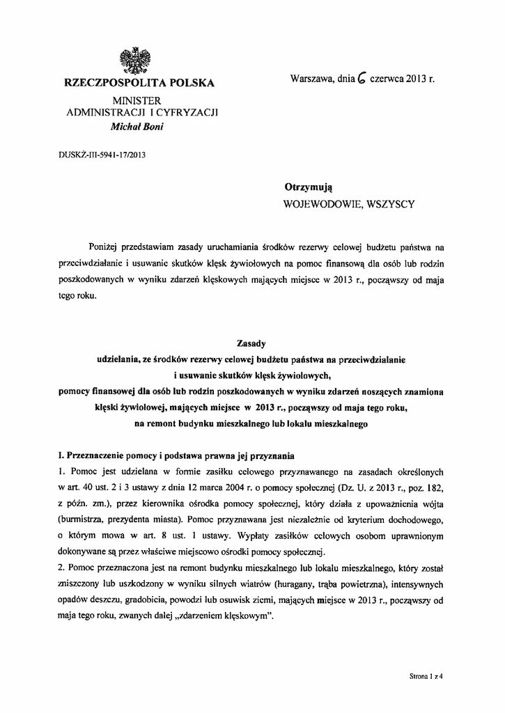 arsnua. - RZECZPOSPOLITA POLSKA A13 uT I c/Ln ca i M[NISTER ADM1N1STRCJ 1 I CYFRYZACJI Michal Boni DUSKŻ-]l1-594]-]7 2013 Otrzymują WOJEWODOWIE. WSZYSCY Poniżej przedstawiam zasady uruchamiania środków rezerwy celowej budżetu państwa na przeciwdziałanie i usuwanie skutków klęsk żywiołowych na pomoc finansową dla osób lub rodzin poszkodowanych xy wyniku zdarzeń klęskowych mających miejsce xy 2013 r.. począwszy od mąja tego roku. Zasady udzielania, ze środków rezerwy celowej budżetu państwa na przeciwdzialanic i usuwanie skutków klęsk żywiolowych, pomocy finansowej dla osób lub rodzin poszkodowanych w wyniku zdarzeń noszących znamiona klęski żywiolowej, mających miejsce w 2013 r., począwszy od maja tego roku, na remont budynku mieszkalnego lub lokalu mieszkalnego I. Przeznaczenie pomocy i podstawa prawna jej przyznania 1. Pomoc jest udzielana w formie zasiłku eclo%ego przyznawanego na zasadach określonych w art. 40 usŁ 2 i 3 ustawy z dnia ł2 marca 2004 r. o pomocy społecznej (Dz. U. z2013 r.. poz. 182. z późn. zm.). przez kierownika ośrodka pomocy społecznej. który działa z upoważnienia wójta (burmistrza. prendenta miasta). Pomoc przyznawana jest niezależnie od kiyteriuni dochodowego. o krónin mowa w art. 8 ust. dokonywane są przez I ustawy. \V\płan zasiłków celowych osobom uprawnionym właściwe miejscowo ośrodki pomocy społecznej. 2. Pomoc przeznaczona jest na remont budynku mieszkatnego lub lokalu mieszkalnego. któn został zniszczony lub uszkodzony w wyniku siliwch wiatrów (huragany. Irąha powietrzna), intensywnych opadów deszczu. gradobicia. powodzi lub osuwisk ziemi, mąjącyeh miejsce w 2013 r.. począwszy od maja tego roku, zwanych dalej ..zdarzeniem k1ęskowym”. 5irona 3. Ponioc przyznawana jest rodzinom lub osobom samotnie gospodarującym. prowadzącym. w dniu w\stąpienia zdarzenia kleskowego. gospodarstwo domowe w budynku mieszkalnym lub lokalu mieszkalnym zniszczonym lub uszkodzonym w wyniku tego zdarzenia. zwanymi dalej ..osohami uprawnionymi”. 1. Pomoc udzielana jest na wniosek osoby uprawnionej. / wnioskiem o udzielenie pomocy na remont budynku lokalu mieszkalnego może wystajic: a) właściciel budynku mieszkalnego lub lokalu mieszkalnego. h) osoba. której prnsługuje spółdzielcze własnościowe prawo do lokalu, którego przedmiotem jest lokal mieszkalny tub dom jednorodzinny. c) osoba, której przysługuje spółdzielcze lokatorskie prawo do lokalu mieszkalnego. d) osoba. która Jest najemcą lokalu mieszkalnego albo budynku mieszkalnego. e) osoba, na rzecz której ustanowione zostało prawo dożywocia. 5. Pomoc na remont hudynkwlokatu mieszkalnego może zostać udzielona osobom. o których mowa pkt 1 ppki d - e pod warunkiem uzyskania pisemnej zgody właściciela na przeprowadzenie remontu budynku mieszkalnego lub lokalu mieszkalnego. W przypadku wyrażenia zgody przez właściciela, nie będzie on mógł ubiegać się o pomoc. 6. Z kwoty przy znanego zasiłku może zostać sfinansowany remont lub zakup urządzeń niezbędnych do doprowadzenia energii, ciepła. wody oraz niezbędnej infrastrtLktun: technicznej towarnszącej budownictwu mieszkalnemu oraz koszty uporządkowania terenu. 7. Jeżeli w zniszczonym budynku lub lokalu mieszkalnym. gospodarstwo domowe nie było prowadzone w dniu zdarzenia. nie zachodzą przesłanki do przyznania pomocy. Pomoc nie przysługuje również na remont budynkówłlokali innych niż budynki mieszkalne lub lokale mieszkalne (np. budynków w budowie. domów rekreacyjnych i letniskowych. budynków/zabudowań gospodarczych) ani na remont obiektów o innym charakterze niż mieszkalny (np. dróg dojazdowych). 8. W przypadku, gdy w budynkwlokalu mieszkalnym prowadzonych jest faktycznie kilka gospodarstw domowych, pomocą może być objęte każde odrębne gospodarstwo domowe, jednakże łączna wxsokość środków przekroczyć wysokości przyznan\ch na remont hudynktrlokalu mieszkalnego nie może kosztów niezhędn\eh do usunięcia skutków zdarzenia klęskowego w budynku, lokalu mieszkalnym. 9. Pomoc może być prn”znawana w drodze jednej lub kilku odrębny-cli decyzji administracyjnych. który-ni nadąje się n”gor natychmiastowej wykonalności. 10. Pomoc przyznawana jest niezależnie od odszkodowania przysługującego z tytułu ubezpieczenia budynku:lokalu mieszkalnego od skutków” klęsk żywiołowych. 11. Pomoc może zostać przyznana na remont wyłączniejednego budynkuloknlu mieszkalnego. Sirona 2 z 4 12. Osoby uprawnione zobowiązane są do przedstawienia faktur i rachunków potwierdzających poniesienie wydatków związanych z remontem budynku lokalu mieszkalnego dokonanych z kwoty przyznanego zasiłku. S. W przypadku, gdy osoba uprawniona nie rozliczy poniesionych wydatków (nic przedstawi rachunków lub fbktur). albo przeznaczy pomoc na wydatki niezgodne z celem na jaki została ona udzielona. zwrot pomocy następuje na podstawie ustawy o pomocy społecznej. 11. Wysokość pomocy ze środków rezerwy celowej budżetu państwa na przeciwdziałanie i usuwanie skutków klęsk żywiolowych. 1. Pomoc na remont hudynku;tokalu mieszkalnego może być przyznana w wysokości do 20tys. zI. 2. Pomoc nie może przekroczyć wysokości szkód wyrządzonych żywiołem w danym budynku lub lokalu mieszkalnym, 3. Podstawą do określenia wysokości przyznawanej pomocy jest rodzinny wywiad środowiskowy przeprowadzony przez właściwy miejscowo ośrodek pomocy społecznej. 4. Zasiłek pomniejsza się o kwotę zasiłku celowego. o któnm mowa w zasadach Ministra Spraw Wewnętrznych z dnia 9 lipca 2012 r.. znak: RLSKŻ-łlł-5941-38 2012 (zasiłek celowy w wysokości do 6.000 zł): niniejsze zastrzeżenie nie dotyczy kwoty zasiłku. o którym mowa w ww. zasadach. przx”znanej na wydatki niezwiązane z: remontem hudynkalokalu mieszkalnego oraz remontem urządzeń i wykonaniem robót porządkowych. o których mowa w pkt 1.6. 5. Pomoc powinna być przyznawana w transzach. Wielkość pi