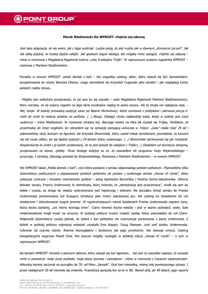 Marek Niedźwiecki dla WPROST: chętnie się odsunę Jest taka stagnacja, że nie wiem, jak z tego wybrnąć. Ludzie piszą, że jest nudno jak w dawnym „Koncercie życzeń”. Jak tak dalej pójdzie, to trzeba będzie odejść. Jak spotkam kogoś takiego, kto mógłby mnie zastąpić, chętnie się odsunę – mówi w rozmowie z Magdaleną Rigamonti twórca „Listy Przebojów Trójki”. W najnowszym wydaniu tygodnika WPROST – rozmowa z Markiem Niedźwieckim. Ponadto w nowym WPROST: polski domek z kart – kto wygrałby casting, aktor, który okazał się być donosicielem, przygotowania do wizyty Baracka Obamy, czego dowiedział się Krzysztof Cugowski jako senator i jak wyglądają kulisy polskich reality shows. - Mógłby pan polityków pozapraszać, to od razu by się ożywiło – radzi Magdalena Rigamonti Markowi Niedźwieckiemu, który narzeka, że od sześciu tygodni na jego liście przebojów rządzą te same utwory. Ale to chyba nie najlepsza rada. - Nie, dzięki. W soboty prowadzę audycję zaraz po Beacie Michniewicz, która rozmawia z politykami i pierwsza porcja emaili do mnie to reakcja właśnie na politykę. (…) Bluzgi. Dlatego chyba najbardziej lubię, kiedy w soboty jest cisza wyborcza – mówi Niedźwiecki. W rozmowie zdradza też, dlaczego kiedyś na kilka lat rozstał się Trójką. Myślałem, że przechodzę do innej rozgłośni, bo obraziłem się na sytuację panującą wówczas w Trójce: „Lista” miała mieć 25 lat i planowaliśmy duży koncert na Agrykoli, ale Krzysiek Skowroński, który został wtedy dyrektorem, powiedział, że koncert się nie może odbyć, bo się będzie kojarzył z 25-leciem stanu wojennego. (…) Skowroński zachowywał się jak rozbójnik. Rozpierduchę tu zrobił i ja byłem przekonany, że to jest powód do odejścia z Trójki.(…) Dostałem od słuchaczy straszną, przepraszam za słowo, zjebkę. Teraz dostaję kolejną za to, że poszedłem do programu Kuby Wojewódzkiego – przyznaje. I zdradza, dlaczego poszedł do Wojewódzkiego. Rozmowa z Markiem Niedźwieckim – w nowym WPROST. We WPROST także „Polski domek z kart”, czyli które postacie z serialu odpowiadają polskim politykom. Poprosiliśmy kilku dziennikarzy politycznych o dopasowanie polskich polityków do postaci z kultowego serialu „House of Cards”, który pokazuje cyniczne i brutalne mechanizmy polityki – piszą Agnieszka Burzyńska i Paulina Socha-Jakubowska. Główny bohater serialu, Francis Underwood, to demokrata, który twierdzi, że „demokracja jest przeceniona”, modli się sam do siebie i uważa, że droga do władzy wybrukowana jest hipokryzją i ofiarami. Na początku emisji serialu do Franka Underwooda porównywany był Grzegorz Schetyna jako mistrz zakulisowej gry. Ale casting na obsadzenie tej roli ostatecznie i zdecydowanie wygrał premier. W najokrutniejszych nawet działaniach Franka Underwooda wspiera żona, którą kocha bardziej, „niż rekiny kochają krew”. Claire również kocha władzę i jest w stanie poświęcić wiele, byle Underwoodowie mogli trwać na szczycie. W polskiej polityce trudno znaleźć osobę, która pasowałaby do roli Claire. Większość dziennikarzy uważa jednak, że żadna z żon polityków nie wytrzymuje porównania z panią Underwood. Z kobiet w polskiej polityce najwięcej wskazań uzyskała Ewa Kopacz. Doug Stamper, czyli szef sztabu Underwooda. Człowiek od czarnej roboty. Równie bezwzględny i skuteczny jak jego przełożony. Nie okazuje emocji. Casting bezapelacyjnie wygrywa Paweł Graś. Kto jeszcze mógłby wystąpić w polskiej edycji „House of Cards” – o tym w najnowszym WPROST. Na łamach WPROST również o pewnym aktorze, który okazał się być agentem… Jak pan to wszystko napisze, to wysadzi mnie w powietrze: moje życie osobiste, moje plany życiowe i zawodowe – mówi w rozmowie z Cezarym Łazarewiczem. Aktorską karierę zaczynał na początku lat 70. od filmu „Janosik”. Grał tam niewielką, niemą rolę powieszonego juhasa. I przez następnych 30 lat niewiele się zmieniło. Prawdziwą gwiazdą był za to w SB. Nawet dziś, po 40 latach, jego raporty Platforma Mediowa Point Group SA Batory Office Building II, 02-486 Warszawa, Al. Jerozolimskie 212 tel. (+48 22) 347 50 00, fax (+48 22) 347 50 01, www.point-group.pl NIP: 521-00-88-831, REGON: 010768408, KRS: 0000051017, Kapitał zakładowy: 103 897 325 zł robią wrażenie. Odzierał w nich swoich znajomych z prywatności. Informował o najbardziej intymnych sprawach. Kto, z kim i dlaczego – pisze Łazarewicz. Na jego liście znalazła się cała plejada polskich aktorów - od Tadeusza Łomnickiego poprzez Krzysztofa Kolbergera, Zygmunta Hübnera, Adama Hanuszkiewicza, Krystynę Jandę aż po Halinę Mikołajską i Andrzeja Seweryna. Są muzycy (Jacek Kleyff i Maciej Zembaty), dziennikarze (Bogusław Kaczyński) i kabareciarze (Stanisław Tym). Oraz podziemna elita z lat 70. W nowym WPROST – sylwetka aktora, który został donosicielem. We WPROST także o tym, jak wyglądają przygotowania do wizyty Baracka Obamy w Polsce. Na skali trudności w pracy służb na samej górze są tylko dwie takie imprezy – wizyta prezydenta Stanów Zjednoczonych lub Rosji. Ta druga z powodów politycznych przez najbliższe miesiące nam nie grozi. Za to w przyszły wtorek i środę w Polsce będzie prezydent USA. Poprzednia wizyta amerykańskiego prezydenta, dokładnie trzy lata temu, była dla warszawiaków koszmarem. Nad miastem krążyły policyjne śmigłowce, z ruchu zostały wyłączone całe kwartały ulic, choćby Trasa Łazienkowska na odcinkach, którymi amerykański przywódca wcale nie jechał. W tym roku żadnych szopek ma nie być. Miasto nie zostanie zamknięte jak przed trzema laty. Za to, podobnie jak wtedy, przed lądowaniem Air Force One w Warszawie na Okęciu „usiądzie” amerykański samolot transportowy, który przywiezie m.in. prezydenckie limuzyny. Kiedy samolot Obamy nadleci nad wojskowe lotni
