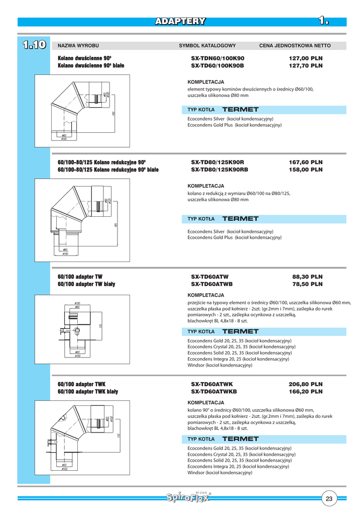 NAZWA WYROBU Kolano dwuÊcienne 90O Kolano dwuÊcienne 90O białe SYMBOL KATALOGOWY CENA JEDNOSTKOWA NETTO SX-TDN60/100K90 SX-TD60/100K90B 127,00 PLN 127,70 PLN KOMPLETACJA element typowy kominów dwuściennych o średnicy Ø60/100, uszczelka silikonowa Ø80 mm TYP KOT¸A TERMET Ecocondens Silver (kocioł kondensacyjny) Ecocondens Gold Plus (kocioł kondensacyjny) 60/100-80/125 Kolano redukcyjne 90O 60/100-80/125 Kolano redukcyjne 90O bia∏e SX-TD80/125K90R SX-TD80/125K90RB 167,60 PLN 158,00 PLN KOMPLETACJA kolano z redukcją z wymiaru Ø60/100 na Ø80/125, uszczelka silikonowa Ø80 mm TYP KOT¸A TERMET Ecocondens Silver (kocioł kondensacyjny) Ecocondens Gold Plus (kocioł kondensacyjny) 60/100 adapter TW 60/100 adapter TW biały SX-TD60ATW SX-TD60ATWB 88,30 PLN 78,50 PLN KOMPLETACJA przejście na typowy element o średnicy Ø60/100, uszczelka silikonowa Ø60 mm, uszczelka płaska pod kołnierz - 2szt. (gr.2mm i 7mm), zaślepka do rurek pomiarowych - 2 szt., zaślepka ocynkowa z uszczelką, blachowkręt BL 4,8x18 - 8 szt. TYP KOT¸A TERMET Ecocondens Gold 20, 25, 35 (kocioł kondensacyjny) Ecocondens Crystal 20, 25, 35 (kocioł kondensacyjny) Ecocondens Solid 20, 25, 35 (kocioł kondensacyjny) Ecocondens Integra 20, 25 (kocioł kondensacyjny) Windsor (kocioł kondensacyjny) 60/100 adapter TWK 60/100 adapter TWK biały SX-TD60ATWK SX-TD60ATWKB 206,80 PLN 166,20 PLN KOMPLETACJA kolano 90° o średnicy Ø60/100, uszczelka silikonowa Ø60 mm, uszczelka płaska pod kołnierz - 2szt. (gr.2mm i 7mm), zaślepka do rurek pomiarowych - 2 szt., zaślepka ocynkowa z uszczelką, blachowkręt BL 4,8x18 - 8 szt. TYP KOT¸A TERMET Ecocondens Gold 20, 25, 35 (kocioł kondensacyjny) Ecocondens Crystal 20, 25, 35 (kocioł kondensacyjny) Ecocondens Solid 20, 25, 35 (kocioł kondensacyjny) Ecocondens Integra 20, 25 (kocioł kondensacyjny) Windsor (kocioł kondensacyjny) 23 NAZWA WYROBU 60/100 adapter TTW 60/100 adapter TTW biały SYMBOL KATALOGOWY SX-TD60ATTW SX-TD60ATTWB CENA JEDNOSTKOWA NETTO 264,80 PLN 186,40 PLN KOMPLETACJA trójnik z deklem o średnicy Ø60/100, uszczelka silikonowa Ø60 mm, uszczelka płaska pod kołnierz - 2szt. (gr.2mm i 7mm), zaślepka do rurek pomiarowych - 2 szt., zaślepka ocynkowa z uszczelką, blachowkręt BL 4,8x18 - 8 szt. TYP KOT¸A TERMET Ecocondens Gold 20, 25, 35 (kocioł kondensacyjny) Ecocondens Crystal 20, 25, 35 (kocioł kondensacyjny) Ecocondens Solid 20, 25, 35 (kocioł kondensacyjny) Ecocondens Integra 20, 25 (kocioł kondensacyjny) Windsor (kocioł kondensacyjny) 80/110-80/125 adapter TW 80/110-80/125 adapter TW biały SX-TD80ATW SX-TD80ATWB 112,60 PLN 93,70 PLN KOMPLETACJA przejście na typowy element o średnicy Ø80/125, uszczelka silikonowa Ø80 mm, uszczelka płaska pod kołnierz - 2szt. (gr.2mm i 7mm), zaślepka do rurek pomiarowych - 2 szt., zaślepka ocynkowa z uszczelką, blachowkręt BL 4,8x18 - 8 szt. TYP KOT¸A TERMET Ecocondens Gold 20, 25, 35 (kocioł kondensacyjny) Ecocondens Crystal 20, 25, 35 (kocioł kondensacyjny) Ecocondens Solid 20, 25, 35 (kocioł kondensacyjny) Ecocondens Integra 20, 25 (kocioł kondensacyjny) Windsor (kocioł kondensacyjny) 80/110-80/125 adapter TWK 80/110-80/125 adapter TWK biały SX-TD80ATWK SX-TD80ATWKB 224,70 PLN 177,50 PLN KOMPLETACJA kolano 90O z redukcją z wymiaru Ø80/110 na Ø80/125 mm, uszczelka silikonowa Ø80 mm, uszczelka płaska pod kołnierz - 2szt. (gr.2mm i 7mm), zaślepka do rurek pomiarowych - 2 szt., zaślepka ocynkowa z uszczelką, blachowkręt BL 4,8x18 - 8 szt. TYP KOT¸A TERMET Ecocondens Gold 20, 25, 35 (kocioł kondensacyjny) Ecocondens Crystal 20, 25, 35 (kocioł kondensacyjny) Ecocondens Solid 20, 25, 35 (kocioł kondensacyjny) Ecocondens Integra 20, 25 (kocioł kondensacyjny) Windsor (kocioł kondensacyjny) 80/110-80/125 adapter TTW 80/110-80/125 adapter TTW biały SX-TD80ATTW SX-TD80ATTWB 303,50 PLN 210,50 PLN KOMPLETACJA trójnik z deklem o średnicy Ø80/125, uszczelka silikonowa Ø80 mm, uszczelka płaska pod kołnierz - 2szt. (gr.2mm i 7mm), zaślepka do rurek pomiarowych - 2 szt., zaślepka ocynkowa z uszczelką, blachowkręt BL 4,8x18 - 8 szt. TYP KOT¸A TERMET Ecocondens Gold 20, 25, 35 (kocioł kondensacyjny) Ecocondens Crystal 20, 25, 35 (kocioł kondensacyjny) Ecocondens Solid 20, 25, 35 (kocioł kondensacyjny) Ecocondens Integra 20, 25 (kocioł kondensacyjny) Windsor (kocioł kondensacyjny) 24 NAZWA WYROBU SYMBOL KATALOGOWY Adapter T rozdzielczy spalinowy CENA JEDNOSTKOWA NETTO SX-TJ-ATWS 47,40 PLN KOMPLETACJA przejście na typowy element o średnicy Ø80, uszczelka silikonowa Ø80 mm, uszczelka płaska pod kołnierz, zaślepka do rurki pomiarowej - 1 szt., śruba M4x18 - 8 szt. TYP KOT¸A TERMET Ecocondens Gold 20, 25, 35 (kocioł kondensacyjny) Ecocondens Crystal 20, 25, 35 (kocioł kondensacyjny) Ecocondens Solid 20, 25, 35 (kocioł kondensacyjny) Ecocondens Integra 20, 25 (kocioł kondensacyjny) Windsor (kocioł kondensacyjny) Adapter T rozdzielczy powietrzny SX-TJ-ATWP 39,00 PLN KOMPLETACJA przejście na typowy element o średnicy Ø80, uszczelka silikonowa Ø80 mm, uszczelka płaska pod kołnierz, zaślepka do rurki pomiarowej - 1 szt., śruba M4x18 - 4 szt. TERMET TYP KOT¸A Ecocondens Gold 20, 25, 35 (kocioł kondensacyjny) Ecocondens Crystal 20, 25, 35 (kocioł kondensacyjny) Ecocondens Solid 20, 25, 35 (kocioł kondensacyjny) Ecocondens Integra 20, 25 (kocioł kondensacyjny) Windsor (kocioł kondensacyjny) T rozdzielczy spalinowy T rozdzielczy spalinowy biały T rozdz. spalinowy z odskraplaczem T rozdz. spalinowy z odskrapl. biały Uwaga – rysunek poglądowy dla adaptera bez odskraplacza. * - wymiar adaptera z odskraplaczem Adapter Adapter Adapter Adapter Uwaga – rysunek poglądowy dla adaptera bez odskraplacza. * - wymiar adaptera z odskraplaczem 60/100 adapter T 60/100 adapter T biały 60/100 adapter T z odskraplaczem 60/100 adapter T z odskraplaczem biały SX-TJ-ATS SX-TJ-ATSB SX-TJ-ATSO SX-TJ-ATSOB Minimax Elegance (kocioł turbo) Miniterm Elegance (kocioł turbo