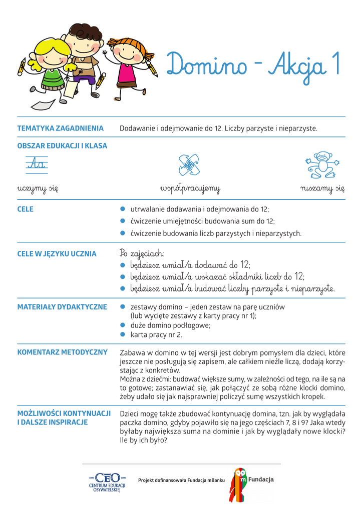 D £ omino - Akcja 1 TEMATYKA ZAGADNIENIA Dodawanie i odejmowanie do 12. Liczby parzyste i nieparzyste. OBSZAR EDUKACJI I KLASA uczymy się współpracujemy ruszamy się CELE utrwalanie dodawania i odejmowania do 12; ćwiczenie umiejętności budowania sum do 12; ćwiczenie budowania liczb parzystych i nieparzystych. CELE W JĘZYKU UCZNIA Po zajęciach: będziesz umiał/a dodawać do 12; będziesz umiał/a wskazać składniki liczb do 12; będziesz umiał/a budować liczby parzyste i nieparzyste. MATERIAŁY DYDAKTYCZNE KOMENTARZ METODYCZNY zestawy domino – jeden zestaw na parę uczniów (lub wycięte zestawy z karty pracy nr 1); duże domino podłogowe; karta pracy nr 2. Zabawa w domino w tej wersji jest dobrym pomysłem dla dzieci, które jeszcze nie posługują się zapisem, ale całkiem nieźle liczą, dodają korzystając z konkretów. Można z dziećmi: budować większe sumy, w zależności od tego, na ile są na to gotowe; zastanawiać się, jak połączyć ze sobą różne klocki domino, żeby udało się jak najsprawniej policzyć sumę wszystkich kropek. MOŻLIWOŚCI KONTYNUACJI Dzieci mogę także zbudować kontynuację domina, tzn. jak by wyglądała I DALSZE INSPIRACJE paczka domino, gdyby pojawiło się na jego częściach 7, 8 i 9? Jaka wtedy byłaby największa suma na dominie i jak by wyglądały nowe klocki? Ile by ich było? Projekt dofinansowała Fundacja mBanku ORGANIZACJA PRACY UCZNIÓW 1 Usiądź z dziećmi w kręgu. Zapytaj, czy grają w domu w domino. Kilkoro z nich niech opowie, co jest na poszczególnych „mydełkach” (nie zawsze kropki). Poproś dziecko, grające często w domino o wyjaśnienie zasad gry. Może to zrobić demonstrując je na podłodze z wykorzystaniem klasowego domino. Zapowiedz, że dziś spróbujecie wykorzystać domino do zadań matematycznych. 2 Poproś, aby każde dziecko wylosowało sobie klocek domino i opowiedziało, co na nim jest (ile kropek po każdej stronie; ile kropek razem). Następnie poproś dzieci, by ustawiły się w rzędzie: od najmniejszej sumy kropek do największej. Zwróć uwagę dzieciom na to, że niektóre osoby mają po tyle samo kropek. Daj im czas, by to same zaobserwowały, nie wyprzedzaj ich, poczekaj na pytania, niech sami poszukają na nie odpowiedzi. 3 Zaproś dzieci do pracy w zespołach 2-3 osobowych. Każdy zespół otrzymuje zestaw domino i kartę pracy nr 2. To co przed chwilą dzieci ćwiczyły w przestrzeni klasy będą mogły ułożyć/zapisać w grupach. Korzystając z zestawu domino dzieci muszą wypełnić „ciężarówkę” (Uwaga! zostanie w niej dużo miejsc pustych). Po zakończonym zadaniu zapytaj dzieci, jak dużo mamy sposobów na budowanie z dwóch składników sumy 7, a jak dużo – sumy 8 (wykorzystując domino). Czy mają jeszcze jakiś inny sposób na budowanie „8”, który nie może być pokazany na domino i dlaczego nie można go pokazać na domino) itp. 4 Rozdaj każdemu dziecku jeden klocek dużego domina. Poproś by dzieci połączyły się w trójki tak, by suma kropek wynosiła 12. Daj im chwilę czasu. Zobacz komu się udało, a komu nie i dlaczego (możesz wyjąć domino z sumą kropek 11 i 12, by wszystkie dzieci mogły być aktywne). 5 Zapytaj uczniów, czy 12 jest liczbą parzystą, pokaż im domino z „12” (dobrze widać na nim ułożenie kropek w pary). Następnie poproś dzieci, by dobrały się w pary tak, by suma kropek na ich klockach domino była liczbą parzystą. Na koniec sprawdźcie: Kto zbudował największą sumę? Jaką największą sumę (parzystą, nieparzystą) można zbudować z kropek na dwóch klockach domino? Jaką najmniejszą sumę (parzystą, nieparzystą) można zbudować z kropek na dwóch klockach domino? Dzieci także same mogą wymyślać pytania/zadania dla kolegów. Projekt dofinansowała Fundacja mBanku Domino–Akcja 1 Karta pracy nr 1 Projekt dofinansowała Fundacja mBanku Domino–Akcja 1 Karta pracy nr 2 Suma kropek jest równa 1 Suma kropek jest równa 2 Suma kropek jest równa 3 Suma kropek jest równa 4 Suma kropek jest równa 5 Suma kropek jest równa 6 Suma kropek jest równa 7 Suma kropek jest równa 8 Suma kropek jest równa 9 Suma kropek jest równa 10 Suma kropek jest równa 11 Suma kropek jest równa 12 Projekt dofinansowała Fundacja mBanku