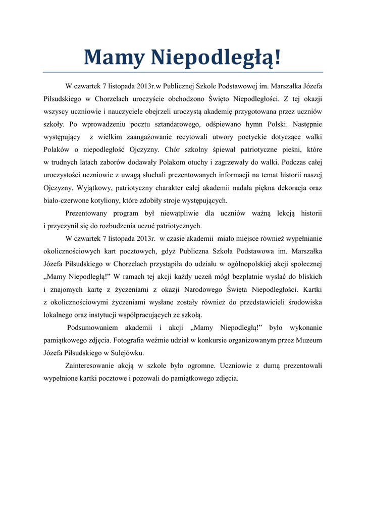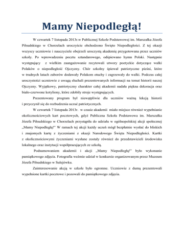 Mamy Niepodległą! W czwartek 7 listopada 2013r.w Publicznej Szkole Podstawowej im. Marszałka Józefa Piłsudskiego w Chorzelach uroczyście obchodzono Święto Niepodległości. Z tej okazji wszyscy uczniowie i nauczyciele obejrzeli uroczystą akademię przygotowana przez uczniów szkoły. Po wprowadzeniu pocztu sztandarowego, odśpiewano hymn Polski. Następnie występujący z wielkim zaangażowanie recytowali utwory poetyckie dotyczące walki Polaków o niepodległość Ojczyzny. Chór szkolny śpiewał patriotyczne pieśni, które w trudnych latach zaborów dodawały Polakom otuchy i zagrzewały do walki. Podczas całej uroczystości uczniowie z uwagą słuchali prezentowanych informacji na temat historii naszej Ojczyzny. Wyjątkowy, patriotyczny charakter całej akademii nadała piękna dekoracja oraz biało-czerwone kotyliony, które zdobiły stroje występujących. Prezentowany program był niewątpliwie dla uczniów ważną lekcją historii i przyczynił się do rozbudzenia uczuć patriotycznych. W czwartek 7 listopada 2013r. w czasie akademii miało miejsce również wypełnianie okolicznościowych kart pocztowych, gdyż Publiczna Szkoła Podstawowa im. Marszałka Józefa Piłsudskiego w Chorzelach przystąpiła do udziału w ogólnopolskiej akcji społecznej „Mamy Niepodległą!” W ramach tej akcji każdy uczeń mógł bezpłatnie wysłać do bliskich i znajomych kartę z życzeniami z okazji Narodowego Święta Niepodległości. Kartki z okolicznościowymi życzeniami wysłane zostały również do przedstawicieli środowiska lokalnego oraz instytucji współpracujących ze szkołą. Podsumowaniem akademii i akcji „Mamy Niepodległą!” było wykonanie pamiątkowego zdjęcia. Fotografia weźmie udział w konkursie organizowanym przez Muzeum Józefa Piłsudskiego w Sulejówku. Zainteresowanie akcją w szkole było ogromne. Uczniowie z dumą prezentowali wypełnione kartki pocztowe i pozowali do pamiątkowego zdjęcia.