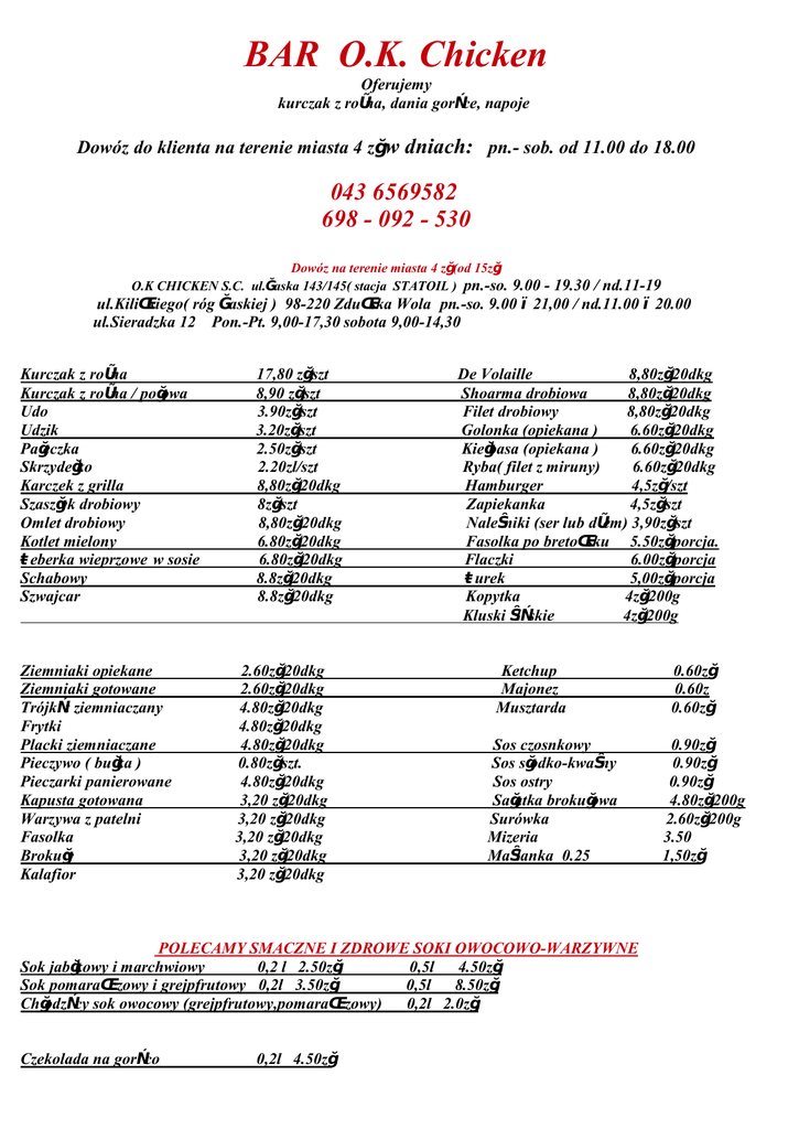 BAR O.K. Chicken Oferujemy kurczak z rożna, dania gorące, napoje Dowóz do klienta na terenie miasta 4 zł w dniach: pn.- sob. od 11.00 do 18.00 043 6569582 698 - 092 - 530 Dowóz na terenie miasta 4 zł (od 15zł) O.K CHICKEN S.C. ul.Łaska 143/145( stacja STATOIL ) pn.-so. 9.00 - 19.30 / nd.11-19 ul.Kilińkiego( róg Łaskiej ) 98-220 Zduńska Wola pn.-so. 9.00 – 21,00 / nd.11.00 – 20.00 ul.Sieradzka 12 Pon.-Pt. 9,00-17,30 sobota 9,00-14,30 Kurczak z rożna Kurczak z rożna / połowa Udo Udzik Pałeczka Skrzydełko Karczek z grilla Szaszłyk drobiowy Omlet drobiowy Kotlet mielony Żeberka wieprzowe w sosie Schabowy Szwajcar Ziemniaki opiekane Ziemniaki gotowane Trójkąt ziemniaczany Frytki Placki ziemniaczane Pieczywo ( bułka ) Pieczarki panierowane Kapusta gotowana Warzywa z patelni Fasolka Brokuły Kalafior 17,80 zł/szt 8,90 zł/szt 3.90zł/szt 3.20zł/szt 2.50zł/szt 2.20zl/szt 8,80zł/20dkg 8zł/szt 8,80zł/20dkg 6.80zł/20dkg 6.80zł/20dkg 8.8zł/20dkg 8.8zł/20dkg 2.60zł/20dkg 2.60zł/20dkg 4.80zł/20dkg 4.80zł/20dkg 4.80zł/20dkg 0.80zł/szt. 4.80zł/20dkg 3,20 zł/20dkg 3,20 zł/20dkg 3,20 zł/20dkg 3,20 zł/20dkg 3,20 zł/20dkg De Volaille 8,80zł/20dkg Shoarma drobiowa 8,80zł/20dkg Filet drobiowy 8,80zł/20dkg Golonka (opiekana ) 6.60zł/20dkg Kiełbasa (opiekana ) 6.60zł/20dkg Ryba( filet z miruny) 6.60zł/20dkg Hamburger 4,5zł /szt Zapiekanka 4,5zł/szt Naleśniki (ser lub dżem) 3,90zł/szt Fasolka po bretońsku 5.50zł/porcja. Flaczki 6.00zł/porcja Żurek 5,00zł/porcja Kopytka 4zł/200g Kluski śląskie 4zł/200g Ketchup Majonez Musztarda Sos czosnkowy Sos słodko-kwaśny Sos ostry Sałatka brokułowa Surówka Mizeria Maślanka 0.25 POLECAMY SMACZNE I ZDROWE SOKI OWOCOWO-WARZYWNE Sok jabłkowy i marchwiowy 0,2 l 2.50zł. 0,5l 4.50zł. Sok pomarańczowy i grejpfrutowy 0,2l 3.50zł. 0,5l 8.50zł. Chłodzący sok owocowy (grejpfrutowy,pomarańczowy) 0,2l 2.0zł. Czekolada na gorąco 0,2l 4.50zł 0.60zł 0.60z 0.60zł 0.90zł 0.90zł 0.90zł 4.80zł/200g 2.60zł/200g 3.50 1,50zł
