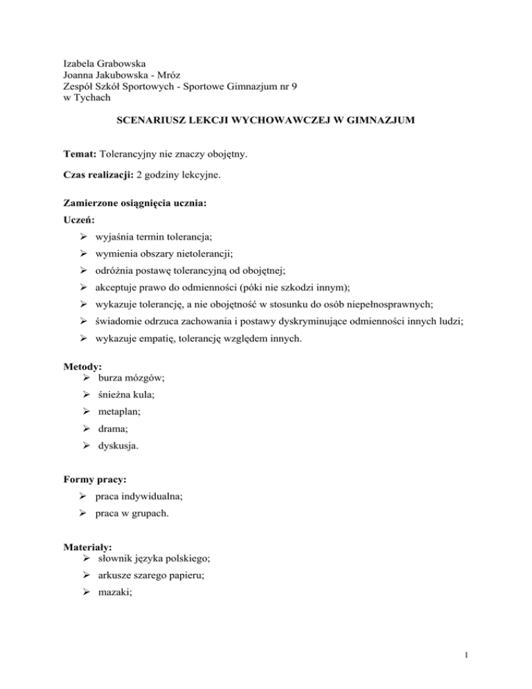 Izabela Grabowska Joanna Jakubowska - Mróz Zespół Szkół Sportowych - Sportowe Gimnazjum nr 9 w Tychach SCENARIUSZ LEKCJI WYCHOWAWCZEJ W GIMNAZJUM Temat: Tolerancyjny nie znaczy obojętny. Czas realizacji: 2 godziny lekcyjne. Zamierzone osiągnięcia ucznia: Uczeń: ¾ wyjaśnia termin tolerancja; ¾ wymienia obszary nietolerancji; ¾ odróżnia postawę tolerancyjną od obojętnej; ¾ akceptuje prawo do odmienności (póki nie szkodzi innym); ¾ wykazuje tolerancję, a nie obojętność w stosunku do osób niepełnosprawnych; ¾ świadomie odrzuca zachowania i postawy dyskryminujące odmienności innych ludzi; ¾ wykazuje empatię, tolerancję względem innych. Metody: ¾ burza mózgów; ¾ śnieżna kula; ¾ metaplan; ¾ drama; ¾ dyskusja. Formy pracy: ¾ praca indywidualna; ¾ praca w grupach. Materiały: ¾ słownik języka polskiego; ¾ arkusze szarego papieru; ¾ mazaki; 1 ¾ kserokopie materiałów dla ucznia – Załącznik nr 1 (karteczki z krótkimi charakterystykami osób niepełnosprawnych); ¾ magnetofon, kaseta z piosenką Stanisława Sojki pt. „Tolerancja”; ¾ kserokopia karty ewaluacyjnej dla każdego ucznia (Materiały dla nauczyciela Załącznik nr 2). Przebieg pierwszej godziny lekcyjnej: Wprowadzenie: 1. Sprawy organizacyjno-porządkowe. 2. Zapoznanie uczniów z celami lekcji. 3. Wprowadzenie do tematu lekcji - wysłuchanie fragmentu piosenki Stanisława Sojki pt. „Tolerancja”. Część właściwa: 4. Zapisanie na tablicy skojarzeń ze słowem tolerancja podawanych przez uczniów. 5. Podział klasy na 5 osobowe grupy. 6. Przypomnienie zasad pracy w grupie (Materiały dla nauczyciela - Załącznik nr 1). 7. Wykonanie przez uczniów w grupach ćwiczenia pierwszego: ¾ uczniowie każdej grupy formułują metodą „śnieżnej kuli” definicję słowa tolerancja; ¾ uczniowie zapisują własną (grupową) definicję na arkuszach szarego papieru. 8. Liderzy grup przedstawiają na forum klasy wyniki pracy przyczepiając do tablicy za pomocą magnesów arkusze szarego papieru z wypracowanymi definicjami. 9. Odczytanie definicji słowa tolerancja ze słownika języka polskiego, jeśli zaistnieje konieczność – uzupełnienie definicji sformułowanej przez uczniów. 10. Wykonanie przez uczniów w grupach ćwiczenia drugiego: ¾ uczniowie w grupach podają możliwe obszary nietolerancji; ¾ uczniowie wypisują obszary nietolerancji na arkuszach szarego papieru; ¾ uczniowie wybierają 1– 2 obszary nietolerancji i zastanawiają się nad metodami przeciwdziałania pracując metodą metaplanu, tzn.: odpowiadając na pytania: Jak jest?, Jak być powinno?, Dlaczego nie jest tak jak być powinno? Podsumowanie: 11. Liderzy grup przedstawiają na forum klasy wyniki pracy i przedstawiają wnioski. 2 Przebieg drugiej godziny lekcyjnej: Wprowadzenie: 1. Sprawy organizacyjno-porządkowe. 2. Zapoznanie uczniów z celami lekcji. 3. Przypomnienie definicji pojęcia tolerancja i zapisanie na tablicy słów Joshuy Liebmana „TOLERANCJA – to wysiłek płynący prosto z serca, by zrozumieć przekonania, działania i zwyczaje drugiego człowieka bez konieczności ich powielania lub akceptowania”. 4. Przypomnienie obszarów nietolerancji wypisanych przez uczniów na arkuszach szarego papieru na poprzedniej lekcji. Część właściwa: 5. Podział klasy na 4 - 6 osobowe grupy. 6. Przypomnienie zasad pracy w grupie (Materiały dla nauczyciela - Załącznik nr 1). 7. Losowanie krótkich opisów postaci dzieci niepełnosprawnych (Materiały dla ucznia Załącznik nr 1). Uwaga! Należy tak zorganizować pracę, aby ilość grup była parzysta, a każdy opis był przydzielony dwóm grupom. 8. Wykonanie przez uczniów w grupach ćwiczenia pierwszego: ¾ połowa grup wypisuje proponowane zachowania rówieśników względem osoby niepełnosprawnej, której opis wylosowali; ¾ druga połowa grup wypisuje oczekiwane przez osobę niepełnosprawną zachowania rówieśników. 9. Grupy, które wylosowały opis tej samej osoby porównują wyniki swojej pracy. 10. Chętni uczniowie przydzielają sobie role, by odegrać je w krótkich scenkach pokazujących wzajemne relacje między osobą niepełnosprawną, a zdrowymi rówieśnikami w różnych sytuacjach (wykorzystując wyniki z poprzedniego ćwiczenia). 11. Omówienie odegranych ról: Uczniowie odpowiadają na pytania: • Jak czułeś się w roli osoby niepełnosprawnej? • Jak czułeś się w obecności osoby niepełnosprawnej? • Czy jesteś zadowolony ze swojej reakcji względem osoby niepełnosprawnej? 3 Podsumowanie: 12. Wykonanie przez uczniów w grupach ćwiczenia drugiego: ¾ ułożenie hasła na temat tolerancji; ¾ zapisanie hasła na arkuszach szarego papieru; ¾ prezentacja hasła - przyczepienie do tablicy za pomocą magnesów arkuszy szarego papieru z wypracowanymi hasłami. 13. Uczniowie wyrażają swoją opinię na temat zajęć (Materiały dla nauczyciela - Załącznik nr 2) Bibliografia: 1. Materiały z konferencji „Psychologiczne aspekty tolerancji w życiu szkoły”, Regionalny Ośrodek Metodyczno – Edukacyjny „Metis”, Katowice, 17-18 kwietnia 2002. 2. Magdalena Grycman, Katarzyna Kaniecka, „Porozmawiajmy”, Oficyna Wydawnicza EXCALIBUR, Bydgoszcz 2001. 4 Materiały dla ucznia - Załącznik nr 1. PIOTREK Piotrek mówi bardzo niewyraźnie. To, co mówi bardzo trudno zrozumieć, ponieważ Jego język i usta nie ruszają się wystarczająco dobrze. Gdy Piotrek mówi pomaga sobie miną, rękoma i całym ciałem. Lubi czytać i chodzić do kina. MAGDA Magda nie mówi i nie może też dobrze ruszać rękoma i nogami. Ma ze sobą specjalną tablicę. Na niej są narysowane znaki. To są symbole Blissa. Nad każdym symbolem jest napis. Można przeczytać, co znaczy ten symbol. Te symbole we wszystkich językach są takie same, dlatego Magda może rozmawiać przy ich pomocy z ludźmi z różnych krajów. Magda pokazuje symbole ręką. Bardzo lubi zwierzęta, ma w domu chomika, patyczaki i psa. MARCIN Marcin nie sły