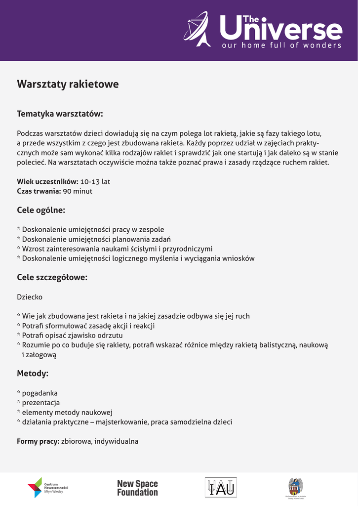 Warsztaty rakietowe Tematyka warsztatów: Podczas warsztatów dzieci dowiadują się na czym polega lot rakietą, jakie są fazy takiego lotu, a przede wszystkim z czego jest zbudowana rakieta. Każdy poprzez udział w zajęciach praktycznych może sam wykonać kilka rodzajów rakiet i sprawdzić jak one startują i jak daleko są w stanie polecieć. Na warsztatach oczywiście można także poznać prawa i zasady rządzące ruchem rakiet. Wiek uczestników: 10-13 lat Czas trwania: 90 minut Cele ogólne: * Doskonalenie umiejętności pracy w zespole * Doskonalenie umiejętności planowania zadań * Wzrost zainteresowania naukami ścisłymi i przyrodniczymi * Doskonalenie umiejętności logicznego myślenia i wyciągania wniosków Cele szczegółowe: Dziecko * Wie jak zbudowana jest rakieta i na jakiej zasadzie odbywa się jej ruch * Potrafi sformułować zasadę akcji i reakcji * Potrafi opisać zjawisko odrzutu * Rozumie po co buduje się rakiety, potrafi wskazać różnice między rakietą balistyczną, naukową i załogową Metody: * pogadanka * prezentacja * elementy metody naukowej * działania praktyczne – majsterkowanie, praca samodzielna dzieci Formy pracy: zbiorowa, indywidualna Przebieg zajęć: Lp. Czynności wykonywane przez prowadzącego Czynności wykonywane przez dzieci Czas trwania (min.) 1 Przedstawienie się, przywitanie się z dziećmi, wprowadzenie do tematyki zajęć. Witają się, zgadują, odpowiadają czym zajmuje się astronom, astronauta oraz jak bada się Kosmos itp. 5 2 Przedstawienie tematyki warsztatów - tworzenie mapy myśli związanej z hasłem „rakieta” (tzw. mapa myśli „przed”; zapisywanie skojarzeń dzieci wokół hasła głównego na brystolu/tablicy). Podają skojarzenia z obrazami widocznymi na slajdach oraz z hasłem „rakieta”. 3 3 Przedstawienie slajdów o krótkiej historii astronautyki. Oglądają i słuchają. Zadają pytania, dyskutują. 10 4 Zajęcia praktyczne – budowanie rakiet pneumatycznych. Wykorzystanie karty pracy „Pneumatic-1”. Wykonują rakiety zgodnie z instrukcją prowadzącego i testują je. W miarę możliwości testy rakiet pneumatycznych można przeprowadzić na korytarzu lub na szkolnym boisku. 20 5 Wyjaśnia podstawy działania rakiety pneumatycznej. Zadaje pytanie: na jakiej zasadzie działają/poruszają się współczesne rakiety? Czy znacie jakieś przykłady zastosowania tej zasady akcji i reakcji? Odpowiadają na pytania. Dyskutują o podobieństwach do prawdziwych rakiet. Podają przykłady. 4 6 Pokazuje slajd schematyczny dotyczący budowy rakiety. Omawia podstawowe człony rakiety. Słuchają. 5 Lp. Czynności wykonywane przez prowadzącego Czynności wykonywane przez dzieci Czas trwania (min.) 7 Zajęcia praktyczne – budowa rakiet balonowych i testowanie ich. Obserwacja zjawiska odrzutu. Wykonują rakiety w parach zgodnie z instrukcją prowadzącego (wykorzystują karton papieru, z którego należy wyciąć rakietę, przymocować ją do słomki za pomocą taśmy, potem całość przymocować do balonika; ruch rakiety odbywa się wzdłuż cienkiego sznurka lub nitki, na który należy nawlec słomkę z rakietą). Sprawdzają, która z rakiet szybciej się porusza oraz czy rakiety mogą się poruszać w pionie? 20 8 Wyjaśnia podstawy działania rakiety balonowej. Zadaje pytanie: czym napędzane są współczesne rakiety? Jak szybko się poruszają? Dlaczego poruszają się tak szybko? Zgadują i odpowiadają na pytania. 5 9 Zajęcia praktyczne – budowanie rakiet „musujących”. Pokazuje dzieciom jak wystrzeliwuje szczelnie zamknięta tubka po tabletkach musujących, w której zachodzi reakcja rozpuszczania tabletki musującej w wodzie. Można pokazać proces mieszania się sody z octem, który jest znacznie gwałtowniejszy więc rakieta mocniej wystrzeli. Sprawdzają sami działanie rakiet „musujących”. Wskazują co jest paliwem w takiej rakiecie i porównują do działania poprzednich rakiet. W miarę możliwości testy tych rakiet można przeprowadzić na szkolnym boisku (zwłaszcza w przypadku rakiet sodowooctowych). 5 10 Zadaje pytania podsumowujące: która z budowanych rakiet jest najlepsza i dlaczego? Dlaczego nasze rakiety spadają na ziemię? Czy nasze rakiety mogłyby polecieć w Kosmos? Jeśli nie to dlaczego? Wyjaśnia gdzie człowiek doleciał rakietami. Zgadują, odpowiadają, słuchają. 5 Lp. Czynności wykonywane przez prowadzącego Czynności wykonywane przez dzieci Czas trwania (min.) 11 Tworzenie mapy myśli związanej z hasłem „rakieta” (tzw. mapa myśli „po”; zapisywanie skojarzeń dzieci wokół hasła głównego na brystolu/tablicy). Podają ponownie skojarzenia ze słowem „rakieta”. 3 12 Ewaluacja zajęć wśród dzieci i opiekunów. Zakończenie. Dzieci odpowiadają na pytania podsumowujące (lub wypełniają krótką ankietę) i określają swoje zainteresowanie zajęciami. 5 RAZEM Pojęcia kluczowe do zastosowania: * budowa rakiety: głowica, korpus, silnik, zbiornik paliwa, stateczniki * przestrzeń kosmiczna, * grawitacja, * prędkość kosmiczna I i II, * zasada akcji i reakcji, * siła odrzutu, zjawisko odrzutu, * rakieta, wahadłowiec, satelita, kapsuła kosmiczna. 90