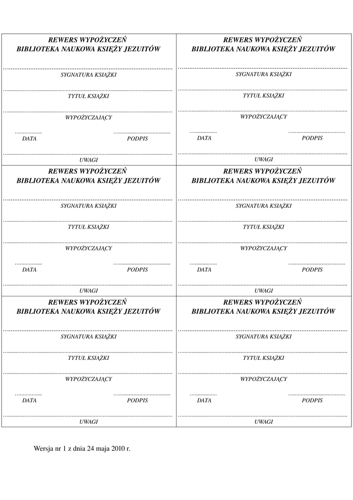 REWERS WYPOŻYCZEŃ BIBLIOTEKA NAUKOWA KSIĘŻY JEZUITÓW REWERS WYPOŻYCZEŃ BIBLIOTEKA NAUKOWA KSIĘŻY JEZUITÓW …............................................................................................ …............................................................................................ SYGNATURA KSIĄŻKI SYGNATURA KSIĄŻKI …............................................................................................................... …............................................................................................................... TYTUŁ KSIĄŻKI TYTUŁ KSIĄŻKI …............................................................................................................... …............................................................................................................... WYPOŻYCZAJĄCY WYPOŻYCZAJĄCY …............... …................................... DATA PODPIS …............... …................................... DATA PODPIS …............................................................................................................... …............................................................................................................... UWAGI UWAGI REWERS WYPOŻYCZEŃ BIBLIOTEKA NAUKOWA KSIĘŻY JEZUITÓW REWERS WYPOŻYCZEŃ BIBLIOTEKA NAUKOWA KSIĘŻY JEZUITÓW …............................................................................................ …............................................................................................ SYGNATURA KSIĄŻKI SYGNATURA KSIĄŻKI …............................................................................................................... …............................................................................................................... TYTUŁ KSIĄŻKI TYTUŁ KSIĄŻKI …............................................................................................................... …............................................................................................................... WYPOŻYCZAJĄCY WYPOŻYCZAJĄCY …............... …................................... DATA PODPIS …............... …................................... DATA PODPIS …............................................................................................................... …............................................................................................................... UWAGI UWAGI REWERS WYPOŻYCZEŃ BIBLIOTEKA NAUKOWA KSIĘŻY JEZUITÓW REWERS WYPOŻYCZEŃ BIBLIOTEKA NAUKOWA KSIĘŻY JEZUITÓW …............................................................................................ …............................................................................................ SYGNATURA KSIĄŻKI SYGNATURA KSIĄŻKI …............................................................................................................... …............................................................................................................... TYTUŁ KSIĄŻKI TYTUŁ KSIĄŻKI …............................................................................................................... …............................................................................................................... WYPOŻYCZAJĄCY WYPOŻYCZAJĄCY …............... …................................... DATA PODPIS …............... …................................... DATA PODPIS …............................................................................................................... …............................................................................................................... UWAGI UWAGI Wersja nr 1 z dnia 24 maja 2010 r.