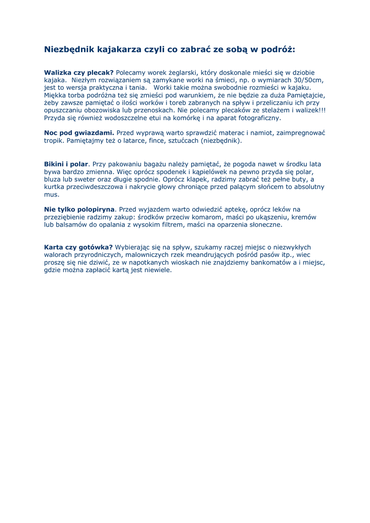 Niezbędnik kajakarza czyli co zabrać ze sobą w podróż: Walizka czy plecak? Polecamy worek żeglarski, który doskonale mieści się w dziobie kajaka. Niezłym rozwiązaniem są zamykane worki na śmieci, np. o wymiarach 30/50cm, jest to wersja praktyczna i tania. Worki takie można swobodnie rozmieści w kajaku. Miękka torba podróżna też się zmieści pod warunkiem, że nie będzie za duża Pamiętajcie, żeby zawsze pamiętać o ilości worków i toreb zabranych na spływ i przeliczaniu ich przy opuszczaniu obozowiska lub przenoskach. Nie polecamy plecaków ze stelażem i walizek!!! Przyda się również wodoszczelne etui na komórkę i na aparat fotograficzny. Noc pod gwiazdami. Przed wyprawą warto sprawdzić materac i namiot, zaimpregnować tropik. Pamiętajmy też o latarce, fince, sztućcach (niezbędnik). Bikini i polar. Przy pakowaniu bagażu należy pamiętać, że pogoda nawet w środku lata bywa bardzo zmienna. Więc oprócz spodenek i kąpielówek na pewno przyda się polar, bluza lub sweter oraz długie spodnie. Oprócz klapek, radzimy zabrać też pełne buty, a kurtka przeciwdeszczowa i nakrycie głowy chroniące przed palącym słońcem to absolutny mus. Nie tylko polopiryna. Przed wyjazdem warto odwiedzić aptekę, oprócz leków na przeziębienie radzimy zakup: środków przeciw komarom, maści po ukąszeniu, kremów lub balsamów do opalania z wysokim filtrem, maści na oparzenia słoneczne. Karta czy gotówka? Wybierając się na spływ, szukamy raczej miejsc o niezwykłych walorach przyrodniczych, malowniczych rzek meandrujących pośród pasów itp., wiec proszę się nie dziwić, ze w napotkanych wioskach nie znajdziemy bankomatów a i miejsc, gdzie można zapłacić kartą jest niewiele.