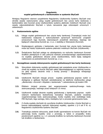 Regulamin wypłat gotówkowych z bankomatów w systemie SkyCash Niniejszy Regulamin stanowi uzupełnienie Regulaminu Użytkownika Systemu SkyCash oraz określa zasady wykonywania usług wypłat gotówkowych bez użycia karty bankowej z bankomatów sieci Euronet przez Użytkowników systemu płatności mobilnych SkyCash oraz zasady odpowiedzialności SkyCash z tytułu naruszenia jego zobowiązań umownych i ustawowych. 1. 2. Postanowienia ogólne 1.1. Usługa wypłat gotówkowych bez użycia karty bankowej (Transakcja) może być realizowana wyłącznie z wykorzystaniem sprawnych technicznie urządzeń oznaczonych logo Euronet, stanowiących przedmiot dzierżawy, leasingu lub będących własnością Euronet sp. z o.o. z siedzibą w Warszawie (Euronet). 1.2. Wypłacającym gotówkę z bankomatu sieci Euronet bez użycia karty bankowej może być każdy Użytkownik systemu płatności mobilnych SkyCash (Użytkownik). 1.3. Świadczenie SkyCash polega na udostępnieniu na rachunku bankowym Euronet środków pieniężnych w celu pokrycia wartości przewidywanego zapotrzebowania na wypłaty gotówkowe zlecane przez Użytkowników, które będą następnie realizowane za pośrednictwem Euronet sp. z o.o. Szczegółowe zasady dokonywania wypłat gotówkowych bez karty bankowej 2.1. Warunkiem dokonania wypłaty gotówkowej jest posiadanie przez Użytkownika w chwili tej wypłaty na Koncie SkyCash salda odpowiadającego co najmniej kwocie, na jaką opiewa zlecenie wraz z kwotą prowizji i akceptacja niniejszego Regulaminu. 2.2. Użytkownik SkyCash inicjuje proces wypłaty gotówkowej poprzez wybór w dostępnej w aplikacji SkyCash zainstalowanej na telefonie Użytkownika usługi „Bankomaty->Euronet->Wypłata z bankomatu” i zatwierdzeniu jej kodem PIN. 2.3. Efektem inicjacji procesu jest wygenerowanie autoryzacyjnego, ważnego przez kolejnych 15 minut. 2.4. Użytkownik wydaje zlecenie wypłaty gotówkowej z bankomatu poprzez wybór wdanym bankomacie bezkartowej transakcji SkyCash, podanie wcześnej wygenerowanego kodu autoryzacyjnego, kwoty wypłaty oraz osobistego kodu PIN SkyCash, tego samego, który niezbędny był w procesie generowania kodu. 2.5. Z chwilą wypłaty dochodzi do wycofania środków Użytkownika z Konta SkyCash w kwocie odpowiadającej wartości dokonanej wypłaty, zgodnie z § 6 ust 9 lit. e) Regulaminu Użytkownika Systemu SkyCash. 2.6. Transakcja zostanie odrzucona, jeżeli środki zgromadzone na koncie SkyCash nie pokrywają kwoty wypłaty wraz z prowizją, a także w przypadku braku powierzonych zgodnie z p. 1.3. powyżej środków na rachunku bankowym Euronet lub środków w bankomacie. sześciocyfrowego kodu 3. 4. Wynagrodzenie za usługę 3.1. Wysokość opłaty z tytuły jednorazowej wypłaty gotówkowej określa Tabela Opłat i Prowizji. 3.2. Opłata potrącana jest z salda, które znajduje się na Koncie SkyCash Użytkownika. Odpowiedzialność cywilnoprawna 4.1. 5. 6. ZmianaRegulaminu 5.1. SkyCash zastrzega sobie prawo do zmiany treści niniejszego Regulaminu. 5.2. Zmiana Regulaminu nie może wpływać na sposób wykonania wydanych już zleceń. Postępowanie reklamacyjne 6.1. 7. SkyCash nie ponosi odpowiedzialności za niewykonanie lub nienależyte wykonanie Transakcji, jeżeli wynikło ono ze stanów i zdarzeń od SkyCash niezależnych, na których wystąpienie nie miał wpływu i których skutkom nie mógł zapobiec. Użytkownik może złożyć reklamację na zasadach ogólnych, określonych w Regulaminie Użytkownika Systemu SkyCash. Postanowienia końcowe 7.1. Prawem właściwym dla stosunków prawnych pomiędzy Użytkownikiem a SkyCash jest prawo polskie. 7.2. Niniejszy Regulamin wchodzi w życie z dniem jego opublikowania.
