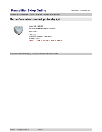 Pannelllier Sklep Online Ozdoby do postawienia > Serce Ceramika Umarłeś po to aby żyć Serce Ceramika Umarłeś po to aby żyć Model : XD11250-8S Serce Ceramika Umarłeś po to aby żyć Producent : �Wymiary -� Szerokość / długość - 13 x 14 cm� Grubość - 7 cm� Cena : 12,00 zł Brutto ( 9,76 zł Netto) Dostępność: Produkt dostępny w naszym sklepie od 15 wrzesień 2016 kontakt : - [email protected] Strona 1 Utworzono : 02 marzec 2017