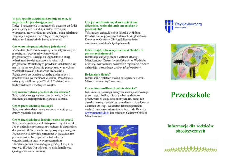 W jaki sposób przedszkole zyskuje na tym, że moje dziecko jest dwujęzyczne? Dzieci i nauczyciele w przedszkolu uczą się, że świat jest większy niż Islandia, a ludzie różnią się wyglądem, mówią różnymi językami, mają odmienne zwyczaje i wyznają inne religie. To wzbogaca działalność przedszkola i uczy tolerancji. Czy wszystkie przedszkola są jednakowe? Wszystkie placówki działają zgodnie z tymi samymi przepisami i ogólnymi wskazówkami programowymi. Bazując na tej podstawie, mają jednak możliwości realizowania własnych programów. W niektórych przedszkolach kładzie się nacisk np. na wychowanie plastyczne, w innych na wielokulturowość lub ochronę środowiska. Przedszkola corocznie sporządzają plan pracy i przedstawiają go rodzicom w jesieni. Przedszkola różnią się wielkością (od 24 do 120 dzieci) oraz budownictwem i wystrojem wnętrz. Czy można wybrać przedszkole dla dziecka? Tak, rodzice mogą wybrać przedszkole, które ich zdaniem jest najodpowiedniejsze dla dziecka. Czy w przedszkolu są wakacje? Tak, wszystkie dzieci mają wakacje w lecie przez cztery tygodnie pod rząd. Czy w przedszkolu są inne dni wolne od pracy? Tak, przedszkola są zamknięte przez trzy dni w roku. Jeden dzień jest przeznaczony na kurs dokształcający dla pracowników, dwa dni na sprawy organizacyjne. Przedszkola są również zamknięte w przewidziane prawem dni wolne, zgodnie z kalendarzem chrześcijańskim oraz w pierwszym dniu islandzkiego lata (sumardaginn fyrsta), 1 maja, 17 czerwca (Swięto Narodowe) i w dniu handlowca (frídagur verslunarmanna). Czy jest możliwość uzyskania opieki nad dzieckiem, zanim dostanie ono miejsce w przedszkolu? Tak, można załatwić pobyt dziecka w żłobku. Działają one w prywatnych domach (dagforeldrar). Doradcy w Centrach Obsługi Mieszkańców nadzorują działalność tych placówek. Gdzie znajdę informacje na temat żłobków w prywatnych domach? Informacje znajdują się w Centrach Obsługi Mieszkańców (þjónustumiðstöðvar) i w Wydziale Oświaty. Formalności związane z rejestracją dziecka załatwiają prowadzący żłobek (dagforeldrar). Ile kosztuje żłobek? Informacji o opłatach można zasięgnąć w żłobku. Miasto zwraca część kosztów. Czy są inne możliwości pobytu dziecka? Jeśli rodzice nie mogą korzystać z zarejestrowanego prywatnego żłobka, a życzą sobie by dziecko przebywało w ciągu dnia u innych, np. babci lub dziadka, mogą wystąpić o zezwolenie u doradców w Centrach Obsługi. Dokładne informacje można znaleźć na stronie internetowej Wydziału Oświaty www.menntasvid.is i na stronach Centrów Obsługi Mieszkańców. Przedszkole Informacje dla rodziców obcojęzycznych • Przepisy o przedszkolach w Islandii z 1994 roku Przedszkole jest zgodnie z prawem pierwszym etapem nauki szkolnej, przeznaczonym dla dzieci od 1 do 6 roku życia. Według prawa, przedszkole na zlecenie rodziców zajmuje się wychowaniem i edukacją dziecka, aż do rozpoczęcia przez nie nauki w szkole. Przedszkola w Reykjaviku Władze miasta zakładają, że wszystkie dzieci od 18 miesiąca życia włącznie, powinny mieć możliwość pobytu w przedszkolu. Istnieje jednak różnica w dostępie do przedszkoli w różnych dzielnicach miasta, ze względu na różną liczbę chętnych. Czy przedszkola są obowiązkowe? Nie, nie są obowiązkowe. Za pobyt w przedszkolu trzeba płacić. Kto zarządza przedszkolami? Samorządy lokalne finansują przedszkola, natomiast Ministerstwo Oświaty nadaje kierunek nauczaniu, wydaje ogólne wskazówki metodyczne i nadzoruje działalność przedszkoli. Czy przedszkole jest dla wszystkich? Przedszkole jest dla wszystkich dzieci, niezależnie od ich psychofizycznych umiejętności, pochodzenia czy wyznania. Gdzie mogę ubiegać się o miejsce w przedszkolu? Można to zrobić na stronie internetowej Wydziału Oświaty: www.menntasvid.is . Również w przedszkolach miejskich oraz w Centrach Obsługi Mieszkańców: • • • • Árbær/Grafarholt (filia Breiðholtu): Bæjarháls 1, e-mail: [email protected], telefon 411-1200 Breiðholt: Álfabakka 12, e-mail: [email protected], telefon 411-1300. Laugardalur/Háaleiti: Síðumúli 39, e-mail: [email protected], telefon 4111500 Miðborg/Hlíðar: Skúlagata 21, e-mail: [email protected], telefon 411-1600 • Grafarvogur/Kjalarnes: Miðgarði, Langarimi 21, e-mail: [email protected], telefon 4111400 Vesturbær: Vesturgarður, Hjarðarhagi 45 – 47, [email protected], telefon 411-1700 Jak długo dziecko może przebywać w przedzkolu? Przedszkola są otwarte od 7.30 do 18.00. Dzieci mogą w nich przebywać 4-9 godzin dziennie. Ile kosztuje pobyt w przedszkolu? Informacje na ten temat można znaleźć na stronie internetowej Wydziału Oświaty m.Reykjaviku www.menntasvid.is Jakie koszty pokrywa opłata za przedszkole? fachowe kształcenie i opieka nad dziećmi śniadanie, obiad i podwieczorek opieka lub nauczanie specjalne, gdy zachodzi taka konieczność Czego uczy się dziecko w przedszkolu? dziecko rozwija się społecznie i emocjonalnie, zdobywa samodzielność i wiarę w siebie, uczy się kontaktów z innymi dziecko rozwija znajomość języka, uczy się nim lepiej posługiwać, jest przygotowane do nauki czytania następuje rozwój ruchowy, zarówno w zabawie klockami, plasteliną czy koralikami, jak i w zabawach na dworze, na spacerach i na ćwiczeniach sportowych dziecko ma wielkie pole do popisu w dziedzinie twórczości w czasie wycieczek dziecko poznaje swoje otoczenie, naturę, społeczeństwo w którym żyje i jego kulturę dziecko uczy się piosenek i wierszy, poznaje muzykę Co moje dziecko robi w przedszkolu? bawi się wraz z innymi dziećmi zabawkami, które sprzyjają jego rozwojowi bierze udział w różnych zajęciach plastycznych: malowaniu, rysowniu, modelowaniu i innych śpiewa z innymi dziećmi i uczy się grać na prostych instrumentach muzycznych przebywa na placu zabaw pełnym urządzeń dla dzieci 