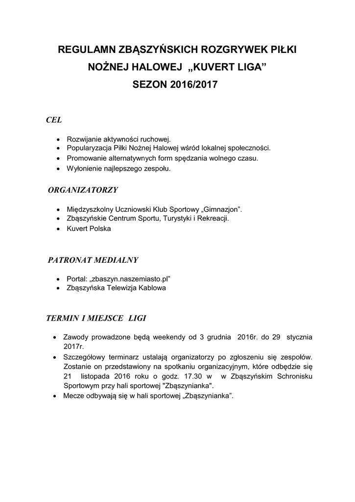 REGULAMN ZBĄSZYŃSKICH ROZGRYWEK PIŁKI NOŻNEJ HALOWEJ „KUVERT LIGA” SEZON 2016/2017 CEL Rozwijanie aktywności ruchowej. Popularyzacja Piłki Nożnej Halowej wśród lokalnej społeczności. Promowanie alternatywnych form spędzania wolnego czasu. Wyłonienie najlepszego zespołu. ORGANIZATORZY Międzyszkolny Uczniowski Klub Sportowy „Gimnazjon”. Zbąszyńskie Centrum Sportu, Turystyki i Rekreacji. Kuvert Polska PATRONAT MEDIALNY Portal: „zbaszyn.naszemiasto.pl” Zbąszyńska Telewizja Kablowa TERMIN I MIEJSCE LIGI Zawody prowadzone będą weekendy od 3 grudnia 2016r. do 29 stycznia 2017r. Szczegółowy terminarz ustalają organizatorzy po zgłoszeniu się zespołów. Zostanie on przedstawiony na spotkaniu organizacyjnym, które odbędzie się 21 listopada 2016 roku o godz. 17.30 w w Zbąszyńskim Schronisku Sportowym przy hali sportowej "Zbąszynianka". Mecze odbywają się w hali sportowej „Zbąszynianka”. WARUNKI UCZESTNICTWA W rozgrywkach startują zespoły podzielone na pierwsza i drugą ligę. Potwierdzenie udziału lub zgłoszenie nowego zespołu do dnia 17 listopada 2016 r. Zgłoszenia przyjmowane są w Zbąszyńskim Centrum Sportu, Turystyki i Rekreacji ul. Mostowa 10 a (hala „Zbąszynianka”). Przy zapisie drużyny obowiązuje opłata w wysokości 100 zł. Zespół liczy 12 zawodników zgłoszonych na piśmie u organizatora przed rozpoczęciem rozgrywek. Opłata za dopisanie kolejnego zawodnika - 50 zł. Uczestnicy którzy nie ukończyli 18 lat obowiązkowo muszą dołączyć zgodę rodziców! W przypadku zgłoszenia niepełnej ilości zawodników uzupełnienie składu zespołu musi nastąpić przed 3 kolejką spotkań, w przeciwnym wypadku zespół gra w niepełnym składzie. Nie ma możliwości wymiany raz zgłoszonego zawodnika. Zespoły są zobowiązane przystąpić do meczu w regulaminowym składzie. Zawodnik może grać tylko w jednej drużynie. Drużyna w miarę możliwości gra w jednolitym stroju. Terminarz rozgrywek ustalany jest przez organizatorów. Ewentualnych zmian dokonać można na spotkaniu organizacyjnym w dniu 21 listopada 2016r. Późniejsze prośby o zmianę terminarza nie będą uwzględniane!!! Warunkiem uczestnictwa jest opłacenie wpisowego w wysokości 450.00 zł od zespołu, przed przystąpieniem do pierwszego meczu w rozgrywkach. SPOSÓB PROWADZENIA ROZGRYWEK Zawody prowadzone będą zgodnie z przepisami PZPN. Czas Gry 2 x 12 min Zawodnicy zobowiązania są: przestrzegać przepisów gry w piłkę nożną przestrzegać zasady fair- play Sędziowie mają prawo do upomnienia (żółta kartka) lub wykluczenia zawodnika (kartka czerwona). Otrzymanie żółtej kartki równoznaczne jest z karą 2 minut dla zawodnika. W przypadku utraty bramki przez zespół zdekompletowany za zgodą sędziego może uzupełnić skład przed upływem 2 minut kary. W przypadku, gdy żółtą kartkę otrzymują zawodnicy obydwu drużyn, w wyniku, czego ich składy są osłabione równą liczba zawodników, nie ma możliwości uzupełnienia zespołu po utracie bramki. Zawodnik wykluczony z gry (czerwona kartka) nie ma prawa powrócić na boisko ani zajmować miejsca na ławce rezerwowych. Otrzymanie bezpośrednio czerwonej kartki równoznaczne jest z wykluczeniem z gry w kolejnym meczu. Drużyna, która jest zdekompletowana na skutek czerwonej kartki ma prawo uzupełnić skład po 4 minutach gry w osłabieniu innym zawodnikiem Zawodnik upomniany żółtą lub czerwona kartką na ławce rezerwowych automatycznie osłabia zespół, drużyna gra w osłabieniu według powyższych przepisów. Zmiany zawodników są przeprowadzane tylko i wyłącznie w strefie do tego przeznaczonej . Strefa zmian wyznaczona na wysokości ławek rezerwowych. W rozgrywkach ligi obowiązuje zasada „Fauli Akumulowanych” – 5 i każdy kolejny faul drużyny, karany jest rzutem karnym przedłużonym ( 9 metr), faule zostają anulowane po pierwszej połowie. Gra „wślizgiem” traktowana jest, jako faul z wyjątkiem, gdy „wślizg” wykonany został, co najmniej 1,5 metra od przeciwnika, nie powodował z nim kontaktu lub utrudnienia gry. Zagranie przez zawodnika ręką zaliczane jest, jako faul. Gra w parterze jest zabroniona. Czas może być zatrzymywany tylko na żądanie sędziego. Rzut rożny wykonywany jest z narożnika pola gry wyznaczonego trójkątem o bokach 30x30 cm i podstawie 42 cm. Rzut od bramki wykonywany jest przez bramkarza z pola karnego ręką lub nogą. Piłka po zagraniu bramkarza musi opuścić pole karne. Aut wykonywany jest z linii bocznej. Piłka podana może zostać tylko nogą. Zawodnik drużyny przeciwnej musi się znajdować przynajmniej 2 metry od wprowadzającego piłkę do gry. Specjalne przeszkadzanie w wykonywaniu autu będzie karane upomnieniem. Jeżeli piłka uderzy w konstrukcje dachową to gra zostaje przerwana przez sędziego. Wznowienia dokonuje drużyna przeciwna z miejsca, w którym linia boczna boiska łączy się z miejscem uderzenia piłki. Po każdym faulu dyktowany jest rzut wolny bezpośredni. Jeżeli faul nastąpił w polu karnym dyktowany jest rzut karny, wykonywany z 7 metra. Sędzia decyduje czy rzut wolny ma być wykonywany na gwizdek. Zespoły rozegrają mecze systemem „każdy z każdym”. W przypadku rażąco niesportowego zachowania w trakcie pobytu na boisku jak i na widowni organizatorzy mają prawo do ukarania zawodników lub całej drużyny przez odsunięcie z rozgrywek. Za czynną napaść na sędziego, innego zawodnika lub współpartnera zawodnikowi grozi dożywotnia dyskwalifikacja. KLASYFIKACJA Za zwycięstwo zespół otrzymuje 3 punkty, remis 1 pkt., przegrana 0 pkt., walkower 5:0. O kolejności zajętych miejsc w rundzie zasadniczej decyduje: o większa liczba dużych pkt., o bezpośredni mecz między zainteresowanymi o lepszy stosunek bramek, W przypadku wycofania się któreś z drużyn z ligi przed zakończeniem rozgrywek wszystkie wyniki meczów z udziałem tej drużyny traktuje się jako walkowery (5:0). 