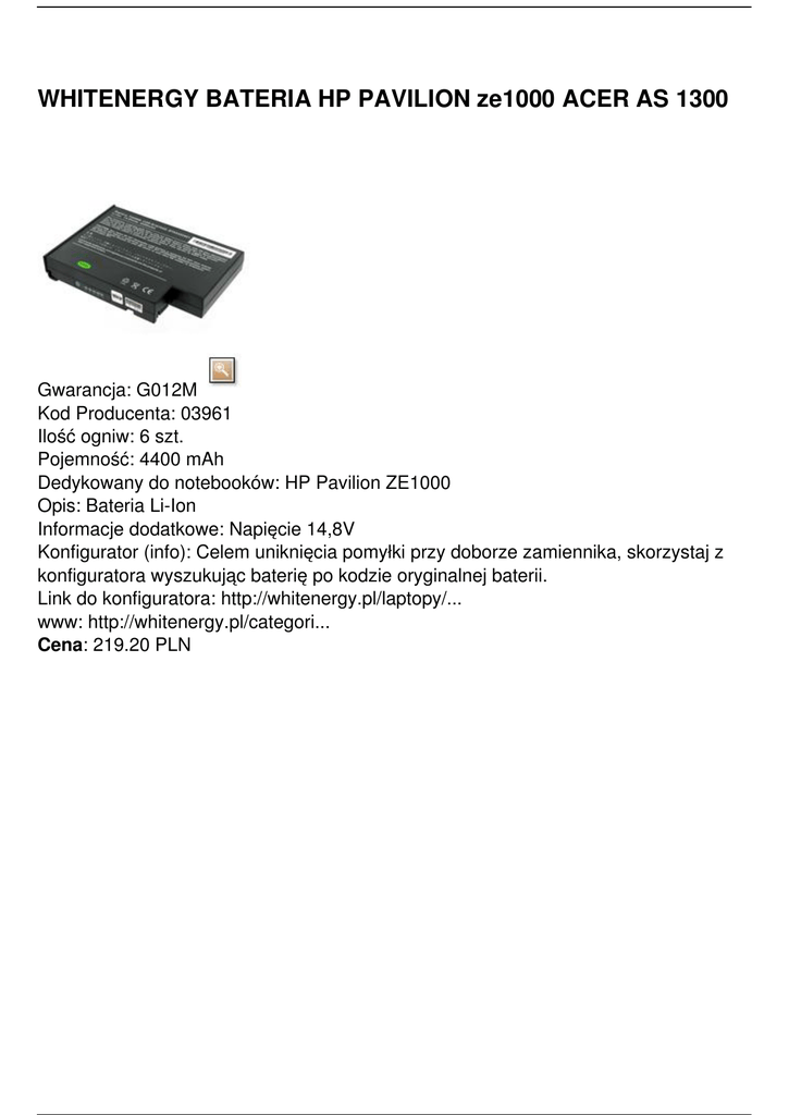 WHITENERGY BATERIA HP PAVILION ze1000 ACER AS 1300 Gwarancja: G012M Kod Producenta: 03961 Ilość ogniw: 6 szt. Pojemność: 4400 mAh Dedykowany do notebooków: HP Pavilion ZE1000 Opis: Bateria Li-Ion Informacje dodatkowe: Napięcie 14,8V Konfigurator (info): Celem uniknięcia pomyłki przy doborze zamiennika, skorzystaj z konfiguratora wyszukując baterię po kodzie oryginalnej baterii. Link do konfiguratora: http://whitenergy.pl/laptopy/... www: http://whitenergy.pl/categori... Cena: 219.20 PLN Powered by TCPDF (www.tcpdf.org)