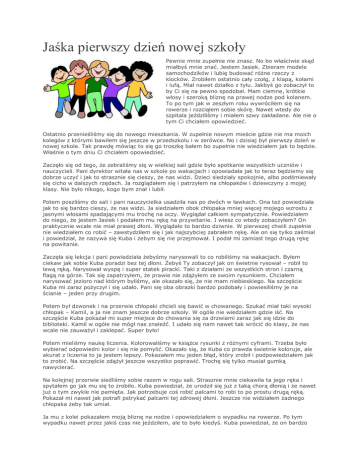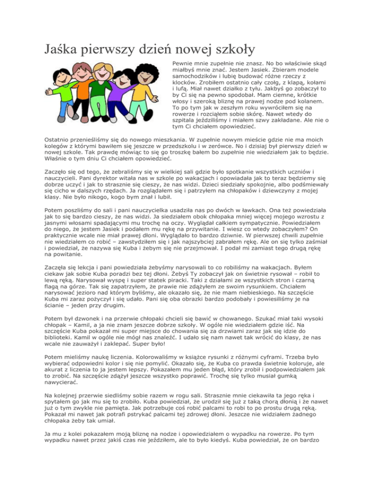 Jaśka pierwszy dzień nowej szkoły Pewnie mnie zupełnie nie znasz. No bo właściwie skąd miałbyś mnie znać. Jestem Jasiek. Zbieram modele samochodzików i lubię budować różne rzeczy z klocków. Zrobiłem ostatnio cały czołg, z klapą, kołami i lufą. Miał nawet działko z tyłu. Jakbyś go zobaczył to by Ci się na pewno spodobał. Mam ciemne, krótkie włosy i szeroką bliznę na prawej nodze pod kolanem. To po tym jak w zeszłym roku wywróciłem się na rowerze i rozciąłem sobie skórę. Nawet wtedy do szpitala jeździliśmy i miałem szwy zakładane. Ale nie o tym Ci chciałem opowiedzieć. Ostatnio przenieśliśmy się do nowego mieszkania. W zupełnie nowym mieście gdzie nie ma moich kolegów z którymi bawiłem się jeszcze w przedszkolu i w zerówce. No i dzisiaj był pierwszy dzień w nowej szkole. Tak prawdę mówiąc to się go troszkę bałem bo zupełnie nie wiedziałem jak to będzie. Właśnie o tym dniu Ci chciałem opowiedzieć. Zaczęło się od tego, że zebraliśmy się w wielkiej sali gdzie było spotkanie wszystkich uczniów i nauczycieli. Pani dyrektor witała nas w szkole po wakacjach i opowiadała jak to teraz będziemy się dobrze uczyć i jak to strasznie się cieszy, że nas widzi. Dzieci siedziały spokojnie, albo podśmiewały się cicho w dalszych rzędach. Ja rozglądałem się i patrzyłem na chłopaków i dziewczyny z mojej klasy. Nie było nikogo, kogo bym znał i lubił. Potem poszliśmy do sali i pani nauczycielka usadziła nas po dwóch w ławkach. Ona też powiedziała jak to się bardzo cieszy, że nas widzi. Ja siedziałem obok chłopaka mniej więcej mojego wzrostu z jasnymi włosami spadającymi mu trochę na oczy. Wyglądał całkiem sympatycznie. Powiedziałem do niego, że jestem Jasiek i podałem mu rękę na przywitanie. I wiesz co wtedy zobaczyłem? On praktycznie wcale nie miał prawej dłoni. Wyglądało to bardzo dziwnie. W pierwszej chwili zupełnie nie wiedziałem co robić – zawstydziłem się i jak najszybciej zabrałem rękę. Ale on się tylko zaśmiał i powiedział, że nazywa się Kuba i żebym się nie przejmował. I podał mi zamiast tego drugą rękę na powitanie. Zaczęła się lekcja i pani powiedziała żebyśmy narysowali to co robiliśmy na wakacjach. Byłem ciekaw jak sobie Kuba poradzi bez tej dłoni. Żebyś Ty zobaczył jak on świetnie rysował – robił to lewą ręką. Narysował wyspę i super statek piracki. Taki z działami ze wszystkich stron i czarną flagą na górze. Tak się zapatrzyłem, że prawie nie zdążyłem ze swoim rysunkiem. Chciałem narysować jezioro nad którym byliśmy, ale okazało się, że nie mam niebieskiego. Na szczęście Kuba mi zaraz pożyczył i się udało. Pani się oba obrazki bardzo podobały i powiesiliśmy je na ścianie – jeden przy drugim. Potem był dzwonek i na przerwie chłopaki chcieli się bawić w chowanego. Szukać miał taki wysoki chłopak – Kamil, a ja nie znam jeszcze dobrze szkoły. W ogóle nie wiedziałem gdzie iść. Na szczęście Kuba pokazał mi super miejsce do chowania się za drzwiami zaraz jak się idzie do biblioteki. Kamil w ogóle nie mógł nas znaleźć. I udało się nam nawet tak wrócić do klasy, że nas wcale nie zauważył i zaklepać. Super było! Potem mieliśmy naukę liczenia. Kolorowaliśmy w książce rysunki z różnymi cyframi. Trzeba było wybierać odpowiedni kolor i się nie pomylić. Okazało się, że Kuba co prawda świetnie koloruje, ale akurat z liczenia to ja jestem lepszy. Pokazałem mu jeden błąd, który zrobił i podpowiedziałem jak to zrobić. Na szczęście zdążył jeszcze wszystko poprawić. Trochę się tylko musiał gumką nawycierać. Na kolejnej przerwie siedliśmy sobie razem w rogu sali. Strasznie mnie ciekawiła ta jego ręka i spytałem go jak mu się to zrobiło. Kuba powiedział, że urodził się już z taką chorą dłonią i że nawet już o tym zwykle nie pamięta. Jak potrzebuje coś robić palcami to robi to po prostu drugą ręką. Pokazał mi nawet jak potrafi pstrykać palcami tej zdrowej dłoni. Jeszcze nie widziałem żadnego chłopaka żeby tak umiał. Ja mu z kolei pokazałem moją bliznę na nodze i opowiedziałem o wypadku na rowerze. Po tym wypadku nawet przez jakiś czas nie jeździłem, ale to było kiedyś. Kuba powiedział, że on bardzo lubi jeździć i że możemy się razem na jakąś wyprawę wybrać jak rodzice pozwolą. I jak tak gadaliśmy to okazało się, że mieszkamy całkiem niedaleko i na pewno będziemy mogli się odwiedzać. Na ostatniej lekcji mieliśmy WF i graliśmy w zbijaka. Ktoś rzucał piłką, a reszta tak biegała i się wykręcała, żeby tylko ich nie trafić. Kuba miał świetny sposób. Jak widział, że ktoś w niego celuje to potrafił skoczyć z obrotem i przypaść prawie płasko do ziemi. Przez to prawie nikt w niego nie mógł trafić. A do tego świetnie rzucał i trafiał kogo chciał. Raz to wydawało mi się nawet, że mi darował chociaż mógł mnie trafić. Bo jak już nie miałem gdzie uciec to tylko mrugnął do mnie okiem i w końcu trafił w kogoś innego. Ten dzień okazał się taki fajny, że aż żałowałem jak przyszła pora wracać do domu. Jak już byliśmy ubrani do wyjścia to znowu przez pomyłkę chciałem zrobić cześć z Kubą – na pożegnanie. Ale teraz to już się razem uśmialiśmy z tego mojego zapomnienia. No i tym razem Kuba po prostu mnie objął. Jak najlepszy kumpel. Bo on jest super. I coś mi się wydaje, że będziemy razem najlepszymi przyjaciółmi. Już się nie mogę doczekać na jutro – wtedy znowu spotkamy się w szkole. Bajkę o niepełnoprawności napisana na konkurs prowadzony przez Stowarzyszenie na Rzecz Osób z Wadami Rąk „W Naszych Rękach”. Dotyczy akceptacji dzieci niepełnosprawnych i generalnie niepełnosprawności.