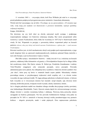 Max 20 min Pani Przewodnicząca, Panie Prezydencie, Szanowni Państwo 11 września 1865 r. – zwyczajny dzień, król Prus Wilhelm jak miał to w zwyczaju przed południem podpisywał przygotowane przez ministrów i kancelarię dokumenty. Wśród nich był zaczynający się od słów: Powołując się na sprawozdanie z 28 sierpnia tego roku, wolą moją jest nadanie wsi Katowicom w powiecie bytomskim, rejencji opolskiej, ordynacji miejskiej... Podpis: WILHELM, Nie dowiemy się czy król choć na chwilę zatrzymał myśli czytając i podpisując rozporządzenie nadające wsi Katowice ordynację miejską. Być może przypomniał sobie rozmowę z synem Fryderykiem, który kilka lat wcześniej (w 1857) był w Katowicach (miał wtedy 26 lat). Wspaniale tu przyjęty z pewnością dobrze wspominał pobyt na kresach państwa (chrzest, ulicę przy której stał kościół nazwano Friedrichstrasse, a główny plac = rynek nazwano Friedrichplatz). Również możliwe jest, że król mechanicznie złożył swój podpis pod rozporządzeniem, a jego myśli skupione były na sprawach międzynarodowych, niedawno pokonał Danię (mówiła o tym cała Europa), a już na horyzoncie wojna a Austrią. Dla kilku tysięcy mieszkańców Katowic – małej (niecałe 6 tys.) mieściny na kresach państwa, oddalonej kilka kilometrów od granicy z Priwisljańskim Krajem był to długo (kilka lat) oczekiwany dzień. Dla Ojców miasta: R. Holtze`go, Friedricha Grundmanna i rodziny Tiele-Winckler osiągnięcie celu oznaczało początek, nowy początek. Powstała administracyjnie nowa jakość, bez chłopskiej ławy (symbol) a właściwie dwóch symboli i bez „nie chca”, które przy tej ławie w ostatnich latach często padało. Mieszkańcy właśnie powstałego miasta, w przytłaczającej większości mieli wspólny cel, i co równie ważne wszystkie do jego realizacji środki. W ciągu jednego pokolenia wybudowali miasto, w którym było wszystko co w ówczesnym mieście być musiało: urząd miejski, sąd, dworzec kolei żelaznej, królewska poczta, świątynie trzech wyznań, szkoły, kamienice, hotele... Już w drugim pokoleniu nadali mu charakter silnego ośrodka decyzyjnego (stolicy powiatu), oraz kulturalnego (Reichshalle, Teatr). Ojcowie miasta dążyli do zrównoważonego rozwoju, dbając również o szeroko rozumianą kulturę i edukację. Pierwszą dużą pożyczkę miasto zaciągnęło na budowę gimnazjum. Nie bez powodu Goldsteinowie budując swój pałac na początku lat 70. XIX w. umieścili w bocznej elewacji rzeźby przedstawiające trzy postacie kobiece – alegorie przemysłu, nauki i sztuk pięknych. Dwa zapracowane pokolenia 1 katowiczan zbudowały miasto (nie miało ono nawet 9 km2) otoczone uprawnymi polami, kominami, hałdami i zapadliskami kopalnianymi. Miasto, w którym można było czuć się jak w Europie. Nie oznacza to, że pierwsze półwiecze było idylliczne, mieszkańcy żyli w błogostanie a przestępczość nie istniała. Nie, już pierwszy burmistrz po krótkim urzędowaniu ukradł miejskie pieniądze i uciekł do Ameryki, (to były właśnie pieniądze na budowę szkoły) kolejny pełnił swoją funkcję bardzo krótko, kolejny również, dopiero po kilku latach sytuacja się ustabilizowała. Kolejnym etapem awansu miasta było ustanowienie Katowic stolicą autonomicznego województwa śląskiego w granicach II RP. To krok milowy. Dotąd dobrze zorganizowane, ale małe miasto powiatowe (nazywane też „kresowym szańcem”) awansuje do roli o jakiej niemieccy i żydowscy radni nie mogli myśleć. Przez długi czas nie myśleli o tym także działacze polscy. Paradoksalnie miasto w którym 85% mieszkańców w marcowym plebiscycie głosowało za Niemcami kilkanaście miesięcy później stało się (mocą ustawy) stolicą autonomicznego województwa śląskiego, województwa najmniejszego terytorialnie i jednocześnie najbogatszego w wielonarodowej RP. Potem było już tylko lepiej: budowa Śląskiego Urzędu Wojewódzkiego, nowego magistratu, Katedry (stolica biskupia), ale też siedzib banków, zarządów, central, wieżowca, lotniska, pojawiły się: katowicka moderna – i tu stawiam wykrzyknik, przyjechali Linke, Szukalski, Witkacy, zaczęło nadawać radio. Szybko okazało się, że miasto jest za małe dla nowej funkcji. Znaczne powiększenie obszaru i liczby ludności stolicy regionu odbyło się wbrew Radzie Miasta i wielu jego mieszkańców. Ten ,,oddech” do którego przymusił wojewoda, był jednak zbawienny. Szybkiego rozwoju nie zablokował nawet światowy kryzys gospodarczy, który miasto przetrwało w stosunkowo dobrej kondycji. Pomimo, iż budżet zmniejszył się z 20 do 10 milionów zł. Były to lata bardzo ciekawe, z jednej strony ciężar stołeczności i ostry konflikt polityczny Korfanty-Grażyński, (panowie byli nie tylko oponentami politycznymi, ale nie lubili się też nawzajem. Kiedy Korfanty przemawiał w sejmie śl. Grażyński wychodził i na odwrót. Atmosfera była bardzo gorąca, urządzano równoległe uroczystości powstańcze, aż trudno sobie wyobrazić ale w międzywojniu wysadzono w powietrze dwa pomniki) wielkie inwestycje z drugiej znaczące zmniejszenie się budżetu, biedaszyby ale jednocześnie wysyłanie bezrobotnych do sanatoriów. Na to nakładały się znaczne ruchy migracyjne. Kocioł narodowościowy, religijny, polityczny i znaczne różnice majątkowe mieszkańców. To obraz Katowic w końcu lat 30. XX w. Osobiście 17 lat między pierwszą a drugą wojną światową zapisuję jako bardzo dobre dla Katowic. Okupujący miasto Niemcy (1939-1945) nie inwestowali w infrastrukturę, dbali głównie o produkcję, dowodem „uznania” było utworzenie tu siedziby rejencji, a w 1941 r. Prowincji 2 Górnośląskiej. Po raz pierwszy Katowice stały się administracyjnym centrum większości historycznych ziem górnośląskich. Wkroczenie Armii Czerwonej skutkowało zniszczeniami w śródmieściu Katowic, min. spłonął Ratusz wraz 