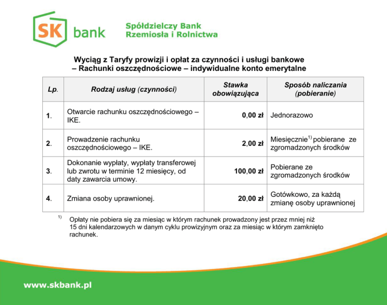 Wyciąg z Taryfy prowizji i opłat za czynności i usługi bankowe – Rachunki oszczędnościowe – indywidualne konto emerytalne Lp. Rodzaj usług (czynności) Stawka obowiązująca Sposób naliczania (pobieranie) 1. Otwarcie rachunku oszczędnościowego – IKE. 0,00 zł Jednorazowo 2. Prowadzenie rachunku oszczędnościowego – IKE. 2,00 zł 3. Dokonanie wypłaty, wypłaty transferowej lub zwrotu w terminie 12 miesięcy, od daty zawarcia umowy. 4. Zmiana osoby uprawnionej. 1) 100,00 zł 20,00 zł Miesięcznie1) pobierane ze zgromadzonych środków Pobierane ze zgromadzonych środków Gotówkowo, za każdą zmianę osoby uprawnionej Opłaty nie pobiera się za miesiąc w którym rachunek prowadzony jest przez mniej niż 15 dni kalendarzowych w danym cyklu prowizyjnym oraz za miesiąc w którym zamknięto rachunek.