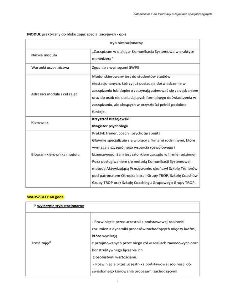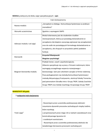 Załącznik nr 1 do Informacji o zajęciach specjalizacyjnych MODUŁ praktyczny do bloku zajęć specjalizacyjnych - opis tryb niestacjonarny „Zarządzam w dialogu- Komunikacja Systemowa w praktyce Nazwa modułu menedżera” Warunki uczestnictwa Zgodnie z wymogami SWPS Moduł skierowany jest do studentów studiów niestacjonanych, którzy już posiadają doświadczenie w zarządzaniu lub dopiero zaczynają zajmować się zarządzaniem Adresaci modułu i cel zajęć oraz do osób nie posiadających formalnego doświadczenia w zarządzaniu, ale chcących w przyszłości pełnić podobne funkcje. Krzysztof Błażejewski Kierownik Magister psychologii Praktyk trener, coach i psychoterapeuta. Głównie specjalizuje się w pracy z firmami rodzinnymi, które wymagają szczególnego wsparcia rozwojowego i Biogram kierownika modułu biznesowego. Sam jest członkiem zarządu w firmie rodzinnej. Poza posługiwaniem się metodą Komunikacji Systemowej i metodą Aktywizującą Przeżywanie, ukończył Szkołę Trenerów pod patronatem Ośrodka Intra i Grupy TROP, Szkołę Coachów Grupy TROP oraz Szkołę Coachingu Grupowego Grupy TROP. WARSZTATY 60 godz. wyłącznie tryb stacjonarny - Rozwinięcie przez uczestnika podstawowej zdolności rozumienia dynamiki procesów zachodzących między ludźmi, które wynikają Treść zajęć1 z przyjmowanych przez niego ról w realiach zawodowych oraz konstruktywnego łączenia ich z osobistymi wartościami. - Rozwinięcie przez uczestnika podstawowej zdolności do świadomego kierowania procesami zachodzącymi 1 Załącznik nr 1 do Informacji o zajęciach specjalizacyjnych w nim oraz w jego komunikacji z innymi w zespole. - Nabycie umiejętności stosowania różnego rodzaju przywództwa w zależności od aktualnej sytuacji zespołu - Poznanie narzędzi ułatwiających porozumiewanie się z zespołem, aby efektywniej realizować założone cele - Rozpoznanie różnic między klasycznym stylem menedżerskim, a menedżerem sytuacyjnym - Pogłębienie świadomości swojego stylu kierowania ludźmi - Poznanie narzędzi radzenia sobie z konfliktem w zespole - Rozwój osobisty jako menedżera- rozpoznanie mocnych stron oraz obszarów rozwojowych - Poznanie narzędzi ułatwiających zarządzanie przez wartości. mgr Anna Gorączewska mgr Janusz Kozakoszczak Prowadzący warsztaty mgr Wojciech Lasota mgr Krzysztof Błażejewski Obecność i aktywny udział w warsztatach. Test dotyczący Warunki zaliczenia i kryteria oceny warsztatów3 modeli wykorzystywanych w Metodzie Komunikacji Systemowej. Mgr Krzysztof Błażejewski. Praktyk trener, coach i psychoterapeuta. Głównie specjalizuje się w pracy z firmami rodzinnymi, które wymagają szczególnego wsparcia Biogramy prowadzących warsztaty4 rozwojowego i biznesowego. Członek zarządu w firmie rodzinnej. max 5 wierszy Mgr Wojciech Lasota. Trener biznesu, absolwent szkoły trenerów Grupy TROP, trener programu Spadochron na licencji FISE. Prezes Fundacji Korczakowskiej, autor programu 2 Załącznik nr 1 do Informacji o zajęciach specjalizacyjnych Korczakowskich studiów podyplomowych. Mgr Anna Gorączewska. Trener biznesu oraz coach.. Wieloletni praktyk specjalizująca się we współpracy z biznesem zarówno rodzinnym jak i korporacyjnym. Prezes Fundacji Doskonalenia Komunikacji Systemowej FDKS. Mgr Janusz Kozakoszczak. Ekonomista - SGPiS, Prawnik - UW, MBA – Akademia L Koźmińskiego, Trener biznesu – Grupa Trop, Trener treningu grupowego – Szkoła Haliny Nałęcz – Nieniewskiej, Coach - International Coaching Community PRAKTYKI 62 godz. tryb niestacjonarny Osoba odpowiedzialna1 Mgr Krzysztof Błażejewski Część I- warsztatowa: Czas: 16 h Komunikacja i Zarządzanie: Podstawy Komunikacji Systemowej dla zarządzających. Wybrane modele: Treść praktyk 62 godz. • Model kwadratu komunikacji, • Model wewnętrznego zespołu, • Procedura metakomunikacji • Model kwadratu wartości i rozwoju, • Model diabelskiego koła komunikacji, • Podsumowanie części teoretycznej zakończone testem. Część II- praktyki: Czas 46 h Zajęcia skupiają na pogłębianiu świadomości siebie, swojego stylu komunikacji oraz zasobów z wykorzystaniem modeli tworzących Metodę Komunikacji Systemowej. Uczestnicy w szczególności będą zachęcani do pracy nad następującymi 3 Załącznik nr 1 do Informacji o zajęciach specjalizacyjnych obszarami: • „Sztuka komunikowania się”- Doskonalenie sztuki prowadzenia rozmów • „Rozmawiać mimo wszystko”- Rozwiązywanie konfliktów, • „Moje role”- pogłębianie świadomości pełnionych ról, jako niezbędny element skutecznej komunikacji, • „Sztuka wystąpień”- zrozumiale i interesująco. Moduł kończy się czasem dla uczestników do wykorzystania na refleksję i udzielenie sobie informacji zwrotnych jak wzajemnie widzą swój rozwój oraz jak mogą wykorzystywać zdobytą wiedzę w swoim codziennym życiu. Ten czas nie ma charakteru egzaminu, służy rzeczowemu, rozwojowemu, międzyludzkiemu zebraniu refleksji i podsumowaniu programu „Zarządzam w dialogu”. Obecność na praktykach, aktywny udział w zajęciach. Część praktyczna nie będzie oceniana, ponieważ Warunki zaliczenia i kryteria zakłada naukę na własnym doświadczeniu, którego nie można oceny praktyk3 poddać obiektywnej ocenie. Istnieje możliwość superwizji własnej praktyki zarządzania zespołem w miejscu pracy (nie obowiązkowe). Reguły integracji ocen z warsztatów (ew. ich części) i Nie dotyczy praktyk (ew. ich części) Praktyki będą się odbywać na terenie szkoły (ewentualnie w miejscu Instytucje i osoby przyjmujące pod pracy opieką kierownika Błażejewskiego i uczestnika) bloku trenerów z – mgra Krzysztofa Fundacji Doskonalenia Metodą Aktywizującą Komunikacji Systemowej FDKS. Praktyki będą Przeżywanie, prowadzone która jest integralną częścią Metody Organizacja praktyk Komunikacji Systemowej. Metoda Aktywizująca Przeżywanie istotną wagę