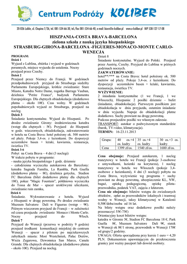 HISZPANIA-COSTA BRAVA-BARCELONA zielona szkoła z nauką języka hiszpańskiego STRASBURG-GIRONA-BARCELONA -FIGUERES-MONACO-MONTE CARLOWENECJA PROGRAM: Dzień 1 Wyjazd z Lublina, zbiórka i wyjazd w godzinach porannych, miejsce wyjazdu do ustalenia. Nocny przejazd przez Czechy. Dzień 2 Przejazd przez Niemcy do Francji. W godzinach przedpołudniowych przyjazd do Strasburga siedziby Parlamentu Europejskiego, krótkie zwiedzanie: Stare Miasto, Katedra Notre Dame, rogatka Barrage Vauban, dzielnica "Petite France", budynek Parlamentu Europejskiego. Dla chętnych obiadokolacja (dodatkowo płatna – około 10€). Czas wolny. W godzinach popołudniowych wyjazd ze Strasburga, przejazd na nocleg. Dzień 3 Śniadanie kontynentalne. Wyjazd do Hiszpanii. Po drodze zwiedzanie Girony: średniowieczna katedra (wstęp dla chętnych - 5€). Przyjazd do Hiszpanii w godz. wieczornych, obiadokolacja, zakwaterowanie w hotelu na Costa Brava: hotel położony ok. 500 metrów od plaży. Pokoje 3,4-os. z łazienkami. Do dyspozycji uczestników basen + leżaki, kawiarnia, restauracja, świetlica TV. Dzień 3-6 Pobyt na Costa Brava – 4 dni (3 noclegi) W trakcie pobytu w programie: - nauka języka hiszpańskiego 1 godz. dziennie - całodzienna wycieczka autokarowa do Barcelony: katedra Sagrada Familia, La Rambla, Park Guella (dodatkowo płatny – 8€), dzielnica gotycka, Stadion FC Barcelona (bilet dodatkowo płatny dla chętnych 18€), pokaz "Magic Fountain", półdniowa wycieczka do Tossa de Mar – spacer urokliwymi uliczkami, zwiedzanie ruin zamku, Dzień 6 Śniadanie. Wykwaterowanie z hotelu. Wyjazd z Hiszpanii w drogę powrotną. Po drodze zwiedzanie Muzeum Salvatore Dali w Figueras (wstęp – 9€). Późnym wieczorem przyjazd do Francji – w zależności od czasu przejazdu zwiedzanie Monaco i Monte Carlo. Nocny przejazd do Włoch. Dzień 7 Przyjazd do Wenecji (przerwa w podróży 9 godzin) przejazd środkami komunikacji miejskiej do centrum Wenecji – spacer z pilotem po najciekawszych zabytkach miasta: Most Westchnień, Pałac Dożów, Wieża Zegarowa, Dzwonnica San Marco, Canale Grande. Dla chętnych obiadokolacja (dodatkowo płatna - około 10€). Przejazd na nocleg. Dzień 8 Śniadanie kontynetalne. Wyjazd do Polski. Przejazd przez Austrię, Czechy. Przyjazd do Lublina w późnych godzinach nocnych. ZAKWATEROWANIE: hotel**/*** na Costa Brava: hotel położony ok. 500 metrów od plaży. Pokoje 3,4-os. z łazienkami. Do dyspozycji uczestników basen + leżaki, kawiarnia, restauracja, świetlica TV. WYŻYWIENIE: 2 śniadania kontynentalne (1 we Francji, 1 we Włoszech), Hiszpania: 2 posiłki dziennie – bufet (śniadanie, obiadokolacja). Pierwszym posiłkiem jest obiadokolacja w dniu przyjazdu, ostatnim śniadanie w dniu wyjazdu. Napoje do obiadokolacji płatne dodatkowo. Suchy prowiant na drogę powrotną. Podczas przejazdów posiłki we własnym zakresie. TRANSPORT: autokar o podwyższonym standardzie (barek, TV-video, klimatyzacja). TERMIN: 16-23.11.2013 Grupa: Cena 40 os.+4 35 os.+4 os. kadry os. kadry 1399 zł/os. 1540 zł/os. 30 os.+3 os. kadry 1680 zł/os. Cena obejmuje: Przejazd autokarem, 1 nocleg tranzytowy w hotelu we Francji (pokoje 3-osobowe z umywalkami, łazienki na korytarzu), 1 nocleg tranzytowy w hotelu we Włoszech (pokoje 3,4osobowe z łazienkami), 4 dni (3 noclegi) pobytu na Costa Brava, wyżywienie wg programu + suchy prowiant na drogę powrotną, ubezpieczenie KL, NW, bagaż, opiekę pedagogiczną, opiekę pilotaprzewodnika, podatek VAT, zajęcia z lektorem. Cena nie obejmuje: biletów wstępu do zwiedzanych obiektów, opłat za przewodników lokalnych i tramwaj wodny w Wenecji, taksy klimatycznej w Katalonii 0,50€/doba/osoba od 16 lat. Na bilety wstępu oraz dodatkowe posiłki należy przeznaczyć 55€-75€) Orientacyjny koszt biletów wstępu: katedra w Gironie 5€, Stadion FC Barcelona 18 €, Park Guella 8€, Muzeum Salvatore Dali 9€, statek w Wenecji ok 8€/1 stronę, przewodnik w Wenecji 170€ od grupy/2 godziny. UWAGA: Oferta sporządzona przy kursie 1 euro = 4,20 PLN. Dokumentem upawniającym do przekroczenia granicy jest ważny paszport lub dowód osobisty.