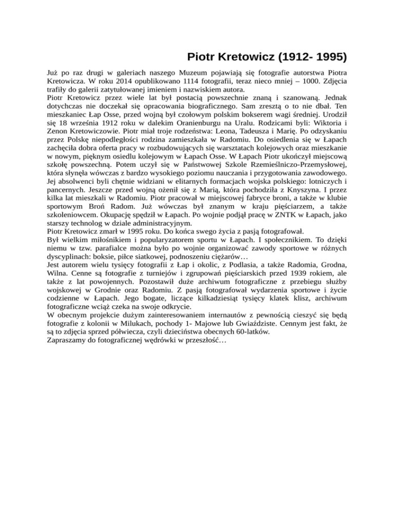 Piotr Kretowicz (1912- 1995) Już po raz drugi w galeriach naszego Muzeum pojawiają się fotografie autorstwa Piotra Kretowicza. W roku 2014 opublikowano 1114 fotografii, teraz nieco mniej – 1000. Zdjęcia trafiły do galerii zatytułowanej imieniem i nazwiskiem autora. Piotr Kretowicz przez wiele lat był postacią powszechnie znaną i szanowaną. Jednak dotychczas nie doczekał się opracowania biograficznego. Sam zresztą o to nie dbał. Ten mieszkaniec Łap Osse, przed wojną był czołowym polskim bokserem wagi średniej. Urodził się 18 września 1912 roku w dalekim Oranienburgu na Uralu. Rodzicami byli: Wiktoria i Zenon Kretowiczowie. Piotr miał troje rodzeństwa: Leona, Tadeusza i Marię. Po odzyskaniu przez Polskę niepodległości rodzina zamieszkała w Radomiu. Do osiedlenia się w Łapach zachęciła dobra oferta pracy w rozbudowujących się warsztatach kolejowych oraz mieszkanie w nowym, pięknym osiedlu kolejowym w Łapach Osse. W Łapach Piotr ukończył miejscową szkołę powszechną. Potem uczył się w Państwowej Szkole Rzemieślniczo-Przemysłowej, która słynęła wówczas z bardzo wysokiego poziomu nauczania i przygotowania zawodowego. Jej absolwenci byli chętnie widziani w elitarnych formacjach wojska polskiego: lotniczych i pancernych. Jeszcze przed wojną ożenił się z Marią, która pochodziła z Knyszyna. I przez kilka lat mieszkali w Radomiu. Piotr pracował w miejscowej fabryce broni, a także w klubie sportowym Broń Radom. Już wówczas był znanym w kraju pięściarzem, a także szkoleniowcem. Okupację spędził w Łapach. Po wojnie podjął pracę w ZNTK w Łapach, jako starszy technolog w dziale administracyjnym. Piotr Kretowicz zmarł w 1995 roku. Do końca swego życia z pasją fotografował. Był wielkim miłośnikiem i popularyzatorem sportu w Łapach. I społecznikiem. To dzięki niemu w tzw. parafialce można było po wojnie organizować zawody sportowe w różnych dyscyplinach: boksie, piłce siatkowej, podnoszeniu ciężarów… Jest autorem wielu tysięcy fotografii z Łap i okolic, z Podlasia, a także Radomia, Grodna, Wilna. Cenne są fotografie z turniejów i zgrupowań pięściarskich przed 1939 rokiem, ale także z lat powojennych. Pozostawił duże archiwum fotograficzne z przebiegu służby wojskowej w Grodnie oraz Radomiu. Z pasją fotografował wydarzenia sportowe i życie codzienne w Łapach. Jego bogate, liczące kilkadziesiąt tysięcy klatek klisz, archiwum fotograficzne wciąż czeka na swoje odkrycie. W obecnym projekcie dużym zainteresowaniem internautów z pewnością cieszyć się będą fotografie z kolonii w Milukach, pochody 1- Majowe lub Gwiaździste. Cennym jest fakt, że są to zdjęcia sprzed półwiecza, czyli dzieciństwa obecnych 60-latków. Zapraszamy do fotograficznej wędrówki w przeszłość…