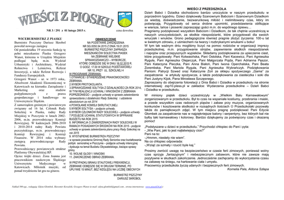 WIEŚCI Z PRZEDSZKOLA Dzień Babci i Dziadka obchodzono bardzo uroczyście w naszym przedszkolu w poprzednim tygodniu. Dzieci dziękowały Szanownym Babciom i Szanownym Dziadkom za wiedzę, doświadczenie, bezwarunkową miłość i nielimitowany czas, który im poświęcają. Przygotowały od serca drobne upominki, przedstawienia obfitujące w wiersze, tańce i piosenki zapraszając gości m.in. do wspólnego śpiewu… NR 3 / 291 z 01 lutego 2015 r. cena dowolna Pragniemy podziękować wszystkim Babciom i Dziadkom, że tak chętnie uczestniczą w naszych uroczystościach, za słodkie niespodzianki, które przygotowali dla swoich wnuczek i wnuków. Grono pedagogiczne również pragnie złożyć życzenia: 100-u lat WICEBURMISTRZ Z PIASKU OBWIESZCZENIE w świetnym zdrowiu, z uśmiechem na twarzy i rozbrykanymi wnukami u boku! Burmistrz Pszczyny Dariusz Skrobol NA PODSTAWIE ZARZĄDZENIA W tym tak ważnym dniu mogliśmy liczyć na pomoc rodziców w organizacji imprezy powołał nowego zastępcę NR SG.0050.54.2015 Z DNIA 19.01.2015 przedszkolnej, m.in. przygotowanie strojów, zapewnienie słodkich niespodzianek BURMISTRZ PSZCZYNY ZAPRASZA Od poniedziałku 19 stycznia funkcję tę i napojów oraz przepysznych wypieków. Składamy podziękowania za upieczenie ciast, MIESZKAŃCÓW SOŁECTWA PIASEK pełni mieszkaniec Piasku Grzegorz NA ZEBRANIE WIEJSKIE które przygotowały: Pani Kotwasińska, Pani Ostolska, Pani Kacewicz, Pani Agnieszka Wanot, któremu w Urzędzie Miejskim SPRAWOZDAWCZO – WYBORCZE, Ryguła, Pani Agnieszka Olejarczyk, Pani Małgorzata Pojda, Pani Adrianna Pęszor, podlegać będą m.in. Wydział KTÓRE ODBĘDZIE SIĘ W DNIU 16.02.2015 R. Pani Katarzyna Pieczka, Pani Anna Białoń, Pani Iwona Operchalska, Pani Beata Urbanistyki i Architektury, Wydział O GODZ. 17.00 W SZKOLE PODSTAWOWEJ Zorembska, Pani Mariola Ryguła, Pani Agnieszka Wybrańczyk. Podziękowania Rolnictwa i Leśnictwa, Referat NR 10, PRZY UL. SZKOLNEJ 4 Paniom: Patrycji Szwed oraz Katarzynie Zoń ze sklepu spożywczego „Gama” za Inwestycji, a także Referat Rozwoju i W PROGRAMIE ZEBRANIA: zaopatrzenie w artykuły spożywcze, a także podziękowania za ciasteczka i soki dla Funduszy Europejskich. 1.OTWARCIE I STWIERDZENIE PRAWOMOCNOŚCI Pani Justyny Kijok, Pana Mirosława Szczęsnego. Grzegorz Wanot – ur. w 1973 roku,. ZEBRANIA. Zapraszamy do obejrzenia fotorelacji z Dnia Babci i Dziadka w przedszkolu na stronie Absolwent Akademii Ekonomicznej w 2.WYBÓR PROTOKOLANTA. Katowicach na kierunku Zarządzanie i 3.SPRAWOZDANIE SOŁTYSA Z DZIAŁALNOŚCI ZA ROK 2014, internetowej: zsp10.pless.pl w zakładce: Wydarzenia przedszkolne – Dzień Babci i Dziadka w przedszkolu. Marketing oraz studiów W TYM REALIZACJI UCHWAŁ I WNIOSKÓW Z ZEBRANIA podyplomowych z prawa POPRZEDNIEGO – podjęcie uchwały w sprawie zatwierdzenia W miniony piątek dzieci uczestniczyły w „Wielkim Balu Karnawałowym” gospodarczego i handlowego na sprawozdania z działalności Rady Sołeckiej i udzielenie zorganizowanym w przedszkolu. Był to czas na wspaniałe kostiumy, przebrania i maski, Uniwersytecie Śląskim. absolutorium za rok 2014 a przede wszystkim czas radosnych pląsów i zabaw przy muzyce, organizowanych Z samorządem gminnym i powiatowym 4.POWOŁANIE KOMISJI SKRUTACYJNEJ. konkursów i kosztowanie słodkości w rozsądnych ilościach Przedszkolaki pozowały związany od 16 lat. Członek Rady 5.WYBÓR SOŁTYSA – podjęcie uchwały. także do pamiątkowych zdjęć. W tym miejscu pragnę podziękować Pani Edycie Sołeckiej w Piasku, radny Rady 6.WYBÓR CZŁONKÓW RADY SOŁECKIEJ – podjęcie uchwały. Głombek za zaopatrzenie nas w najpiękniejsze balony i serpentyny, bez których bal nie Miejskiej w Pszczynie w latach 2002- 7.PODJĘCIE UCHWAŁ STATUTOIWYCH W SPPRAWIE byłby taki karnawałowy i kolorowy. Bardzo dziękujemy za poświęcony czas i okazaną 2006, m.in. przewodniczący Komisji BUDŻETU NA ROK 2015 pomoc! 8. INFORMACJA O ZAMIERZENIACH RADY SOŁECKIEJ W Rewizyjnej. W kadencjach 2006-2010 i 2010-2014 radny Rady Powiatu RAMACH POSIADANYCH ŚRODKÓW NA ROK 2015 - podjęcie „Podsłyszane u dzieci w przedszkolu.” Przychodzi chłopiec do Pani i pyta: pszczyńskiego, m.in. przewodniczący uchwały w sprawie zatwierdzenia planu pracy Rady Sołeckiej na - „Wie Pani, jaki to jest najłatwiejszy cios?” Pani na to: Komisji Rewizyjnej i Komisji rok 2015 -„Hmmm, niestety nie wiem”. Finansów. W 2014 roku wybrany 9. WYSTĄPIENIE BURMISTRZA PSZCZYNY - w sprawie powołania Gminnej Rady Seniorów oraz kształtowania Na co chłopiec odpowiada: zastępcą przewodniczącego Rady polityki senioralnej w Pszczynie – podjęcie uchwały intencyjnej Powiatu. -„Wziąć za szmaty i rzucić byle kaj.” - dyskusja na temat Budżetu Obywatelskiego, bieżące sprawy Przewodniczący powiatowych struktur gminy Prosimy zwrócić uwagę na bezpieczeństwo w czasie ferii zimowych, ponieważ wolny Platformy Obywatelskiej RP. 10. WOLNE GŁOSY I WNIOSKI czas sprzyja „fantazyjnym” i niebezpiecznym zabawom, które nie zawsze mają Ojciec trójki dzieci. Żona Joanna jest 11. ZAKOŃCZENIE OBRAD ZEBRANIA. pozytywne w skutkach zakończenie. Jednocześnie zachęcamy do wykorzystania czasu pracownikiem naukowym Śląskiego na zabawę na śniegu, na hartowanie ciała i umysłu. W PRZYPADKU BRAKU STAUTOWEJ FREKWENCJI, Uniwersytetu Medycznego w Pracownicy przedszkola życzą udanych i bezpiecznych ferii zimowych. ZEBRANIE ODBĘDZIE SIĘ W DRUGIM TERMINIE, PO Katowicach. Miłośnik muzyki, od Kornelia Pala, Aldona Szłapa UPŁYWIE 15 MINUT, BEZ WZGLĘDU NA LICZBĘ OBECNYCH ponad trzydziestu lat gra na gitarze. BURMISTRZ PSZCZYNY DARIUSZ SKROBOL Nakład 500 egz., redagują: Edyta Głombek, Sławomir Kowalski, Grzegorz Wanot (e-mail: [email protected] , strona internetowa: www.piasek24.pl;) Najnowsze wieści ze szkoły 19 stycznia w szkole gościliśmy misjonarza z Etiopii. Nie mówił po polsku, więc potrzebowaliśmy tłumacza, którym był 