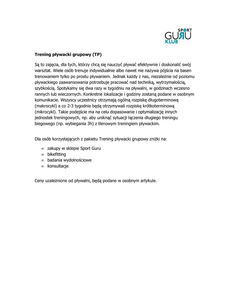 Trening pływacki grupowy (TP) Są to zajęcia, dla tych, którzy chcą się nauczyć pływać efektywnie i doskonalić swój warsztat. Wiele osób trenuje indywidualnie albo nawet nie nazywa pójścia na basen trenowaniem tylko po prostu pływaniem. Jednak kaŜdy z nas, niezaleŜnie od poziomu pływackiego zaawansowania potrzebuje pracować nad techniką, wytrzymałością, szybkością. Spotykamy się dwa razy w tygodniu na pływalni, w godzinach wczesno rannych lub wieczornych. Konkretne lokalizacje i godziny zostaną podane w osobnym komunikacie. Wszyscy uczestnicy otrzymają ogólną rozpiskę długoterminową (makrocykl) a co 2-3 tygodnie będą otrzymywali rozpiskę krótkoterminową (mikrocykl). Takie podejście ma na celu dopasowanie i optymalizację innych jednostek treningowych, np. aby uniknąć sytuacji łączenia długiego treningu biegowego (np. wybiegania 3h) z tlenowym treningiem pływackim. Dla osób korzystających z pakietu Trening pływacki grupowy zniŜki na: • • • • zakupy w sklepie Sport Guru bikefitting badania wydolnościowe konsultacje Ceny uzaleŜnione od pływalni, będą podane w osobnym artykule.