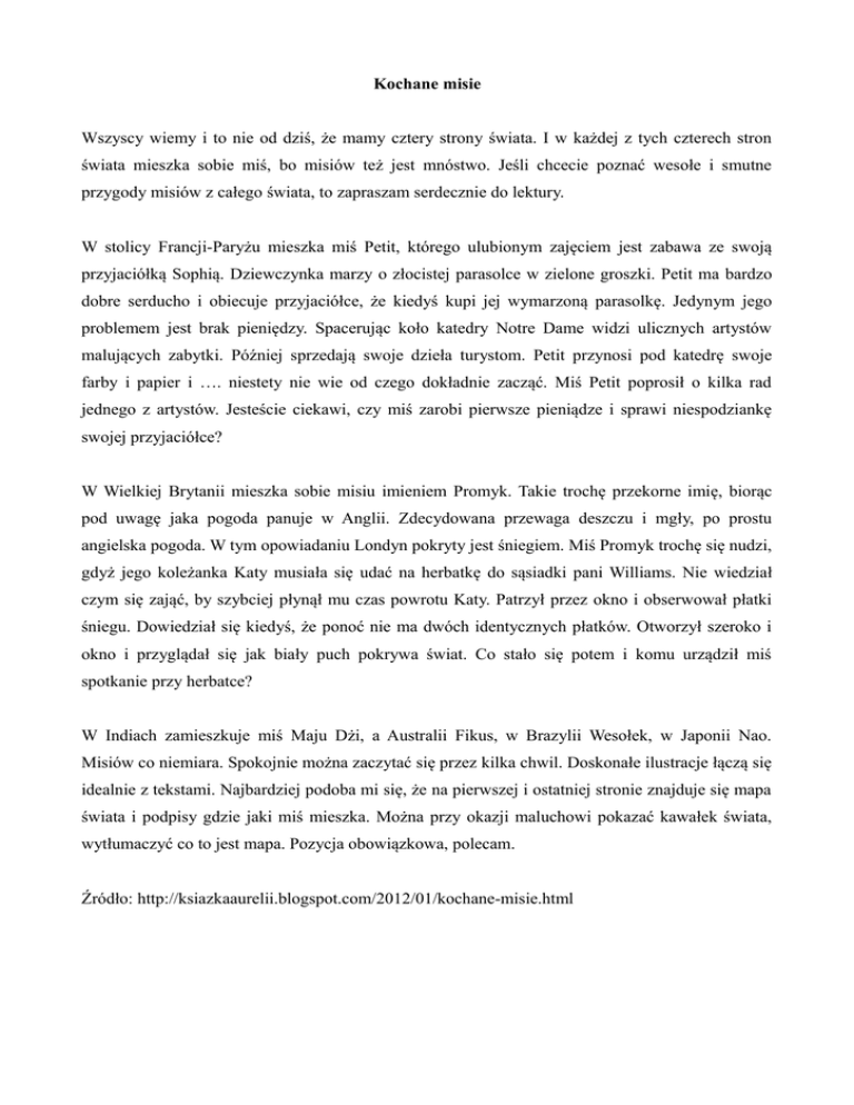 Kochane misie Wszyscy wiemy i to nie od dziś, że mamy cztery strony świata. I w każdej z tych czterech stron świata mieszka sobie miś, bo misiów też jest mnóstwo. Jeśli chcecie poznać wesołe i smutne przygody misiów z całego świata, to zapraszam serdecznie do lektury. W stolicy Francji-Paryżu mieszka miś Petit, którego ulubionym zajęciem jest zabawa ze swoją przyjaciółką Sophią. Dziewczynka marzy o złocistej parasolce w zielone groszki. Petit ma bardzo dobre serducho i obiecuje przyjaciółce, że kiedyś kupi jej wymarzoną parasolkę. Jedynym jego problemem jest brak pieniędzy. Spacerując koło katedry Notre Dame widzi ulicznych artystów malujących zabytki. Później sprzedają swoje dzieła turystom. Petit przynosi pod katedrę swoje farby i papier i …. niestety nie wie od czego dokładnie zacząć. Miś Petit poprosił o kilka rad jednego z artystów. Jesteście ciekawi, czy miś zarobi pierwsze pieniądze i sprawi niespodziankę swojej przyjaciółce? W Wielkiej Brytanii mieszka sobie misiu imieniem Promyk. Takie trochę przekorne imię, biorąc pod uwagę jaka pogoda panuje w Anglii. Zdecydowana przewaga deszczu i mgły, po prostu angielska pogoda. W tym opowiadaniu Londyn pokryty jest śniegiem. Miś Promyk trochę się nudzi, gdyż jego koleżanka Katy musiała się udać na herbatkę do sąsiadki pani Williams. Nie wiedział czym się zająć, by szybciej płynął mu czas powrotu Katy. Patrzył przez okno i obserwował płatki śniegu. Dowiedział się kiedyś, że ponoć nie ma dwóch identycznych płatków. Otworzył szeroko i okno i przyglądał się jak biały puch pokrywa świat. Co stało się potem i komu urządził miś spotkanie przy herbatce? W Indiach zamieszkuje miś Maju Dżi, a Australii Fikus, w Brazylii Wesołek, w Japonii Nao. Misiów co niemiara. Spokojnie można zaczytać się przez kilka chwil. Doskonałe ilustracje łączą się idealnie z tekstami. Najbardziej podoba mi się, że na pierwszej i ostatniej stronie znajduje się mapa świata i podpisy gdzie jaki miś mieszka. Można przy okazji maluchowi pokazać kawałek świata, wytłumaczyć co to jest mapa. Pozycja obowiązkowa, polecam. Źródło: http://ksiazkaaurelii.blogspot.com/2012/01/kochane-misie.html