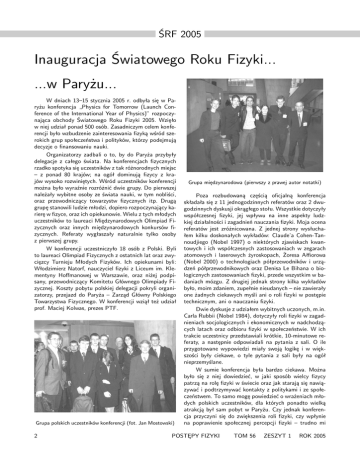 ŚRF 2005 Inauguracja Światowego Roku Fizyki... ...w Paryżu... W dniach 13–15 stycznia 2005 r. odbyła się w Paryżu konferencja „Physics for Tomorrow (Launch Conference of the International Year of Physics)” rozpoczynająca obchody Światowego Roku Fizyki 2005. Wzięło w niej udział ponad 500 osób. Zasadniczym celem konferencji było wzbudzenie zainteresowania fizyką wśród szerokich grup społeczeństwa i polityków, którzy podejmują decyzje o finansowaniu nauki. Organizatorzy zadbali o to, by do Paryża przybyły delegacje z całego świata. Na konferencjach fizycznych rzadko spotyka się uczestników z tak różnorodnych miejsc – z ponad 80 krajów; na ogół dominują fizycy z krajów wysoko rozwiniętych. Wśród uczestników konferencji można było wyraźnie rozróżnić dwie grupy. Do pierwszej należały wybitne osoby ze świata nauki, w tym nobliści, oraz przewodniczący towarzystw fizycznych itp. Drugą grupę stanowili ludzie młodzi, dopiero rozpoczynający karierę w fizyce, oraz ich opiekunowie. Wielu z tych młodych uczestników to laureaci Międzynarodowych Olimpiad Fizycznych oraz innych międzynarodowych konkursów fizycznych. Referaty wygłaszały naturalnie tylko osoby z pierwszej grupy. W konferencji uczestniczyło 18 osób z Polski. Byli to laureaci Olimpiad Fizycznych z ostatnich lat oraz zwycięzcy Turnieju Młodych Fizyków. Ich opiekunami byli: Włodzimierz Natorf, nauczyciel fizyki z Liceum im. Klementyny Hoffmanowej w Warszawie, oraz niżej podpisany, przewodniczący Komitetu Głównego Olimpiady Fizycznej. Koszty pobytu polskiej delegacji pokryli organizatorzy, przejazd do Paryża – Zarząd Główny Polskiego Towarzystwa Fizycznego. W konferencji wziął też udział prof. Maciej Kolwas, prezes PTF. Grupa polskich uczestników konferencji (fot. Jan Mostowski) 2 Grupa międzynarodowa (pierwszy z prawej autor notatki) Poza rozbudowaną częścią oficjalną konferencja składała się z 11 jednogodzinnych referatów oraz 2 dwugodzinnych dyskusji okrągłego stołu. Wszystkie dotyczyły współczesnej fizyki, jej wpływu na inne aspekty ludzkiej działalności i zagadnień nauczania fizyki. Moja ocena referatów jest zróżnicowana. Z jednej strony wysłuchałem kilku doskonałych wykładów: Claude’a Cohen-Tannoudjiego (Nobel 1997) o niektórych zjawiskach kwantowych i ich współczesnych zastosowaniach w zegarach atomowych i laserowych żyroskopach, Żoresa Ałfiorowa (Nobel 2000) o technologiach półprzewodników i urządzeń półprzewodnikowych oraz Denisa Le Bihana o biologicznych zastosowaniach fizyki, przede wszystkim w badaniach mózgu. Z drugiej jednak strony kilka wykładów było, moim zdaniem, zupełnie nieudanych – nie zawierały one żadnych ciekawych myśli ani o roli fizyki w postępie technicznym, ani o nauczaniu fizyki. Dwie dyskusje z udziałem wybitnych uczonych, m.in. Carla Rubbii (Nobel 1984), dotyczyły roli fizyki w zagadnieniach socjologicznych i ekonomicznych w nadchodzących latach oraz odbioru fizyki w społeczeństwie. W ich trakcie uczestnicy przedstawiali krótkie, 10-minutowe referaty, a następnie odpowiadali na pytania z sali. O ile przygotowane wypowiedzi miały swoją logikę i w większości były ciekawe, o tyle pytania z sali były na ogół nieprzemyślane. W sumie konferencja była bardzo ciekawa. Można było się z niej dowiedzieć, w jaki sposób wielcy fizycy patrzą na rolę fizyki w świecie oraz jak starają się nawiązywać i podtrzymywać kontakty z politykami i ze społeczeństwem. To samo mogę powiedzieć o wrażeniach młodych polskich uczestników, dla których ponadto wielką atrakcją był sam pobyt w Paryżu. Czy jednak konferencja przyczyni się do zwiększenia roli fizyki, czy wpłynie na poprawienie społecznej percepcji fizyki – trudno mi POSTĘPY FIZYKI TOM 56 ZESZYT 1 ROK 2005 Światowy Rok Fizyki 2005 ocenić. Nie jestem też w stanie określić, czy argumenty używane przez uczestników trafiły do świadomości polityków i czy dotrą do szerokich grup społeczeństwa. Szczegółowe informacje o konferencji i dalsze zdjęcia wykonane podczas jej trwania można znaleźć na stronie www.wyp2005.org/unesco/. Jan Mostowski Instytut Fizyki PAN oraz Uniwersytet Kardynała Stefana Wyszyńskiego Warszawa ...i Warszawie Fizycy z całej Polski powitali Nowy Rok 2005 na uroczystym balu sylwestrowym, który odbył się w pięknej Auli Wydziału Fizyki Politechniki Warszawskiej. Bal otworzył JM Rektor PW, prof. dr hab. inż. Stanisław Mańkowski, witając wszystkich gości, po czym tradycyjnym polonezem rozpoczął sylwestrową zabawę. Dziesięć minut przed północą prezes Polskiego Towarzystwa Fizycznego, prof. Maciej Kolwas, w krótkich słowach zapowiedział otwarcie Światowego Roku Fizyki 2005 w Polsce, a jego uroczystej inauguracji dokonał prof. Martin C.E. Huber, prezes Europejskiego Towarzystwa Fizycznego (EPS). Bal uświetnili swym udziałem także: minister edukacji narodowej i sportu Mirosław Sawicki, prezes elekt EPS Ove Poulsen (Dania) oraz władze Wydziału i Uczelni. Po otwarciu Światowego Roku Fizyki rozpoczęły się pokazy laserowe, które przeniosły uczestników w inny wymiar. Zabawa trwała do rana. Inauguracja ŚRF w Polsce: Maciej Kolwas i Martin Huber (fot. Marek Barwiński) Goście balu: prezes elekt EPS Ove Poulsen, były prezes PTF Ireneusz Strzałkowski, prezes EPS Martin Huber i minister edukacji narodowej i sportu Mirosław Sawicki (fot. Maciej Kolwas) Jan Grabski Wydział Fizyki Politechnika Warszawska W tanecznym korowodzie (fot. Stefania Elbanowska) Otwarcie balu: JM Rektor PW prof. Stanisław Mańkowski i dziekan Wydziału Fizyki PW prof. Franciszek Krok (fot. Marek Barwiński) POSTĘPY FIZYKI TOM 56 ZESZYT 1 Liczne kolorowe fotografie, oddające atmosferę czwartego z kolei sylwestrowego Balu u Fizyków, tak jak poprzednie perfekcyjnie zorganizowanego przez dra Jana Grabskiego, ich inicjatora, można obejrzeć na stronie ilf.if.pw.edu