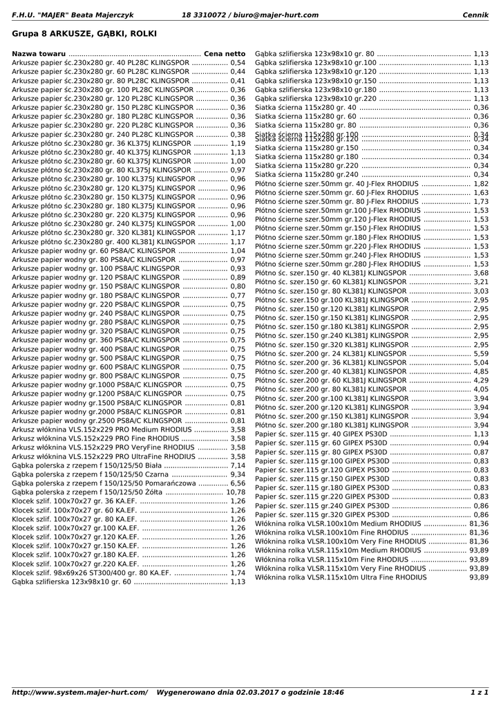 F.H.U. "MAJER" Beata Majerczyk 18 3310072 / [email protected] Cennik Grupa 8 ARKUSZE, GĄBKI, ROLKI Nazwa towaru .............................................................. Cena netto Arkusze papier śc.230x280 gr. 40 PL28C KLINGSPOR ................. 0,54 Arkusze papier śc.230x280 gr. 60 PL28C KLINGSPOR ................. 0,44 Arkusze papier śc.230x280 gr. 80 PL28C KLINGSPOR ................. 0,41 Arkusze papier śc.230x280 gr. 100 PL28C KLINGSPOR ............... 0,36 Arkusze papier śc.230x280 gr. 120 PL28C KLINGSPOR ............... 0,36 Arkusze papier śc.230x280 gr. 150 PL28C KLINGSPOR ............... 0,36 Arkusze papier śc.230x280 gr. 180 PL28C KLINGSPOR ............... 0,36 Arkusze papier śc.230x280 gr. 220 PL28C KLINGSPOR ............... 0,36 Arkusze papier śc.230x280 gr. 240 PL28C KLINGSPOR ............... 0,38 Arkusze płótno śc.230x280 gr. 36 KL375J KLINGSPOR ................ 1,19 Arkusze płótno śc.230x280 gr. 40 KL375J KLINGSPOR ................ 1,13 Arkusze płótno śc.230x280 gr. 60 KL375J KLINGSPOR ................ 1,00 Arkusze płótno śc.230x280 gr. 80 KL375J KLINGSPOR ................ 0,97 Arkusze płótno śc.230x280 gr. 100 KL375J KLINGSPOR .............. 0,96 Arkusze płótno śc.230x280 gr. 120 KL375J KLINGSPOR .............. 0,96 Arkusze płótno śc.230x280 gr. 150 KL375J KLINGSPOR .............. 0,96 Arkusze płótno śc.230x280 gr. 180 KL375J KLINGSPOR .............. 0,96 Arkusze płótno śc.230x280 gr. 220 KL375J KLINGSPOR .............. 0,96 Arkusze płótno śc.230x280 gr. 240 KL375J KLINGSPOR .............. 1,00 Arkusze płótno śc.230x280 gr. 320 KL381J KLINGSPOR .............. 1,17 Arkusze płótno śc.230x280 gr. 400 KL381J KLINGSPOR .............. 1,17 Arkusze papier wodny gr. 60 PS8A/C KLINGSPOR ....................... 1,04 Arkusze papier wodny gr. 80 PS8A/C KLINGSPOR ....................... 0,97 Arkusze papier wodny gr. 100 PS8A/C KLINGSPOR ..................... 0,93 Arkusze papier wodny gr. 120 PS8A/C KLINGSPOR ..................... 0,89 Arkusze papier wodny gr. 150 PS8A/C KLINGSPOR ..................... 0,80 Arkusze papier wodny gr. 180 PS8A/C KLINGSPOR ..................... 0,77 Arkusze papier wodny gr. 220 PS8A/C KLINGSPOR ..................... 0,75 Arkusze papier wodny gr. 240 PS8A/C KLINGSPOR ..................... 0,75 Arkusze papier wodny gr. 280 PS8A/C KLINGSPOR ..................... 0,75 Arkusze papier wodny gr. 320 PS8A/C KLINGSPOR ..................... 0,75 Arkusze papier wodny gr. 360 PS8A/C KLINGSPOR ..................... 0,75 Arkusze papier wodny gr. 400 PS8A/C KLINGSPOR ..................... 0,75 Arkusze papier wodny gr. 500 PS8A/C KLINGSPOR ..................... 0,75 Arkusze papier wodny gr. 600 PS8A/C KLINGSPOR ..................... 0,75 Arkusze papier wodny gr. 800 PS8A/C KLINGSPOR ..................... 0,75 Arkusze papier wodny gr.1000 PS8A/C KLINGSPOR .................... 0,75 Arkusze papier wodny gr.1200 PS8A/C KLINGSPOR .................... 0,75 Arkusze papier wodny gr.1500 PS8A/C KLINGSPOR .................... 0,81 Arkusze papier wodny gr.2000 PS8A/C KLINGSPOR .................... 0,81 Arkusze papier wodny gr.2500 PS8A/C KLINGSPOR .................... 0,81 Arkusz włóknina VLS.152x229 PRO Medium RHODIUS ................ 3,58 Arkusz włóknina VLS.152x229 PRO Fine RHODIUS ...................... 3,58 Arkusz włóknina VLS.152x229 PRO VeryFine RHODIUS .............. 3,58 Arkusz włóknina VLS.152x229 PRO UltraFine RHODIUS .............. 3,58 Gąbka polerska z rzepem f 150/125/50 Biała .............................. 7,14 Gąbka polerska z rzepem f 150/125/50 Czarna .......................... 9,34 Gąbka polerska z rzepem f 150/125/50 Pomarańczowa .............. 6,56 Gąbka polerska z rzepem f 150/125/50 Żółta ........................... 10,78 Klocek szlif. 100x70x27 gr. 36 KA.EF. ......................................... 1,26 Klocek szlif. 100x70x27 gr. 60 KA.EF. ......................................... 1,26 Klocek szlif. 100x70x27 gr. 80 KA.EF. ......................................... 1,26 Klocek szlif. 100x70x27 gr.100 KA.EF. ........................................ 1,26 Klocek szlif. 100x70x27 gr.120 KA.EF. ........................................ 1,26 Klocek szlif. 100x70x27 gr.150 KA.EF. ........................................ 1,26 Klocek szlif. 100x70x27 gr.180 KA.EF. ........................................ 1,26 Klocek szlif. 100x70x27 gr.220 KA.EF. ........................................ 1,26 Klocek szlif. 98x69x26 ST300/400 gr. 80 KA.EF. ......................... 1,74 Gąbka szlifierska 123x98x10 gr. 60 ............................................ 1,13 http://www.system.majer-hurt.com/ Gąbka szlifierska 123x98x10 gr. 80 ............................................ 1,13 Gąbka szlifierska 123x98x10 gr.100 ........................................... 1,13 Gąbka szlifierska 123x98x10 gr.120 ........................................... 1,13 Gąbka szlifierska 123x98x10 gr.150 ........................................... 1,13 Gąbka szlifierska 123x98x10 gr.180 ........................................... 1,13 Gąbka szlifierska 123x98x10 gr.220 ........................................... 1,13 Siatka ścierna 115x280 gr. 40 .................................................... 0,36 Siatka ścierna 115x280 gr. 60 .................................................... 0,36 Siatka ścierna 115x280 gr. 80 .................................................... 0,36 Siatka ścierna 115x280 gr.100 ................................................... 0,34 Siatka ścierna 115x280 gr.120 ................................................... 0,34 Siatka ścierna 115x280 gr.150 ................................................... 0,34 Siatka ścierna 115x280 gr.180 ................................................... 0,34 Siatka ścierna 115x280 gr.220 ................................................... 0,34 Siatka ścierna 115x280 gr.240 ................................................... 0,34 Płótno ścierne szer.50mm gr. 40