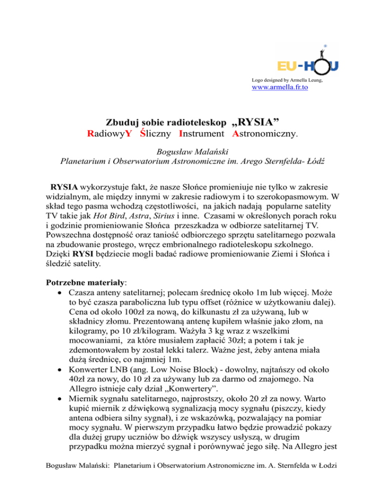 Logo designed by Armella Leung, www.armella.fr.to Zbuduj sobie radioteleskop „RYSIA” RadiowyY Śliczny Instrument Astronomiczny. Bogusław Malański Planetarium i Obserwatorium Astronomiczne im. Arego Sternfelda- Łódź RYSIA wykorzystuje fakt, że nasze Słońce promieniuje nie tylko w zakresie widzialnym, ale między innymi w zakresie radiowym i to szerokopasmowym. W skład tego pasma wchodzą częstotliwości, na jakich nadają popularne satelity TV takie jak Hot Bird, Astra, Sirius i inne. Czasami w określonych porach roku i godzinie promieniowanie Słońca przeszkadza w odbiorze satelitarnej TV. Powszechna dostępność oraz taniość odbiorczego sprzętu satelitarnego pozwala na zbudowanie prostego, wręcz embrionalnego radioteleskopu szkolnego. Dzięki RYSI będziecie mogli badać radiowe promieniowanie Ziemi i Słońca i śledzić satelity. Potrzebne materiały: • Czasza anteny satelitarnej; polecam średnicę około 1m lub więcej. Może to być czasza paraboliczna lub typu offset (różnice w użytkowaniu dalej). Cena od około 100zł za nową, do kilkunastu zł za używaną, lub w składnicy złomu. Prezentowaną antenę kupiłem właśnie jako złom, na kilogramy, po 10 zł/kilogram. Ważyła 3 kg wraz z wszelkimi mocowaniami, za które musiałem zapłacić 30zł; a potem i tak je zdemontowałem by został lekki talerz. Ważne jest, żeby antena miała dużą średnicę, co najmniej 1m. • Konwerter LNB (ang. Low Noise Block) - dowolny, najtańszy od około 40zł za nowy, do 10 zł za używany lub za darmo od znajomego. Na Allegro istnieje cały dział „Konwertery”. • Miernik sygnału satelitarnego, najprostszy, około 20 zł za nowy. Warto kupić miernik z dźwiękową sygnalizacją mocy sygnału (piszczy, kiedy antena odbiera silny sygnał), i ze wskazówką, pozwalający na pomiar mocy sygnału. W pierwszym przypadku łatwo będzie prowadzić pokazy dla dużej grupy uczniów bo dźwięk wszyscy usłyszą, w drugim przypadku można mierzyć sygnał i porównywać jego siłę. Na Allegro jest Bogusław Malański: Planetarium i Obserwatorium Astronomiczne im. A. Sternfelda w Łodzi specjalny dział, „Mierniki, wzmacniacze sygnału”. Bajery, takie jak pomiar polaryzacji czy identyfikacja satelity, nie są potrzebne. • Drobiazgi typu: około 3m koncentrycznego przewodu antenowego za 5 zł, końcówki łączące, albo jak mówią fachowcy – konektory, 3 szt. Po 60 gr/sztukę. • Zasilanie 12V do 18V napięcia stałego (zastosowałem akumulator żelowy 12V, którego w pracowni używam do innych celów), można wykorzystać zwykłe baterie (polecam jednak alkaliczne), łącząc je szeregowo. Konstrukcja radioteleskopu: Chodzi o złożenie wszystkich elementów w sposób widoczny na zdjęciach poniżej. Odbiornik LNB montujemy na ramieniu anteny. Kabel prowadzimy do miernika satelitarnego, który zasilany jest z akumulatora. Nie jest nawet wymagane lutowanie; końcówki łączące nakręca się na przewód antenowy. Bogusław Malański: Planetarium i Obserwatorium Astronomiczne im. A. Sternfelda w Łodzi Ja usunąłem wszelkie elementy mocujące antenę zostawiając sam talerz gdyż zależało mi na lekkiej i łatwej do przewożenia konstrukcji. Jeżeli ktoś chce mieć instrument stacjonarny to warto jest zamontować antenę na podstawie umożliwiającej obrót w azymucie oraz w wysokości Słońca nad horyzontem. Wersja luksusowa może mieć napęd podążający za Słońcem (nie takie trudne ale znacznie podnosi koszt wykonania RYSI). W tym przypadku można się pokusić o automatyczne rejestrowanie natężenia sygnału radiowego ze Słońca i powiązać go jakoś z aktywnością radiową dzienną Słońca lub z danymi na stronie http://www.pta.edu.pl/orion/sun/aktualne.html . Użytkowanie: RYSIĘ można wykorzystać do pokazania uczniom, że Słońce promieniuje również na falach radiowych. Już sam ten pokaz usprawiedliwia budowę radioteleskopu, ale to nie wszystko, co potrafi RYSIA. RYSIA umożliwia znalezienie pozycji Słońca w pochmurny dzień, co wzbudza zainteresowanie uczestników zajęć. Nie mniejsze zdziwienie wzbudza fakt, że RYSIA wykaże promieniowanie powierzchni Ziemi, wystarczy ją w tym kierunku pochylić. Można także przy pomocy RYSI znajdować położenie satelitów, szukając ich na przykład w kierunku prostopadłym do pozycji Słońca na niebie, tak żeby sygnał na pewno nie pochodził ze Słońca. Bogusław Malański: Planetarium i Obserwatorium Astronomiczne im. A. Sternfelda w Łodzi Poniższe zdjęcie pokazuje RYSIĘ w czasie pracy w pochmurny dzień. Tak kierujemy antenę w kierunku Słońca by usłyszeć (można również zobaczyć na mierniku) maksimum odbieranego sygnału. To właściwie wszystko. Reszta zależy od pomysłowości użytkowników RYSI . Wszelkie udoskonalenia techniczne RYSI, jak i jej wykorzystanie są mile widziane. UWAGI 1. Jeżeli użyjemy anteny parabolicznej, to jej oś celuje bezpośrednio w obiekt . W przypadku użycia anteny offsetowej należy uwzględnić jej offset. Producent prawie nigdy offsetu nie podaje, ale łatwo jest go zmierzyć (dodatkowe ćwiczenie dla uczniów w czasie konstruowania radioteleskopu). W praktyce kierunek wysięgnika, na którym zamontowany jest konwerter LNB wskazuje na kierunek odbieranego sygnału; w naszym przypadku Słońce. Położenie to Bogusław Malański: Planetarium i Obserwatorium Astronomiczne im. A. Sternfelda w Łodzi można znaleźć w słoneczny dzień pochylając w kierunku ziemi tak długo, aż cień konwertera LNB zniknie na krawędzi anteny. Na zdjęciu widać jak można zmierzyć deklinację (kąt na zdjęciu) Słońca przy pomocy RYSI w pochmurny dzień (w słoneczny również) – zdjęcie wykonano 10 grudnia 2011. Bogusław Malański: Planetarium i Obserwatorium Astronomiczne im. A. Sternfelda w Łodzi 2. Słońce dwa razy w ciągu roku świeci nad równikiem (w okolicach równonocy wiosennej i jesiennej). Wtedy pozycja geostacjonarnego satel