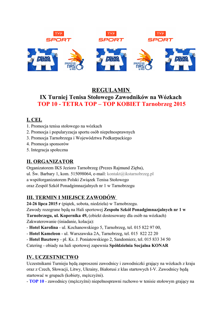 REGULAMIN IX Turniej Tenisa Stołowego Zawodników na Wózkach TOP 10 - TETRA TOP – TOP KOBIET Tarnobrzeg 2015 I. CEL 1. Promocja tenisa stołowego na wózkach 2. Promocja i popularyzacja sportu osób niepełnosprawnych 3. Promocja Tarnobrzega i Województwa Podkarpackiego 4. Promocja sponsorów 5. Integracja społeczna II. ORGANIZATOR Organizatorem IKS Jezioro Tarnobrzeg (Prezes Rajmund Zięba), ul. Św. Barbary 1, kom. 515098064, e-mail: [email protected] a współorganizatorem Polski Związek Tenisa Stołowego oraz Zespół Szkół Ponadgimnazjalnych nr 1 w Tarnobrzegu III. TERMIN I MIEJSCE ZAWODÓW 24-26 lipca 2015 r (piątek, sobota, niedziela) w Tarnobrzegu. Zawody rozegrane będą na Hali sportowej Zespołu Szkół Ponadgimnazjalnych nr 1 w Tarnobrzegu, ul. Kopernika 49, (obiekt dostosowany dla osób na wózkach) Zakwaterowanie (śniadanie, kolacja): - Hotel Karolina - ul. Kochanowskiego 5, Tarnobrzeg, tel. 015 822 97 00, - Hotel Kameleon - ul. Warszawska 2A, Tarnobrzeg, tel. 015 822 22 20 - Hotel Basztowy - pl. Ks. J. Poniatowskiego 2, Sandomierz, tel. 015 833 34 50 Catering - obiady na hali sportowej zapewnia Spółdzielnia Socjalna KONAR IV. UCZESTNICTWO Uczestnikami Turnieju będą zaproszeni zawodnicy i zawodniczki grający na wózkach z kraju oraz z Czech, Słowacji, Litwy, Ukrainy, Białorusi z klas startowych I-V. Zawodnicy będą startować w grupach (kobiety, mężczyźni). - TOP 10 - zawodnicy (mężczyźni) niepełnosprawni ruchowo w tenisie stołowym grający na wózkach klasa startowa 3, 4, 5, - TETRA TOP - zawodnicy (mężczyźni) niepełnosprawni ruchowo w tenisie stołowym grający na wózkach klasa startowa 1, 2 - (grający min. z przybandażowaną rakietką) - TOP KOBIET - zawodniczki niepełnosprawne ruchowo w tenisie stołowym grające na wózkach klasa startowa 1, 2, 3, 4, 5 Warunkiem dopuszczenia zawodników do startu jest posiadanie: - ważnej książeczki zdrowia (ważne 6 m-cy) - przepisowy strój i sprzęt sportowy - wpłata przez zawodnika startowego (wpisowego) - 20 zł V. SPOSÓB PRZEPROWADZENIA ZAWODÓW 1. Zawody zostaną przeprowadzone zgodnie z przepisami PZTS z uwzględnieniem specyfiki sportu niepełnosprawnych oraz przepisami międzynarodowymi ITTF Para Table Tennis 2. System rozgrywek: - dwa turnieje indywidualne TOP 10 i TETRA TOP – podział na grupy - turniej indywidualny TOP KOBIET - „każdy z każdym” 3. Wszystkie spotkania rozgrywane będą do trzech wygranych setów. 4. O kolejności miejsc decydować będzie: - ilość zwycięstw - w przypadku takiej samej ilości zwycięstw, wynik bezpośredniego meczu między zainteresowanymi ( przy dwóch zawodnikach), - natomiast, jeżeli więcej niż dwóch, w dalszej kolejności stosunek setów, ewentualnie piłek. 5. Mecze rozgrywane będą na 6 stołach SPONETA S7-13 i 2 stołach Andro z atestem ITTF, piłeczkami (białymi) Andro*** (plastikowe) VI. NAGRODY. Za zdobycie 5 pierwszych miejsc w trzech turniejach indywidualnych przyznawane będą: I miejsce - puchar, dyplom, nagroda rzeczowa II miejsce - puchar, dyplom, nagroda rzeczowa III miejsce - puchar, dyplom, nagroda rzeczowa IV miejsce – dyplom, nagroda rzeczowa V miejsce – dyplom, nagroda rzeczowa Za zdobycie 5 pierwszych miejsc w trzech turniejach indywidualnych przyznawane będą: 1 miejsce - 500 zł 2 miejsce - 300 zł 3 miejsce - 200 zł 4 miejsce - 100 zł 5 miejsce - 50 zł VII. KOMISJA SĘDZIOWSKA. Skład komisji sędziowskiej turnieju: - sędzia główny - Henryk Oleksiuk (sędzia państwowy) - sędzia - Janusz Malarz - organizator – Rajmund Zięba VIII. ZASADY FINANSOWANIA. Koszty związane z organizacją turnieju oraz koszty pobytu zawodników pokrywa organizator, sponsorzy. Koszty przejazdu na zawody uczestnicy pokrywają we własnym zakresie. IX. OPIEKA MEDYCZNA. Opiekę lekarską (medyczną) zapewnia organizator. Rajmund Zięba Prezes IKS Jezioro Tarnobrzeg