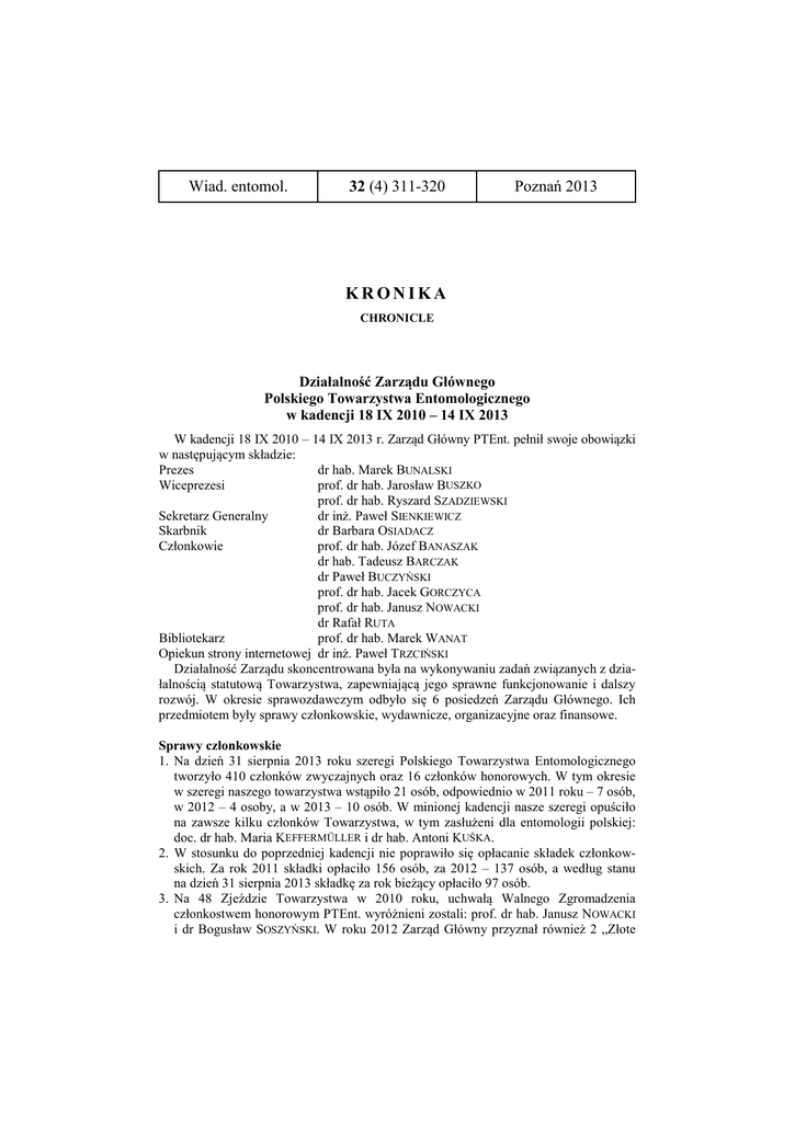 Wiad. entomol. 32 (4) 311-320 Poznań 2013 KRONIKA CHRONICLE Działalność Zarządu Głównego Polskiego Towarzystwa Entomologicznego w kadencji 18 IX 2010 – 14 IX 2013 W kadencji 18 IX 2010 – 14 IX 2013 r. Zarząd Główny PTEnt. pełnił swoje obowiązki w następującym składzie: Prezes dr hab. Marek BUNALSKI Wiceprezesi prof. dr hab. Jarosław BUSZKO prof. dr hab. Ryszard SZADZIEWSKI Sekretarz Generalny dr inż. Paweł SIENKIEWICZ Skarbnik dr Barbara OSIADACZ Członkowie prof. dr hab. Józef BANASZAK dr hab. Tadeusz BARCZAK dr Paweł BUCZYŃSKI prof. dr hab. Jacek GORCZYCA prof. dr hab. Janusz NOWACKI dr Rafał RUTA Bibliotekarz prof. dr hab. Marek WANAT Opiekun strony internetowej dr inż. Paweł TRZCIŃSKI Działalność Zarządu skoncentrowana była na wykonywaniu zadań związanych z działalnością statutową Towarzystwa, zapewniającą jego sprawne funkcjonowanie i dalszy rozwój. W okresie sprawozdawczym odbyło się 6 posiedzeń Zarządu Głównego. Ich przedmiotem były sprawy członkowskie, wydawnicze, organizacyjne oraz finansowe. Sprawy członkowskie 1. Na dzień 31 sierpnia 2013 roku szeregi Polskiego Towarzystwa Entomologicznego tworzyło 410 członków zwyczajnych oraz 16 członków honorowych. W tym okresie w szeregi naszego towarzystwa wstąpiło 21 osób, odpowiednio w 2011 roku – 7 osób, w 2012 – 4 osoby, a w 2013 – 10 osób. W minionej kadencji nasze szeregi opuściło na zawsze kilku członków Towarzystwa, w tym zasłużeni dla entomologii polskiej: doc. dr hab. Maria KEFFERMÜLLER i dr hab. Antoni KUŚKA. 2. W stosunku do poprzedniej kadencji nie poprawiło się opłacanie składek członkowskich. Za rok 2011 składki opłaciło 156 osób, za 2012 – 137 osób, a według stanu na dzień 31 sierpnia 2013 składkę za rok bieżący opłaciło 97 osób. 3. Na 48 Zjeździe Towarzystwa w 2010 roku, uchwałą Walnego Zgromadzenia członkostwem honorowym PTEnt. wyróżnieni zostali: prof. dr hab. Janusz NOWACKI i dr Bogusław SOSZYŃSKI. W roku 2012 Zarząd Główny przyznał również 2 „Złote 312 WIAD. ENTOMOL., 32 (4): POZNAŃ 2013 – KRONIKA odznaki” dla osób zasłużonych dla Towarzystwa, tj. dr hab. Janusza SAWONIEWICZA i mgr inż. Zbigniewa SZELĄGA. Działalność wydawnicza Towarzystwa Polskie Towarzystwo Entomologiczne jest obecnie wydawcą i właścicielem 4 wydawnictw. Są to 2 kwartalniki: „Polish Journal of Entomology / Polskie Pismo Entomologiczne” i „Wiadomości Entomologiczne / Entomological News” oraz 2 wydawnictwa ciągłe: „Klucze do Oznaczania Owadów Polski” i „Polish Entomological Monographs”. 1. „Polish Journal of Entomology / Polskie Pismo Entomologiczne” – kwartalnik ukazujący się od 1922 roku, w okresie sprawozdawczym ukazały się 3 tomy: 80 (2011), 81 (2012) i 82 (2013). Podkreślić należy, że dzięki staraniom redakcji „Pisma” kierowanej przez prof. dr hab. Ryszarda SZADZIEWSKIEGO, każdy z trzech tomów liczy po cztery odrębne zeszyty, a rocznik 2011 osiągnął bodaj największą w historii objętość 800 stron. W roku 2011 wprowadziliśmy czasopismo na platformę internetową Versita, a publikowane artykuły otrzymały oznaczenia w systemie DOI. 2. Działania związane z uregulowaniem statusu prawnego „Wiadomości Entomologicznych” stanowiły pierwsze poważne wyzwanie dla nowo wybranych władz Towarzystwa. W listopadzie 2010, czyli 2 miesiące po poprzednim Zjeździe PTEnt. syndyk masy upadłościowej PAN w Warszawie zwrócił się do Prezesa Towarzystwa o wyjaśnienie, kto jest wydawcą ww. czasopisma. Okazało się, że założyciel i pierwszy redaktor „Wiadomości”, prof. Henryk SANDNER, rejestrując nowy tytuł podał jako wydawcę Polską Akademię Nauk (przypomnijmy, iż w świetle obowiązujących wówczas przepisów prawa towarzystwa naukowe nie posiadały osobowości prawnej i finansowanie ich wydawnictw odbywało się za pośrednictwem PAN). Z chwilą ustanowienia syndyka masy upadłościowej PAN pojawiła się problem natury prawnej, polegający na tym, iż zarejestrowany wydawca tytułu, tj. PAN, nie był w stanie udokumentować wydania żadnego tomu ww. czasopisma. W odpowiedzi na list syndyka, Prezes PTEnt. wyjaśnił rzeczywistą sytuację tytułu i wystąpił do Sądu Rejestrowego w Warszawie o przekazanie tytułu rzeczywistemu wydawcy, jakim od początku ukazywania się czasopisma było Polskie Towarzystwo Entomologiczne. Na drugim posiedzeniu w tej sprawie usunięto z Rejestru wpis o dotychczasowym wydawcy i przekazano sprawę do Sądu Administracyjnego w Poznaniu, który po jej rozpoznaniu, postanowieniem z dnia 8 września 2011 r. uznał Polskie Towarzystwo Entomologiczne za prawowitego właściciela i wydawcę Wiadomości Entomologicznych, wpisując czasopismo do rejestru wydawnictw. Przypomnijmy, iż Wiadomości Entomologiczne ukazują się od 1980 roku i zaistniała sytuacja, w której Towarzystwo przez ponad 30 lat nie było prawnym właścicielem tytułu, stanowiła spore zaskoczenie dla wszystkich. W okresie sprawozdawczym ukazały się 3 tomy WE: 30 (2011), 31 (2012) i 32 (2013). Podkreślić należy, że dzięki wytężonej pracy redakcji Wiadomości kierowanej przez dr hab. Marka BUNALSKIEGO, każdy z trzech tomów liczy po cztery odrębne zeszyty. Podsumowując dokonania redakcji obydwu czasopism należy podkreślić, iż w okresie od początku 2011 r. do końca 2013 r. wydamy łącznie po 12 zeszytów obu czasopism o łącznej objętości ponad 2320 stron. WIAD. ENTOMOL., 32 (4): POZNAŃ 2013 – KRONIKA 313 Za sukces należy również uznać płynność wydawniczą czasopism, dzięki której ukazują się one bez większych opóźnień. 3. Klucze do oznaczania owadów Polski – wydawnictwo ciągłe ukazujące się od 1954 roku. W minionej kadencji funkcję Redaktora Naczelnego wydawnictwa sprawował prof. dr hab. Dariusz TARNAWSKI. W okresie 2011–2013 ukazały się 2 zeszyty Kluczy: – zeszyt 177 (2011): Ochotkowate – Chironomidae, aut
