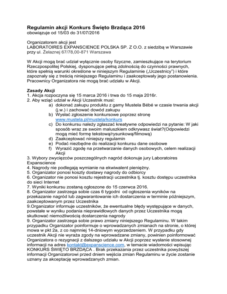 Regulamin akcji Konkurs Święto Brzdąca 2016 obowiązuje od 15/03 do 31/07/2016 Organizatorem akcji jest LABORATOIRES EXPANSCIENCE POLSKA SP. Z O.O. z siedzibą w Warszawie przy ul. Żelaznej 67/78,00-871 Warszawa W Akcji mogą brać udział wyłącznie osoby fizyczne, zamieszkujące na terytorium Rzeczpospolitej Polskiej, dysponujące pełną zdolnością do czynności prawnych, które spełnią warunki określone w niniejszym Regulaminie („Uczestnicy”) i które zapoznały się z treścią niniejszego Regulaminu i zaakceptowały jego postanowienia. Pracownicy Organizatora nie mogą brać udziału w Akcji. Zasady Akcji 1. Akcja rozpoczyna się 15 marca 2016 i trwa do 15 maja 2016r. 2. Aby wziąć udział w Akcji Uczestnik musi: a) dokonać zakupu produktu z gamy Mustela Bébé w czasie trwania akcji (j.w.) i zachować dowód zakupu b) Wysłać zgłoszenie konkursowe poprzez stronę www.mustela.pl/mustela/konkurs c) Do konkursu należy zgłaszać kreatywne odpowiedzi na pytanie: W jaki sposób wraz ze swoim maluszkiem odkrywasz świat?(Odpowiedzi mogą mieć formę tekstową/rysunkową/filmową) d) Zaakceptować niniejszy regulamin e) Podać niezbędne do realizacji konkursu dane osobowe f) Wyrazić zgodę na przetwarzanie danych osobowych, celem realizacji Akcji 3. Wybory zwycięzców poszczególnych nagród dokonuje jury Laboratoires Expanscience 4. Nagrody nie podlegają wymianie na ekwiwalent pieniężny. 5. Organizator ponosi koszty dostawy nagrody do odbiorcy 6. Organizator nie ponosi kosztu rejestracji uczestnika tj. kosztu dostępu uczestnika do sieci Internet 7. Wyniki konkursu zostaną ogłoszone do 15 czerwca 2016. 8. Organizator zastrzega sobie czas 6 tygodni od ogłoszenia wyników na przekazanie nagród lub zagwarantowanie ich dostarczenia w terminie późniejszym, zaakceptowanym przez Uczestnika 9.Organizator informuje uczestników, że ewentualne błędy występujące w danych, powstałe w wyniku podania nieprawidłowych danych przez Uczestnika mogą skutkować niemożliwością dostarczenia nagrody 9. Organizator zastrzega sobie prawo zmiany niniejszego Regulaminu. W takim przypadku Organizator poinformuje o wprowadzanych zmianach na stronie, o której mowa w pkt 2a, z co najmniej 14-dniowym wyprzedzeniem. W przypadku gdy uczestnik Akcji nie wyraża zgody na wprowadzane zmiany, powinien poinformować Organizatora o rezygnacji z dalszego udziału w Akcji poprzez wysłanie stosownej informacji na adres [email protected], w temacie wiadomości wpisując KONKURS ŚWIĘTO BRZDĄCA . Brak przekazania przez uczestnika powyższej informacji Organizatorowi przed dniem wejścia zmian Regulaminu w życie zostanie uznany za akceptację wprowadzanych zmian. 10. Nagrody przekazywane w akcji przeznaczone są wyłącznie do osobistego użytku uczestnika, nie podlegają odsprzedaży osobom trzecim, jak również nie ma możliwości przekazania praw do nagrody osobom trzecim. Dane osobowe 1. Administratorem danych osobowych uczestników Akcji jest LABORATOIRES EXPANSCIENCE POLSKA SP. Z O.O. z siedzibą w Warszawie przy ul. Żelaznej 67/78,00-871 Warszawa. 2. Dane osobowe podawane są dobrowolnie, ale ich niepodanie uniemożliwia wzięcie udziału w Akcji. 3. Uczestnik Akcji ma prawo dostępu do swoich danych i ich poprawiania. 4. Dane osobowe, podane w zgłoszeniu, są zbierane i zostaną wykorzystane jedynie w celu przekazania nagród do wybranych uczestników, lub jeśli Uczestnik wyrazi zgodę, również do przesyłania informacji handlowych drogą elektroniczną. 5. W przypadku złożenia reklamacji, dane osobowe podane przez osobę zgłaszającą zostaną wykorzystane w celu jej rozpatrzenia. Reklamacje 1. Uczestnikom Akcji przysługuje prawo składania reklamacji w czasie trwania Akcji lub po jej zakończeniu, jednak nie później niż w terminie 30 dni od zakończenia Akcji. 2. Reklamacje należy zgłaszać drogą elektroniczną na adres [email protected] 3. Reklamacja powinna zawierać imię i nazwisko oraz adres osoby składającej reklamację oraz opis przyczyn reklamacji wraz z oczekiwanym sposobem jej rozpatrzenia. 4. Reklamacje będą rozpatrywane przez Organizatora w terminie 14 dni od daty ich otrzymania. O decyzji Organizatora Uczestnik zostanie poinformowany pocztą elektroniczną na adres podany w reklamacji. Postanowienia końcowe 1. Niniejszy regulamin dostępny jest na stronie www.mustela.pl/mustela/konkurs oraz w wersji papierowej w siedzibie Organizatora. Załącznik 1. Lista nagród w konkursie Akcji Święto Brzdąca 2016 NAGRODA I : Roczny zapas kosmetyków Mustela Bébé , o wartości 500 zł brutto (1 uczestnik) NAGRODA II : Sesja zdjęciowa maluszka, o wartości 300 zł brutto (3 uczestników) NAGRODA III : Mustela Bébé Olejek pielęgnacyjny do masażu 110ml, wartość ok 42 zł brutto (10 uczestników) NAGRODA IV : Gadżet Miś Musti pluszowy (dla 50 uczestników)
