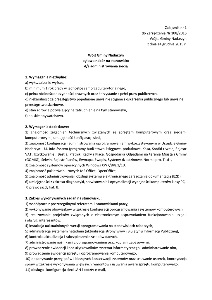Załącznik nr 1 do Zarządzenia Nr 108/2015 Wójta Gminy Nadarzyn z dnia 14 grudnia 2015 r. Wójt Gminy Nadarzyn ogłasza nabór na stanowisko d/s administrowania siecią 1. Wymagania niezbędne: a) wykształcenie wyższe, b) minimum 1 rok pracy w jednostce samorządu terytorialnego, c) pełna zdolność do czynności prawnych oraz korzystanie z pełni praw publicznych, d) niekaralność za przestępstwo popełnione umyślnie ścigane z oskarżenia publicznego lub umyślne przestępstwo skarbowe, e) stan zdrowia pozwalający na zatrudnienie na tym stanowisku, f) polskie obywatelstwo. 2. Wymagania dodatkowe: 1) znajomość zagadnień technicznych związanych ze sprzętem komputerowym oraz sieciami komputerowymi, umiejętność konfiguracji sieci, 2) znajomość konfiguracji i administrowania oprogramowaniem wykorzystywanym w Urzędzie Gminy Nadarzyn: U.I. Info-System (programy budżetowo-księgowe, podatkowe, Kasa, Środki trwałe, Rejestr VAT, Użytkowanie), Bestia, Płatnik, Kadry i Płace, Gospodarka Odpadami na terenie Miasta i Gminy (GOMIG), Selwin, Rejestr Planów, Ewmapa, Ewopis, Systemy dziedzinowe, Norma pro, Taxi+, 3) znajomość systemów operacyjnych Windows XP/7/8/8.1/10, 4) znajomość pakietów biurowych MS Office, OpenOffice, 5) znajomość administrowania i obsługi systemu elektronicznego zarządzania dokumentacją (EZD), 6) umiejętności z zakresu diagnostyki, serwisowania i optymalizacji wydajności komputerów klasy PC, 7) prawo jazdy kat. B. 3. Zakres wykonywanych zadań na stanowisku: 1) współpraca z poszczególnymi referatami i stanowiskami pracy, 2) wykonywanie obowiązków w zakresie konfiguracji oprogramowania i systemów komputerowych, 3) realizowanie projektów związanych z elektronicznym usprawnianiem funkcjonowania urzędu i obsługi interesantów, 4) instalacja uaktualnionych wersji oprogramowania na stanowiskach roboczych, 5) administracja systemem netadmin (aktualizacja strony www i Biuletynu Informacji Publicznej), 6) kontrola, aktualizacja i zabezpieczenie zasobów danych, 7) administrowanie nośnikami z oprogramowaniem oraz kopiami zapasowymi, 8) prowadzenie ewidencji kont użytkowników systemu informatycznego i administrowanie nim, 9) prowadzenie ewidencji sprzętu i oprogramowania komputerowego, 10) dokonywanie przeglądów i bieżących konserwacji systemów oraz usuwanie usterek, koordynacja spraw w zakresie wykonywania większych remontów i usuwania awarii sprzętu komputerowego, 11) obsługa i konfiguracja sieci LAN i poczty e-mail, 12) prowadzenie spraw z zakresu obsługi elektronicznej komunikacji z Głównym Urzędem Statystycznym, 13) nadzór nad prawidłowym funkcjonowaniem i eksploatacją elektronicznego obiegu dokumentów, rejestru planów, 14) nadzór nad wdrożeniem systemów dziedzinowych (Ewidencja Zezwoleń na Sprzedaż Alkoholi, Ewidencja Nieruchomości, Ewidencja Zabytków, Ewidencja zezwoleń na zajęcie pasa drogowego, Obsługa Pracy Rady, Obsługa Zamówień Publicznych), 15) opracowywanie i wdrażanie wzorów formularzy (e-PUAP, Wrota Mazowsza), 16) szkolenie osób w zakresie obsługi komputerów, 17) monitorowanie warunków środowiskowych w serwerowni, działania klimatyzatorów oraz dedykowanej sieci elektrycznej, 18) obsługa techniczna sesji Rady Gminy Nadarzyn, 19) obsługa techniczna w ramach utrzymania rezultatów Projektu POIG p.t. „Przeciwdziałanie wykluczeniu cyfrowemu w Gminie Nadarzyn” (dojazdy do beneficjentów projektu), 20) inne zadania wynikające z przepisów szczególnych lub zlecone przez Wójta, Zastępcę Wójta, Sekretarza Gminy. Uwagi: Znajomość konfiguracji i administrowania oprogramowaniem wymienionym w wymaganiach dodatkowych będzie weryfikowana przy stanowisku komputerowym. 4. Warunki pracy na stanowisku: praca przy komputerze. 5. Informacja o wskaźniku zatrudnienia osób niepełnosprawnych: W miesiącu poprzedzającym datę publikacji ogłoszenia wskaźnik zatrudnienia osób niepełnosprawnych w rozumieniu przepisów o rehabilitacji zawodowej i społecznej osób niepełnosprawnych jest niższy niż 6%. 6. Wymagane dokumenty i oświadczenia: 1) życiorys (CV), 2) list motywacyjny, 3) własnoręcznie potwierdzone za zgodność kserokopie dokumentów potwierdzających kwalifikacje, 4) własnoręcznie potwierdzone za zgodność kserokopie dokumentów poświadczających staż pracy, 5) oświadczenie o zdolności do czynności prawnych oraz o korzystaniu z pełni praw publicznych, 6) oświadczenie o niekaralności za przestępstwo popełnione umyślnie ścigane z oskarżenia publicznego lub umyślne przestępstwo skarbowe, 7) własnoręcznie potwierdzona za zgodność kserokopia dowodu osobistego albo oświadczenie o posiadaniu obywatelstwa polskiego, 8) oświadczenie o wyrażeniu zgody na przetwarzanie danych osobowych do celów rekrutacji, 9) aktualne zaświadczenie lekarskie o braku przeciwwskazań zdrowotnych do wykonywania pracy na w/w stanowisku /na zwykłym blankiecie/, 10) kopia dokumentu potwierdzającego niepełnosprawność w przypadku kandydata, który zamierza skorzystać z uprawnienia, o którym mowa w art. 13a ust. 2 ustawy z dnia 21 listopada 2008 r. o pracownikach samorządowych. Uwaga: Wszystkie oświadczenia mogą być sporządzone w formie jednego dokumentu. Wymagane dokumenty aplikacyjne wraz z adresem zwrotnym należy składać w siedzibie Urzędu Gminy Nadarzyn, ul. Mszczonowska 24, 05-830 Nadarzyn, Kancelaria pok. 100 z dopiskiem: dotyczy naboru na stanowisko ds. administrowania siecią w terminie do dnia 28.12.2015 r. do godziny 18.00. Aplikacje, które wpłyną do urzędu po upływie wyżej określonego terminu nie będą rozpatrywane. Informacji w sprawie naboru udziela Edyta Gawrońska - Sekretarz Gminy tel. 22-729 81 85 w. 104. Informacja o wyniku naboru będzie umieszczona na stronie internetowej BIP (www.bip.nadarzyn.pl) oraz na tablicy informacyjnej w siedzibie Urzędu.