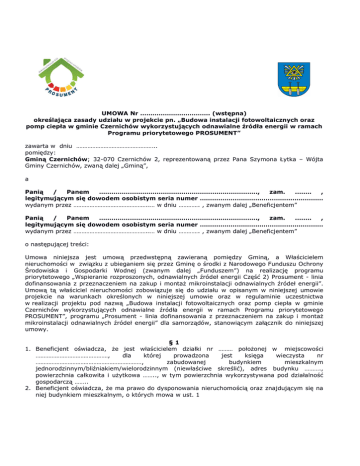 UMOWA Nr ……………………………. (wstępna) określająca zasady udziału w projekcie pn. „Budowa instalacji fotowoltaicznych oraz pomp ciepła w gminie Czernichów wykorzystujących odnawialne źródła energii w ramach Programu priorytetowego PROSUMENT” zawarta w dniu ………………………………………….. pomiędzy: Gminą Czernichów; 32-070 Czernichów 2, reprezentowaną przez Pana Szymona Łytka – Wójta Gminy Czernichów, zwaną dalej „Gminą”, a Panią / Panem ………………………………………………………………….., zam. .……. , legitymującym się dowodem osobistym seria numer …………………………………………………… wydanym przez ………………………………………..… w dniu …………. , zwanym dalej „Beneficjentem” Panią / Panem ………………………………………………………………….., zam. .……. , legitymującym się dowodem osobistym seria numer …………………………………………………… wydanym przez ………………………………………..… w dniu …………. , zwanym dalej „Beneficjentem” o następującej treści: Umowa niniejsza jest umową przedwstępną zawieraną pomiędzy Gminą, a Właścicielem nieruchomości w związku z ubieganiem się przez Gminę o środki z Narodowego Funduszu Ochrony Środowiska i Gospodarki Wodnej (zwanym dalej „Funduszem”) na realizację programu priorytetowego „Wspieranie rozproszonych, odnawialnych źródeł energii Część 2) Prosument - linia dofinansowania z przeznaczeniem na zakup i montaż mikroinstalacji odnawialnych źródeł energii”. Umową tą właściciel nieruchomości zobowiązuje się do udziału w opisanym w niniejszej umowie projekcie na warunkach określonych w niniejszej umowie oraz w regulaminie uczestnictwa w realizacji projektu pod nazwą „Budowa instalacji fotowoltaicznych oraz pomp ciepła w gminie Czernichów wykorzystujących odnawialne źródła energii w ramach Programu priorytetowego PROSUMENT”, programu „Prosument - linia dofinansowania z przeznaczeniem na zakup i montaż mikroinstalacji odnawialnych źródeł energii” dla samorządów, stanowiącym załącznik do niniejszej umowy. §1 1. Beneficjent oświadcza, że jest właścicielem działki nr ……… położonej w miejscowości ………………………………………, dla której prowadzona jest księga wieczysta nr …………………………………………………………, zabudowanej budynkiem mieszkalnym jednorodzinnym/bliźniakiem/wielorodzinnym (niewłaściwe skreślić), adres budynku ………., powierzchnia całkowita i użytkowa …….., w tym powierzchnia wykorzystywana pod działalność gospodarczą …….. 2. Beneficjent oświadcza, że ma prawo do dysponowania nieruchomością oraz znajdującym się na niej budynkiem mieszkalnym, o których mowa w ust. 1 §2 1. Beneficjent oświadcza, że zobowiązuje się dobrowolnie, w przypadku otrzymania przez Gminę dofinansowania, o który mowa w § 3 umowy , do realizacji wspólnie z Gminą projektu w ramach programu priorytetowego „Wspieranie rozproszonych, odnawialnych źródeł energii Część 2) Prosument - linia dofinansowania z przeznaczeniem na zakup i montaż mikroinstalacji odnawialnych źródeł energii” współfinansowanego ze środków Funduszu polegającego na wykonaniu na nieruchomości, o której mowa w § 1 w okresie ……………………. następującej instalacji: Instalacji fotowoltaicznej / pompy ciepła (odpowiednio skreślić) 2. Zobowiązując się do udziału w projekcie, o którym mowa w ust. 1 Beneficjent tym samym zobowiązuje się, w przypadku otrzymania przez Gminę dofinansowania, o którym mowa w § 3 umowy, do zawarcia z Gminą Czernichów umowy na realizację wspólnie z Gminą projektu, o którym mowa w § 2 ust. 1 na warunkach określonych w niniejszej umowie oraz regulaminie uczestnictwa w realizacji projektu pod nazwą „Budowa instalacji fotowoltaicznych oraz pomp ciepła w gminie Czernichów wykorzystujących odnawialne źródła energii w ramach Programu priorytetowego PROSUMENT”, programu „Prosument - linia dofinansowania z przeznaczeniem na zakup i montaż mikroinstalacji odnawialnych źródeł energii” dla samorządów, stanowiącym załącznik do niniejszej umowy, w której w szczególności zobowiąże się do: 1) udostępnienia nieruchomości, w tym budynku mieszkalnego, o których mowa w § 1 na czas przeprowadzenia prac przygotowawczych oraz na czas realizacji projektu, a następnie na czas przeprowadzania kontroli instalacji w okresie trwałości projektu, w terminach wskazanych przez Gminę, 2) partycypowania w kosztach realizacji projektu w części przypadającej na Właściciela nieruchomości, poprzez zapłatę różnicy pomiędzy wydatkiem poniesionym przez Gminę na realizację projektu opisanego w § 2 ust. 1, a kwotą dofinansowania inwestycji w formie dotacji uzyskanej z Funduszu na cel opisany w § 2 ust. 1, która wyniesie umowy do 40% kosztów kwalifikowanych dla instalacji fotowoltaicznej lub do 20% kosztów kwalifikowalnych dla pompy ciepła, (szacunkowe koszty realizacji projektu określone zostały w Regulaminie i we wniosku stanowiącym załącznik nr 1 do niniejszej umowy, ostateczny koszt realizacji projektu ustalony zostanie po przeprowadzeniu postępowania o udzielenie zamówienia publicznego na wykonanie projektu), 3) do wniesienia na rzecz Gminy wkładu własnego w wysokości określonej w § 2 umowy stanowiącego co najmniej 60% dla instalacji fotowoltaicznej lub co najmniej 80% w przypadku pompy ciepła - kosztów projektu w terminie do 30 dni od dnia zawiadomienia Beneficjenta o realizacji zadania. Kwota partycypacji Beneficjenta w kosztach realizacji inwestycji może zostać, na pisemny wniosek Właściciela nieruchomości, rozłożona na raty na okres maksymalnie 10 lat (Beneficjent ma do wyboru okres spłaty: 2 lat, 5 lat