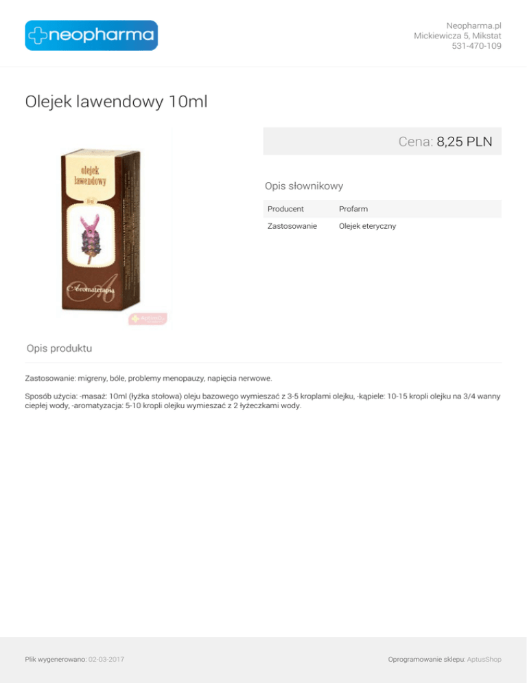 Neopharma.pl Mickiewicza 5, Mikstat 531-470-109 Olejek lawendowy 10ml Cena: 8,25 PLN Opis słownikowy Producent Profarm Zastosowanie Olejek eteryczny Opis produktu Zastosowanie: migreny, bóle, problemy menopauzy, napięcia nerwowe. Sposób użycia: -masaż: 10ml (łyżka stołowa) oleju bazowego wymieszać z 3-5 kroplami olejku, -kąpiele: 10-15 kropli olejku na 3/4 wanny ciepłej wody, -aromatyzacja: 5-10 kropli olejku wymieszać z 2 łyżeczkami wody. Plik wygenerowano: 02-03-2017 Powered by TCPDF (www.tcpdf.org) Oprogramowanie sklepu: AptusShop