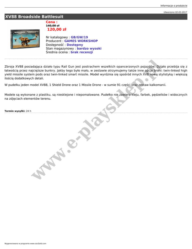 Informacje o produkcie Utworzono 02-03-2017 XV88 Broadside Battlesuit Cena : 140,00 zł 120,00 zł Nr katalogowy : GB/GW/19 Producent : GAMES WORKSHOP Dostępność : Dostępny Stan magazynowy : bardzo wysoki Średnia ocena : brak recenzji p. pl Zbroja XV88 posiadająca działo typu Rail Gun jest postrachem wszelkich opancerzonych pojazdów. Działo przebija się z łatwością przez najcięższe bunkry. Jakby tego było mało, w zestawie otrzymujemy także inne opcje broni: twin-linked high yield missile system pods oraz twin-linked smart missile. Model wyróżnia się spośród innych XV8 nową stylistyką i większą ilością dodatkowych detali. ay sk le W pudełku jeden model XV88, 1 Shield Drone oraz 1 Missile Drone - w sumie 91 części oraz zestaw kalkomanii. Modele są wykonane z plastiku, są niesklejone i niepomalowane. Pudełko nie zawiera kleju, farbek, pędzelków i widocznych na zdjęciach elementów terenu. w w w .e - pl Termin wysyłki: 24 h Wygenerowano w programie www.oscGold.com