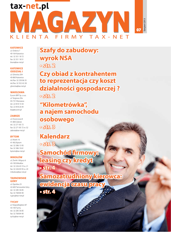K L I E N T A KATOWICE ul. Ordona 7 40-164 Katowice tel.: 32 351 18 72 fax: 32 351 18 51 [email protected] KATOWICE ODDZIAŁ I ul. Gliwicka 204 40-860 Katowice tel./fax: 32 250 06 35 tel./fax: 32 352 42 28 [email protected] WARSZAWA Euroin BRP Sp. z o.o. ul. Targowa 20a 03-731 Warszawa tel.: 22 818 14 44 fax: 22 818 26 44 [email protected] zabrze ul. Dworcowa 8 41-800 Zabrze tel.: 32 271 85 72 fax: 32 271 85 72 w. 52 [email protected] bytom ul. Miarki 16 41-902 Bytom tel.: 32 386 13 95 fax: 32 386 10 61 [email protected] mikołów ul. Żwirki i Wigury 6 43-190 Mikołów tel.: 32 226 43 19 w. 21 fax: 32 226 03 93 w. 24 [email protected] tarnowskie góry ul. Opolska 23 42-600 Tarnowskie Góry tel.: 32 285 36 85 fax: 32 768 84 40 [email protected] tychy al. Niepodległości 87 43-100 Tychy tel.: 32 285 36 85 fax: 32 768 84 40 [email protected] F I R M Y T A X - N E T Szafy do zabudowy: wyrok NSA • str. 2 Czy obiad z kontrahentem to reprezentacja czy koszt działalności gospodarczej ? • str. 2 “Kilometrówka”, a najem samochodu osobowego • str. 3 Kalendarz • str. 3 Samochód firmowy: leasing czy kredyt • str. 4 Samozatrudniony kierowca: ewidencja czasu pracy • str. 4 Sierpień 2013 07 Szafy do zabudowy Zamieszanie jakie spowodowały wydawane przez Min. Fin. interpretacje indywidualne, jak również orzeczenia Sądów Administracyjnych zapadłe po zmianie przepisów w styczniu 2011 roku, były jaskrawym przykładem braku stabilności prawa. Wydaje się że po dwóch latach okres niepewności mamy już za sobą i przedsiębiorcy z branży meblarskiej (a także ich klienci, którzy takie usługi będą nabywać) mogą odetchnąć z ulgą. Najnowsza uchwała NSA w składzie siedmiu sędziów, w sprawie stawki VAT na zabudowę na wymiar (I FPS 2/13) jest jedynym słusznym i korzystnym rozstrzygnięciem. Dotychczas stosowano trzy różne oceny montażu zabudowy meblowej dla celów ustawy VAT. Raz traktowano ją jako usługę modernizacji i wówczas podatnik miał prawo do zastosowania 8% stawki VAT, w kolejnym przypadku, i to było stanowisko reprezentowane głownie w interpretacjach organów podatkowych, traktowano to jako innego rodzaju usługi opodatkowane podstawową stawka VAT czyli 23%. Natomiast w trzecim przypadku traktowano to jako dostawę towaru i oczywiście również jak w drugim przypadku stawka obowiązująca VAT było 23%. Wyrok wydany przez NSA w składzie siedmiu sędziów jednoznacznie określa iż usługi związane z wykonywaniem trwałej zabudowy meblowej są usługami modernizacji, a co za tym idzie jest możliwość Firmy które do tej pory naliczały 23 procent VAT do zabudowy na wymiar, będą mogły odzyskać nadpłacony podatek. stosowania obniżonej 8% stawki VAT. Sąd dokonał jednak pewnego ograniczenia, a mianowicie wskazał, że taka stawka może obowiązywać tylko w przypadku gdy zabudowa meblowa jest trwale przymocowana do elementów konstrukcyjnych budynku lub jego części i ma miejsce w obiektach budowlanych zaliczanych do budownictwa objętego społecznym programem mieszkaniowym. Budownictwem społecznym ustawodawca objął co do zasady mieszkania o powierzchni użytkowej do 150 mkw i domy do 300 mkw. Powyżej tego metrażu zabudowa opodatkowana jest podstawową 23-procentową stawką VAT. W sporach z fiskusem do tej pory nikt nie zwracał uwagi na ten problem, a koncentrowano się głównie na tym czy od 1 stycznia 2011 roku w ogóle dopuszcza się stosowanie obniżonej stawki na zabudowę na wymiar. Dziś problem staje się aktualny, dlatego firmy, które zajmują się zabudową na wymiar musza brać pod uwagę także metraż którego dotyczy zamówienie Minister Finansów twierdzi, że nie może obecnie ustosunkować się do problemu ponieważ nie zostało opublikowane jeszcze uzasadnienie do uchwały NSA, które jest niezbędne do jej właściwego zrozumienia. Czy obiad z kontrahentem to reprezentacja czy koszt działalności gospodarczej ? Fiskus od lat kwestionował uznanie posiłku z kontrahentem za koszt uzyskania przychodu. Problem pojawił się w 2007 r. kiedy wprowadzono przepis, zgodnie z którym wydatków na reprezentację, w szczególności poniesionych na usługi gastronomiczne, zakup żywności oraz napojów, w tym alkoholowych, nie uznaje się za koszty uzyskania przychodów. W orzecznictwie przyjęło się, że reprezentacja to: okazałość, wystawność w czyimś sposobie życia, związana z pozycją, a więc wszelkie wydatki, które w sposób ponadstandardowy kreują pozytywny wizerunek firmy. Brak ustawowej definicji reprezentacji skutkował w uznawaniem wszystkich wydatków gastronomicznych przeznaczonych na posiłki z kontrahentami za niestanowiące kosztów podatkowych. Wyjątkiem był drobny poczęstunek złożony z herbatników i herbaty w siedzibie firmy. Natomiast wszystkie posiłki spożywane na mieście uznawane były za reprezentację. Warunek okazałości i wysta-wności bywał jednak względny, gdyż za reprezentację uznawano nawet posiłki w barach mlecznych, ponieważ miały świadczyć o oszczędności i zaradności podatnika. Kwestia ta budziła tak poważne wątpliwości, że została przedstawiona Naczelnemu Sądowi Administracyjnemu w celu wydania uchwały o sposobie interpretacji pojęcia reprezentacja. NSA odmówił jednak odpowiedzi, bowiem jego zdaniem nie da się w sposób ogólny wyjaśnić pojęcia interpretacji i każdy przypadek należy badać oddzielnie. W połowie czerwca 2013 r. NSA w wyroku uznał, że wydatki ponoszone na kolacje, obiady i lunche z kontrahentami, w siedzibie firmy oraz w lokalach gastronomicznych, odbywają się w celach biznesowych, a nie w celu okazania przepychu lub wytworności. Zdaniem NSA posiłki te towarzyszyły czynnościom związanym z zawieraniem kontraktów, które skutkowały osiąganiem przychodów przez podatnika, a więc mogły generalnie zostać uznane za koszty podatkowe. Następnie sąd rozpatrzył czy stanowią koszty Grażyna Nelip Doradca podatkowy 